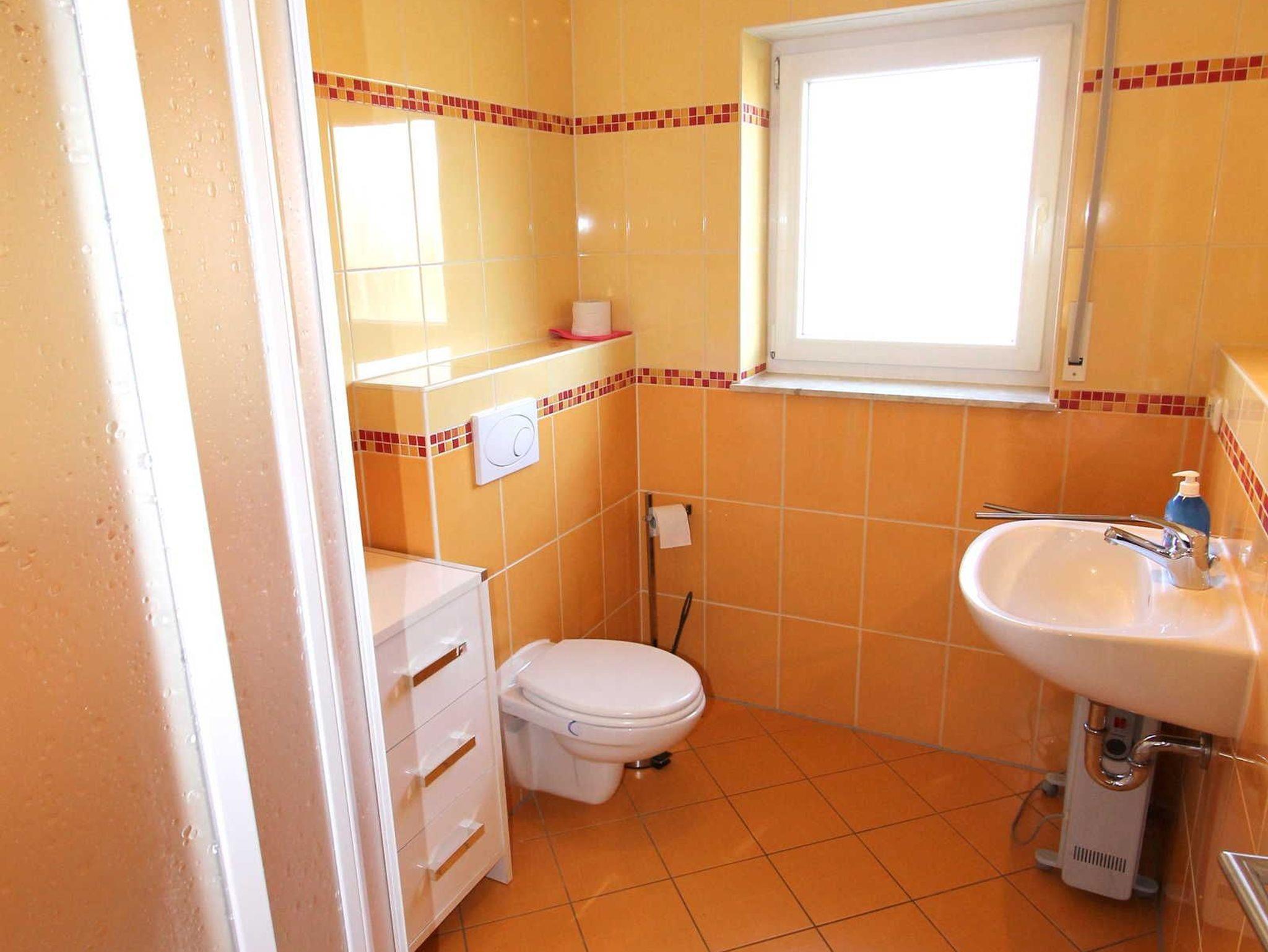 Das Badezimmer ist mit Dusche und WC ausgestattet.