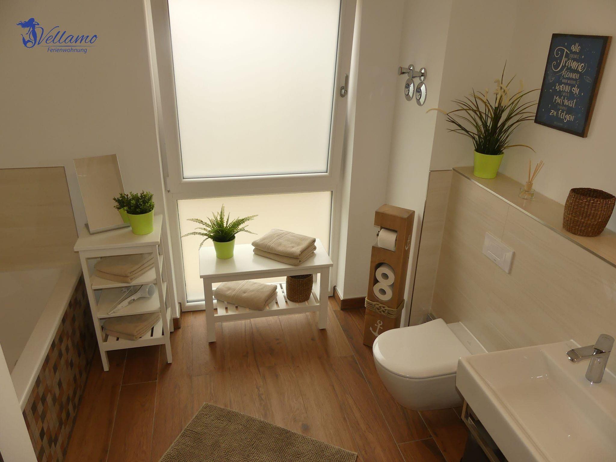 Die Ferienwohnung Vellamo bietet modernsten Ansprüchen Raum. Sie hat einen großzügigen Wohn-Essbereich mit voll ausgestatteter Einbauküche. Unseren Gästen stehen 2 Schlafzimmer zur Verfügung. Im 1. SZ steht ein Doppelbett mit einer Liegefläche von 180 x200 cm. Im 2. SZ finden Sie ein Familienbett mit einer Breite von 270 cm , welches 3 Personen ausreichend Platz bietet. Das Bad ist ausgestattet mit Dusche, Badewanne und einer Waschmaschine für die Wäsche zwischendurch. Kostenloses WLAN und Netflix Zugang steht Ihnen zur Verfügung. Zur Wohnung gehört ein extrabreiter Stellplatz mit Ladestation. Unsere Gäste laden ihr Elektroauto hier kostenfrei.