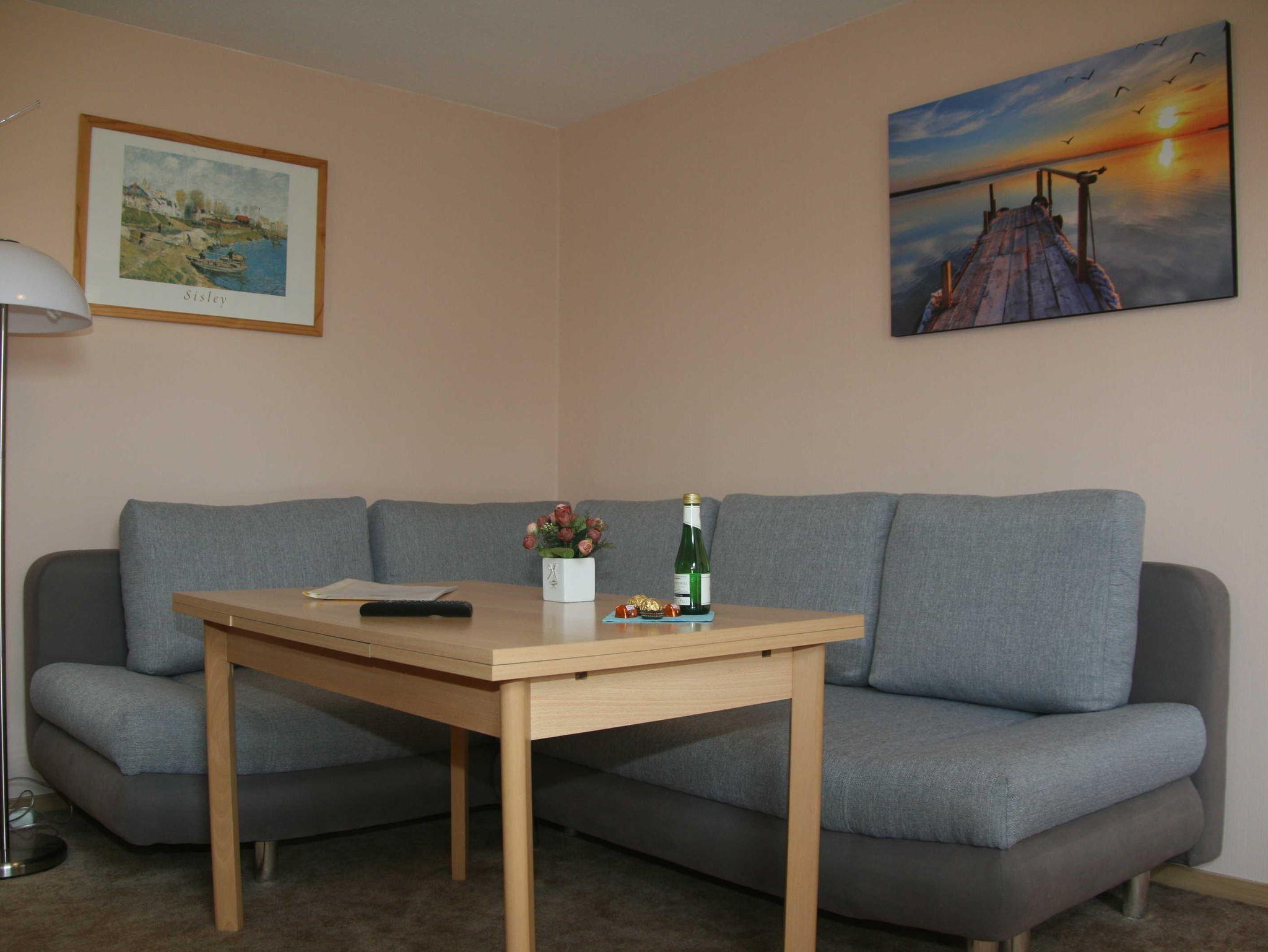 Wohnraum mit Sitzecke, Schlafraum 1 mit Doppelbett für 2 Personen (2 Polsterbetten), Schlafraum 2 mit Einzelbett (Polsterbett). Küchenzeile mit 2-Kochfelder-Herd (Ceran), Toaster, Kaffeemaschine, Wasserkocher, DU/ WC, TV, Radio.