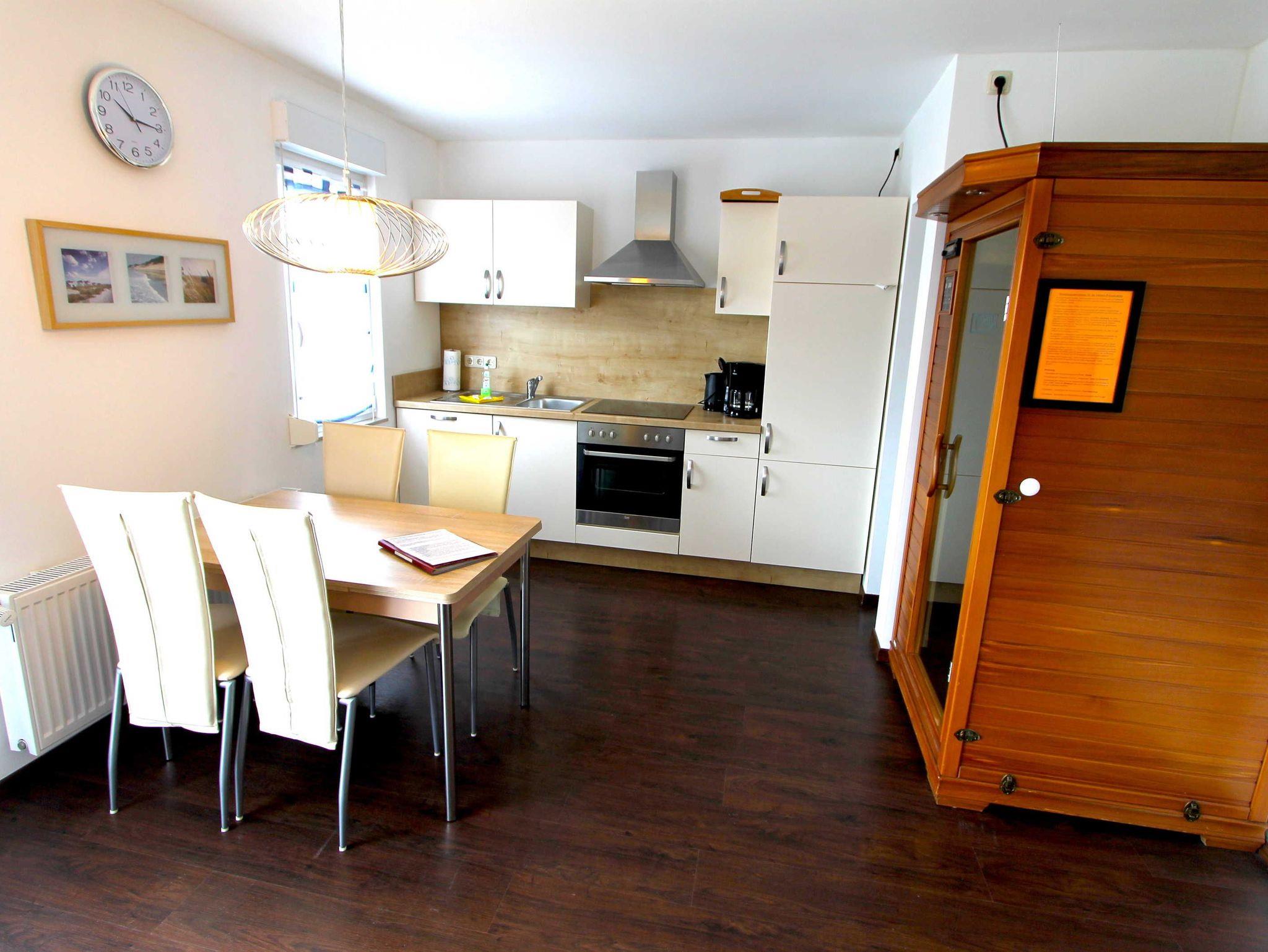Sie verfügt über ein geräumiges Wohnzimmer mit Schlafcouch und Sat.-TV, einer eingebauten, hochwertigen Küche sowie einer Infrarot-Wärmekabine für zwei Personen.
