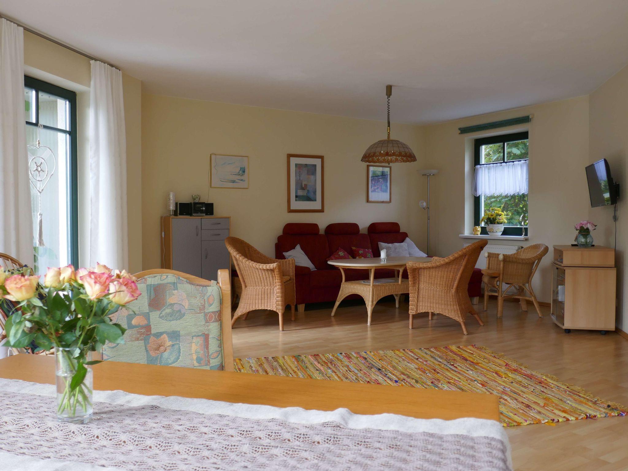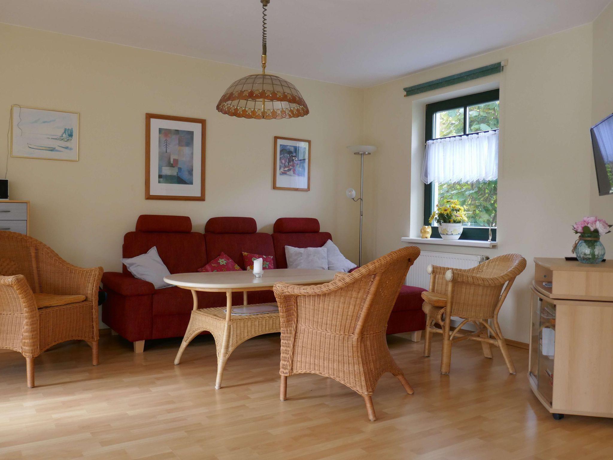 Im Erdgeschoss befindet sich das geräumige Wohnzimmer mit einem sehr schönen Essbereich in einem Halbrund aus Fenstern, so dass viel Licht die Sinne erfreut. Und sollte es wirklich einmal regnen, haben sie im Sitzbereich den Raum zum Nichtstun, Lesen oder was sie auch immer mögen. Ein Fernseher mit SAT-Anschluss sowie eine Stereoanlage mit CD-Player steht Ihnen ebenfalls zur Verfügung. Natürlich haben Sie überall im Haus WLAN-Verbindung.