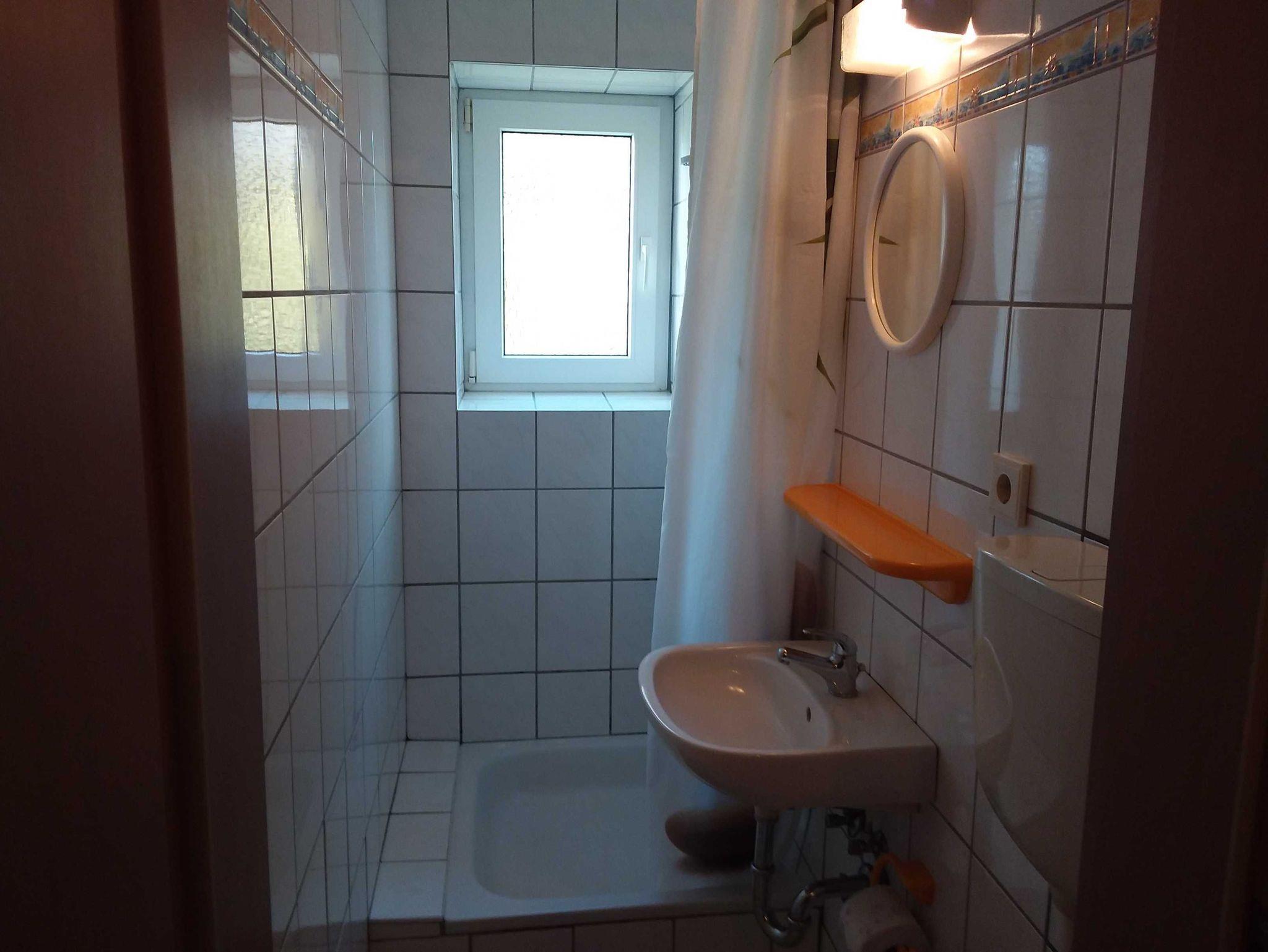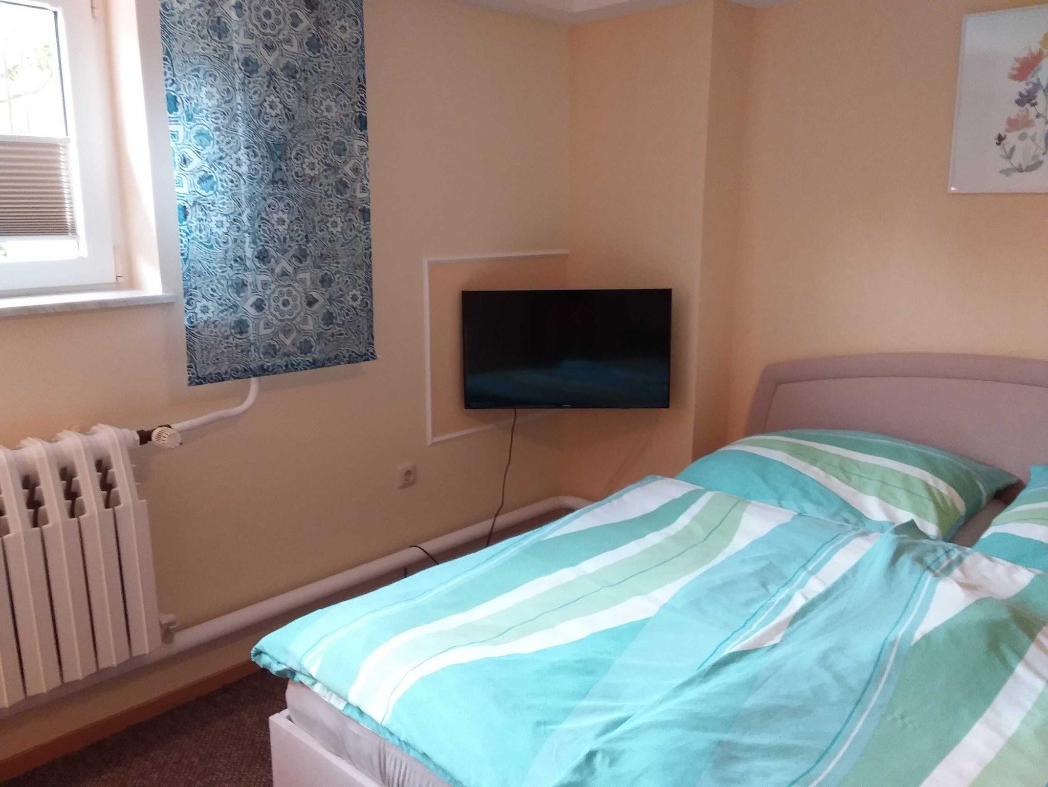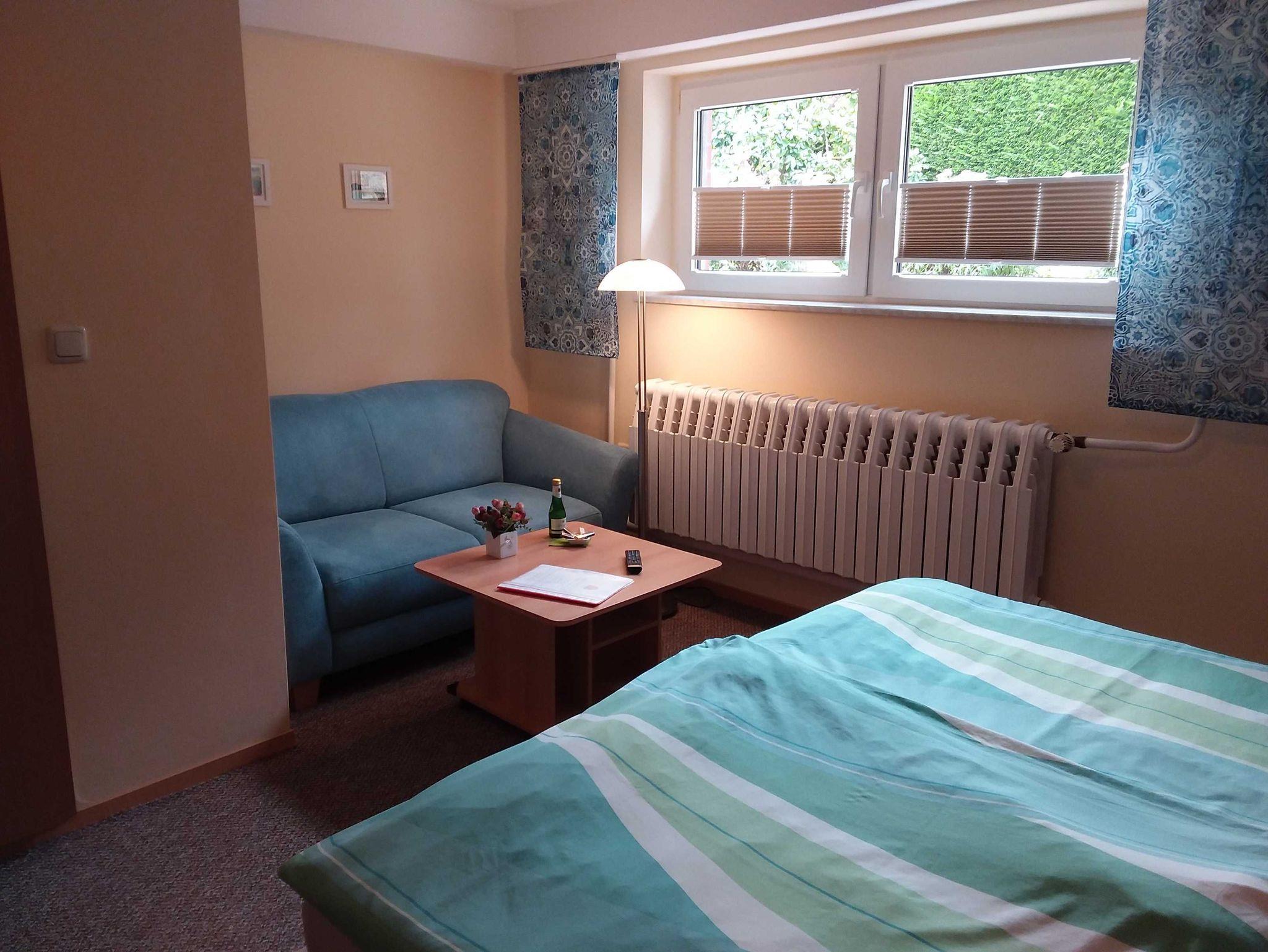 1-Raum-Ferienwohnung (20m²; max. 2 Personen, nur Erwachsene erwünscht) im Souterrain eines Familienhauses mit 1 kombinierten Wohn/ Schlafraum mit Sitzecke und 1 Doppelbett (2 Polsterbetten), Sat-TV und Radio. Separate Küche mit 2-Kochfelder-Herd (Ceran), Wasserkocher, Toaster. Kleines Duschbad/ WC. Sitzecke im Garten direkt am Haus.