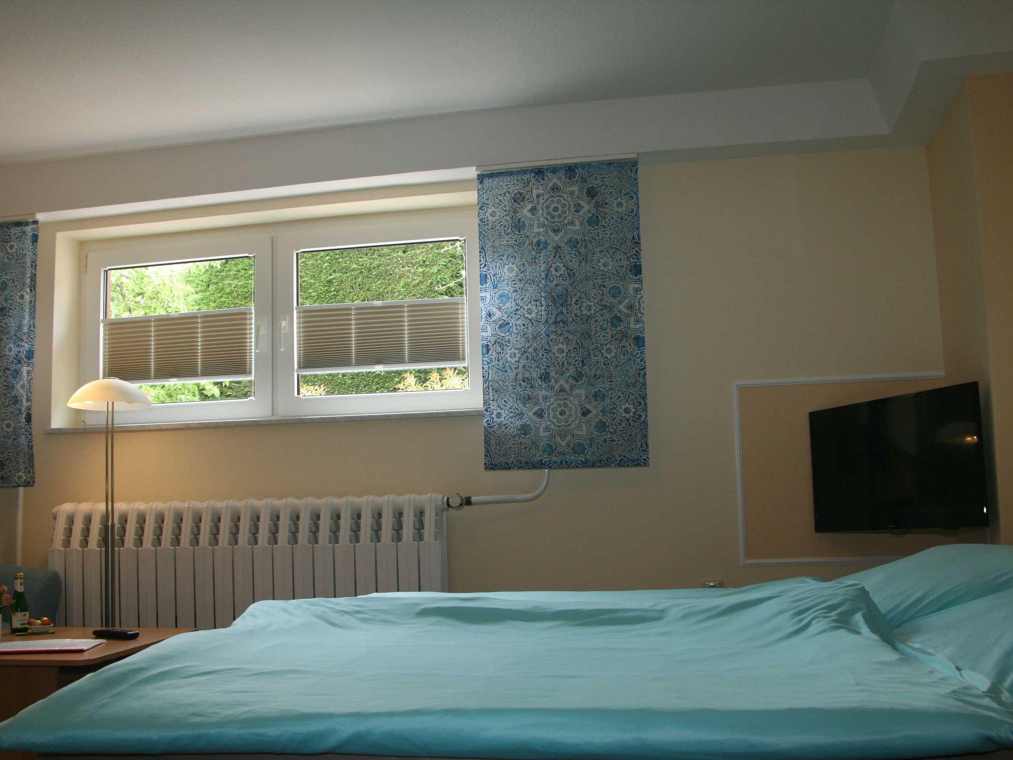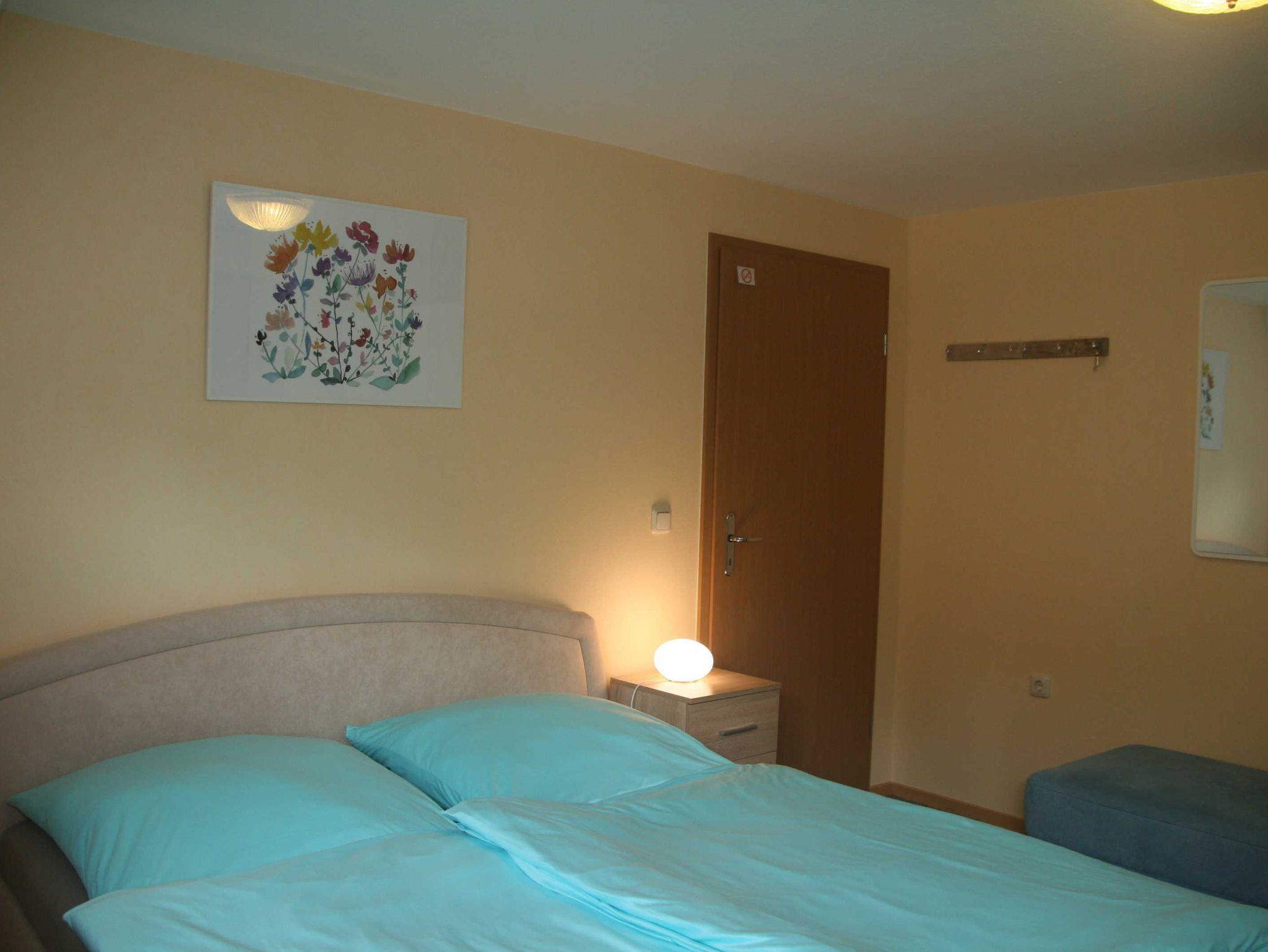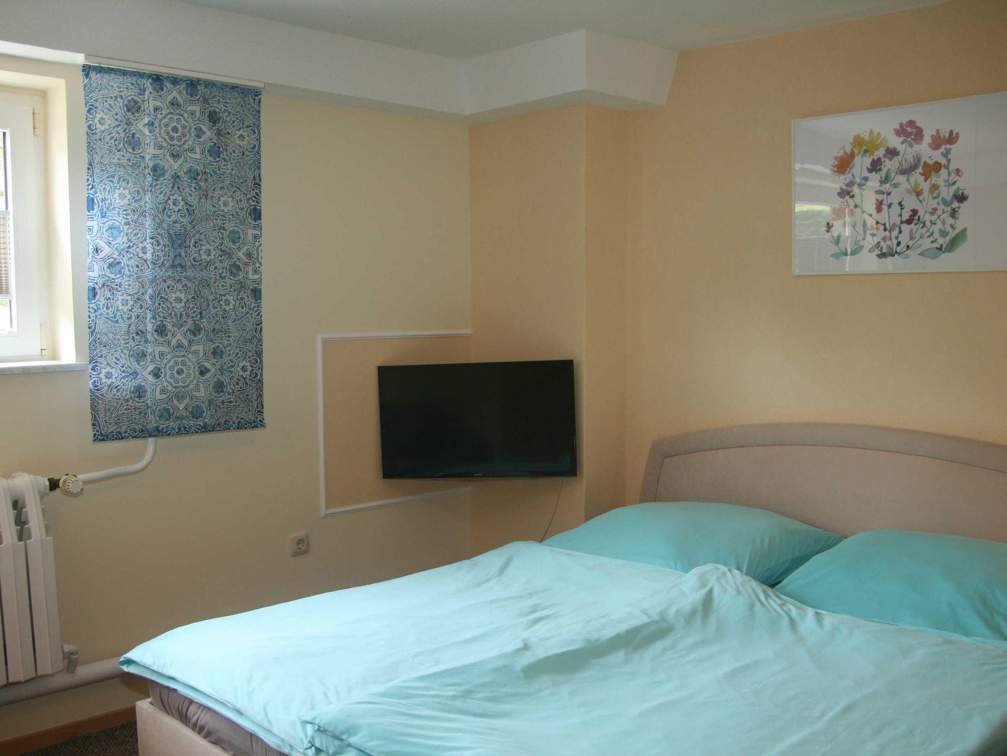 1-Raum-Ferienwohnung (20m²; max. 2 Personen, nur Erwachsene erwünscht) im Souterrain eines Familienhauses mit 1 kombinierten Wohn/ Schlafraum mit Sitzecke und 1 Doppelbett (2 Polsterbetten), Sat-TV und Radio. Separate Küche mit 2-Kochfelder-Herd (Ceran), Wasserkocher, Toaster. Kleines Duschbad/ WC. Sitzecke im Garten direkt am Haus.