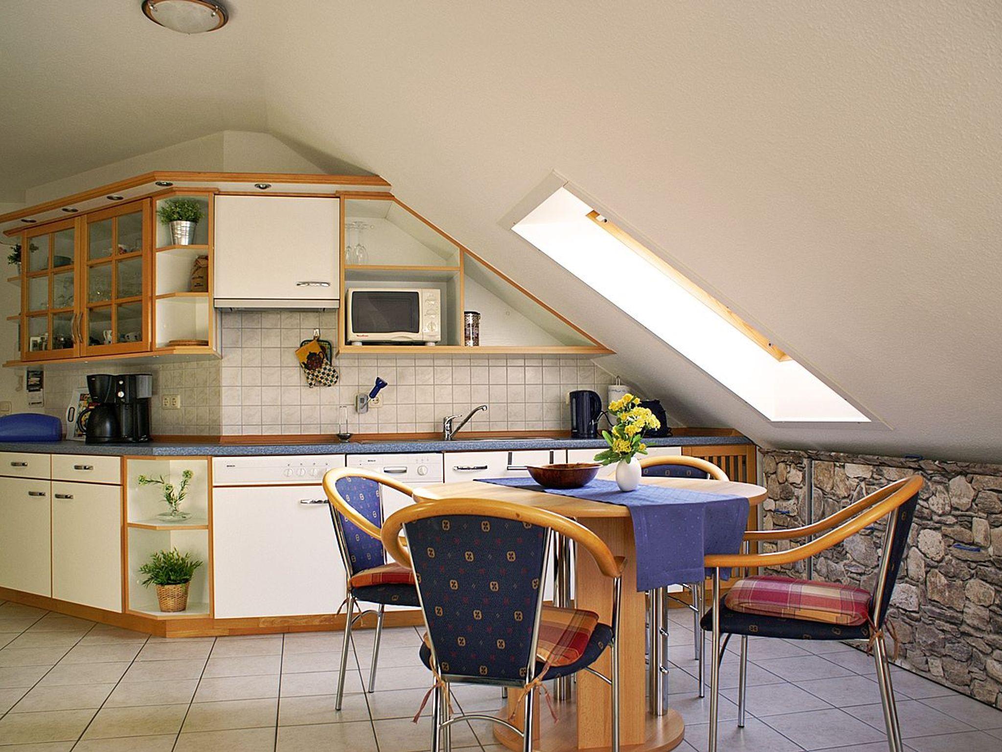 Die gemütliche Ferienwohnung (58 qm) liegt zentral und doch sehr ruhig im Dachgeschoss der Ferienwohnanlage Residenz am Kurhaus'. Aufgeteilt auf 2 Etagen können hier bis zu 4 Personen eine entspannte Auszeit vom Alltag genießen. Dabei befinden sich das Wohnzimmer mit Küchenzeile, 1 Schlafzimmer sowie Bad/WC in der unteren Etage, ein weiteres Schlafzimmer sowie eine Abstellkammer (über eine Treppe zu erreichen) im Obergeschoss.