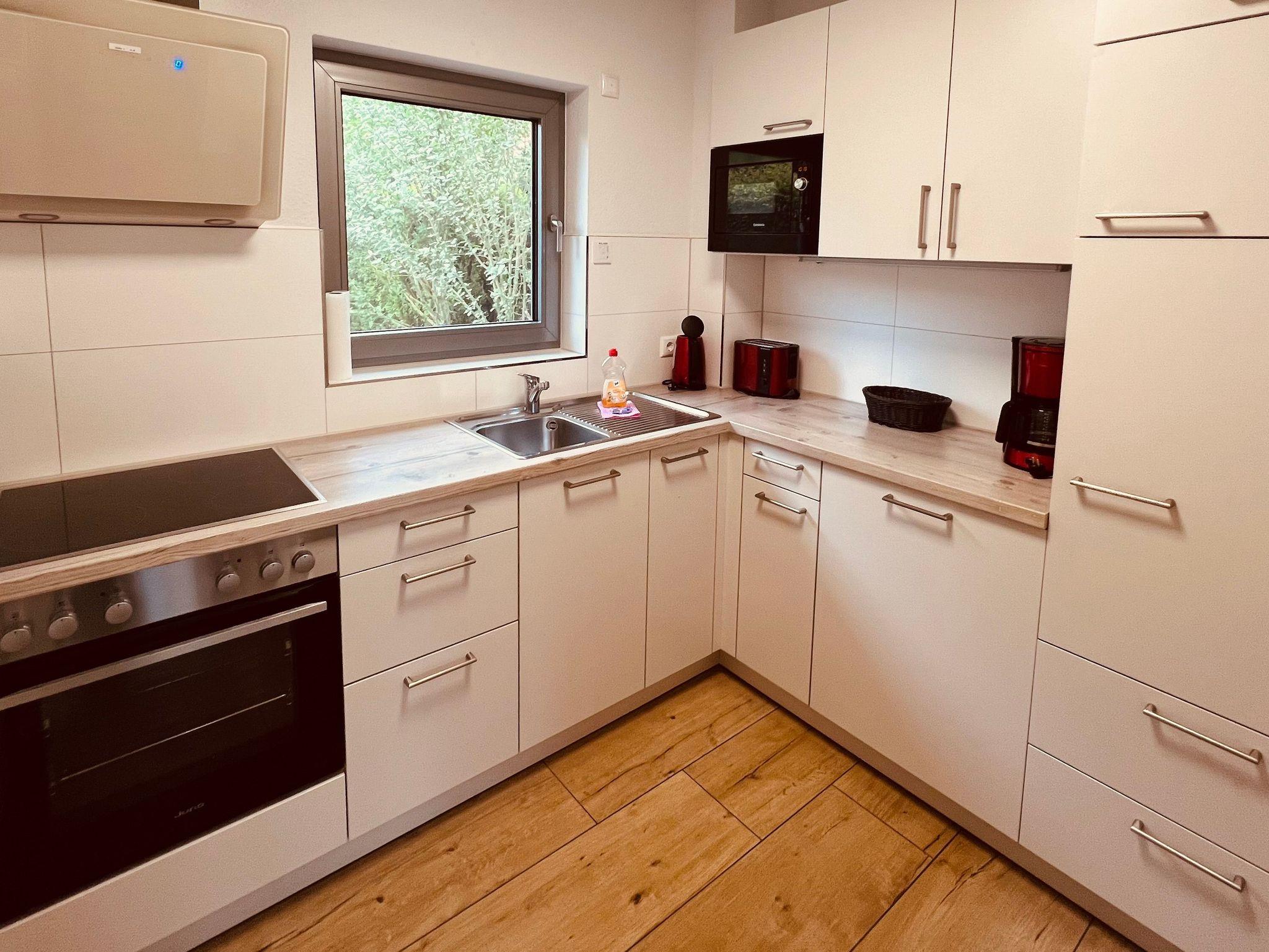Die Küche ist komplett ausgestattet mit Kühlschrank und separatem Frostfach, Geschirrspüler, Mikrowelle, Wasserkocher, Kaffeemaschine und Toaster. Die Abzugshaube bietet zusätzlich Licht auf dem Herd und stört nicht beim Kochen.