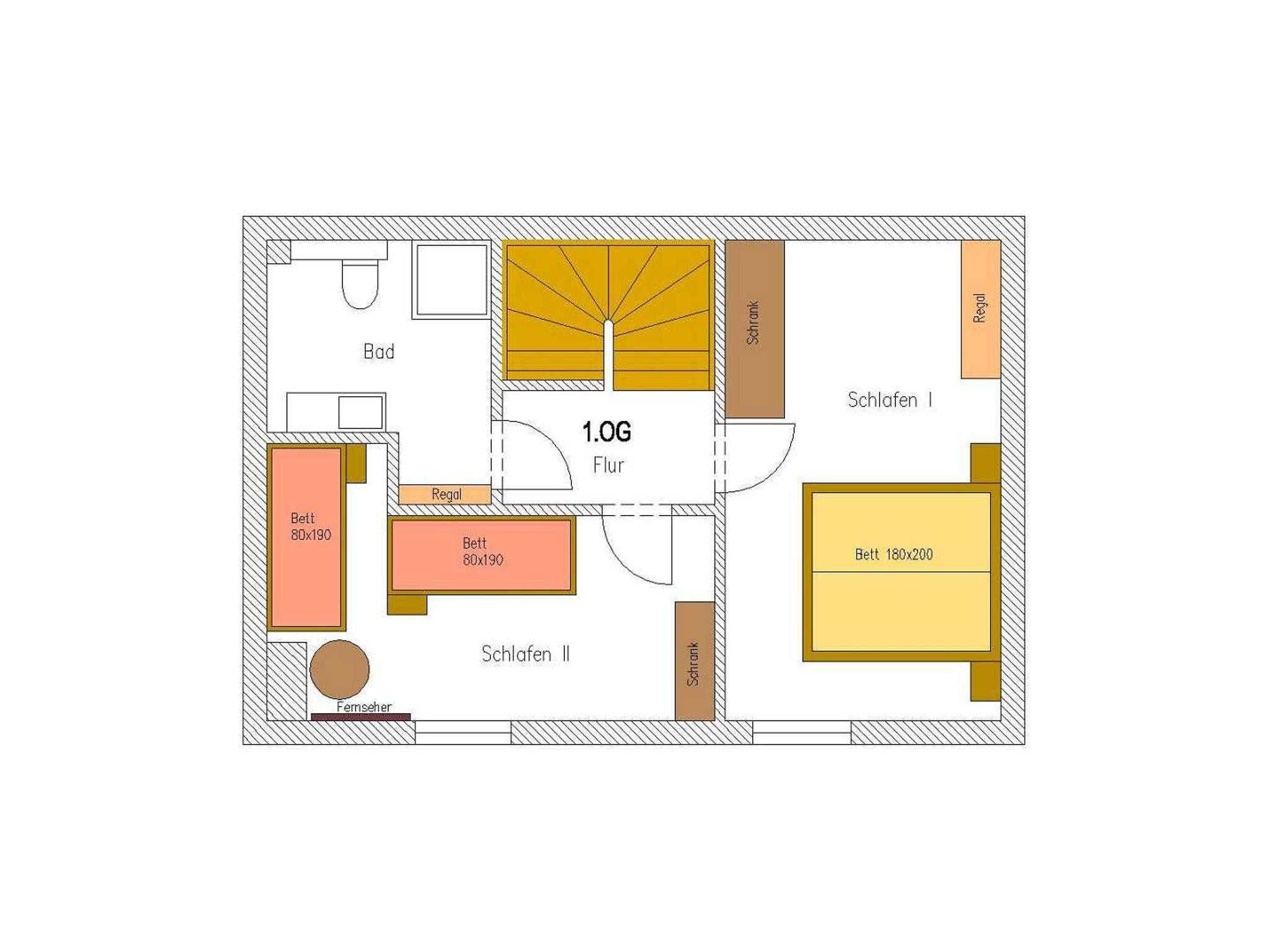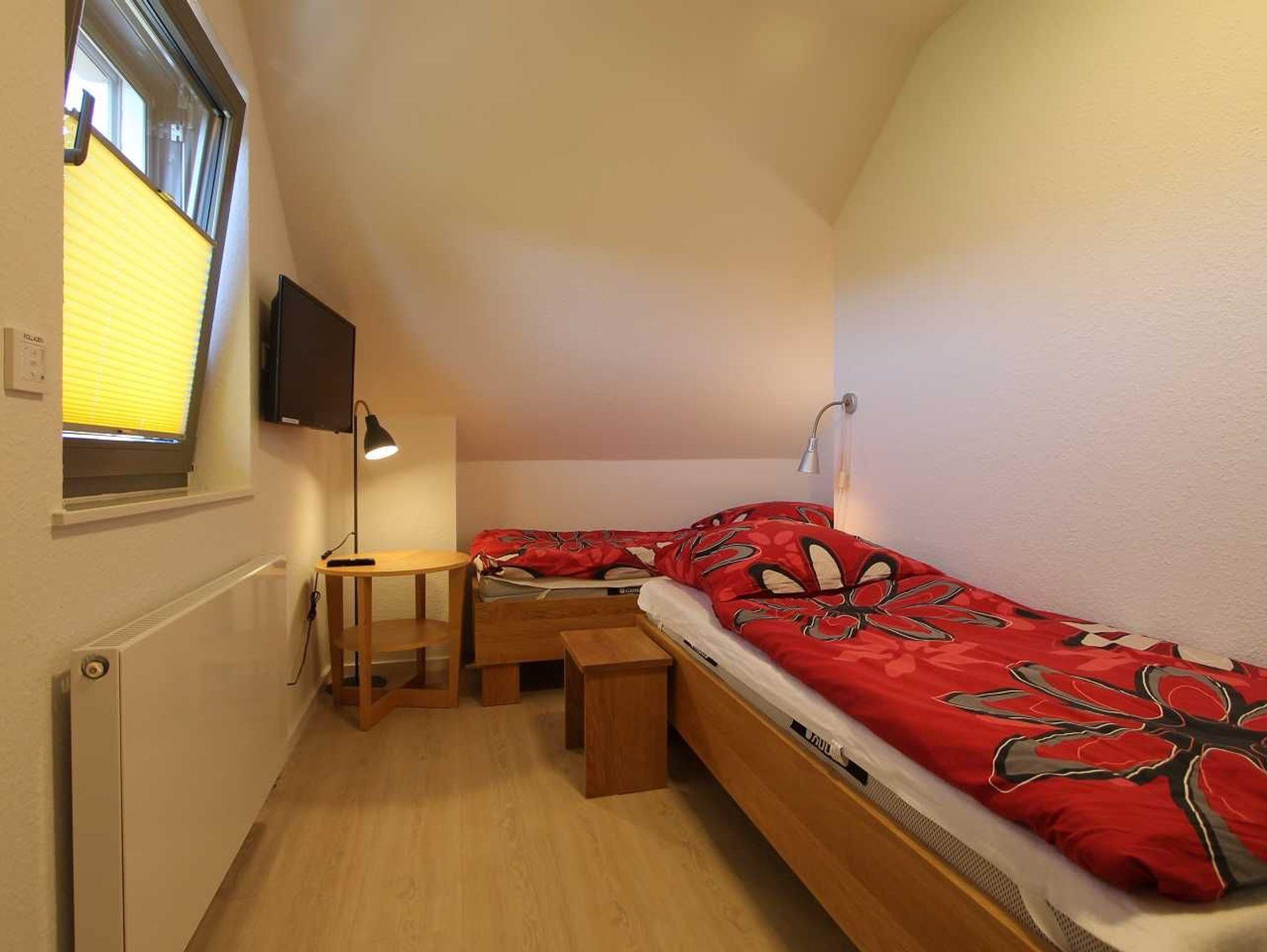 Im kleinen Schlafzimmer befinden sich zwei Einzelbetten 80x190, ein kleinerer Kleiderschrank, ein Tisch und ein 32“ Fernseher mit den gleichen Funktionen wie im Erdgeschoss.