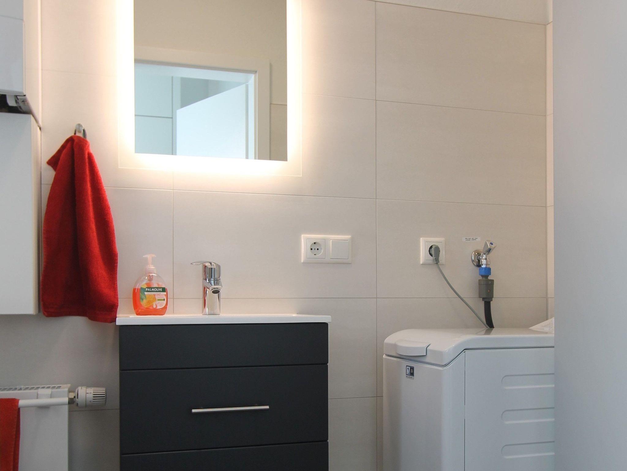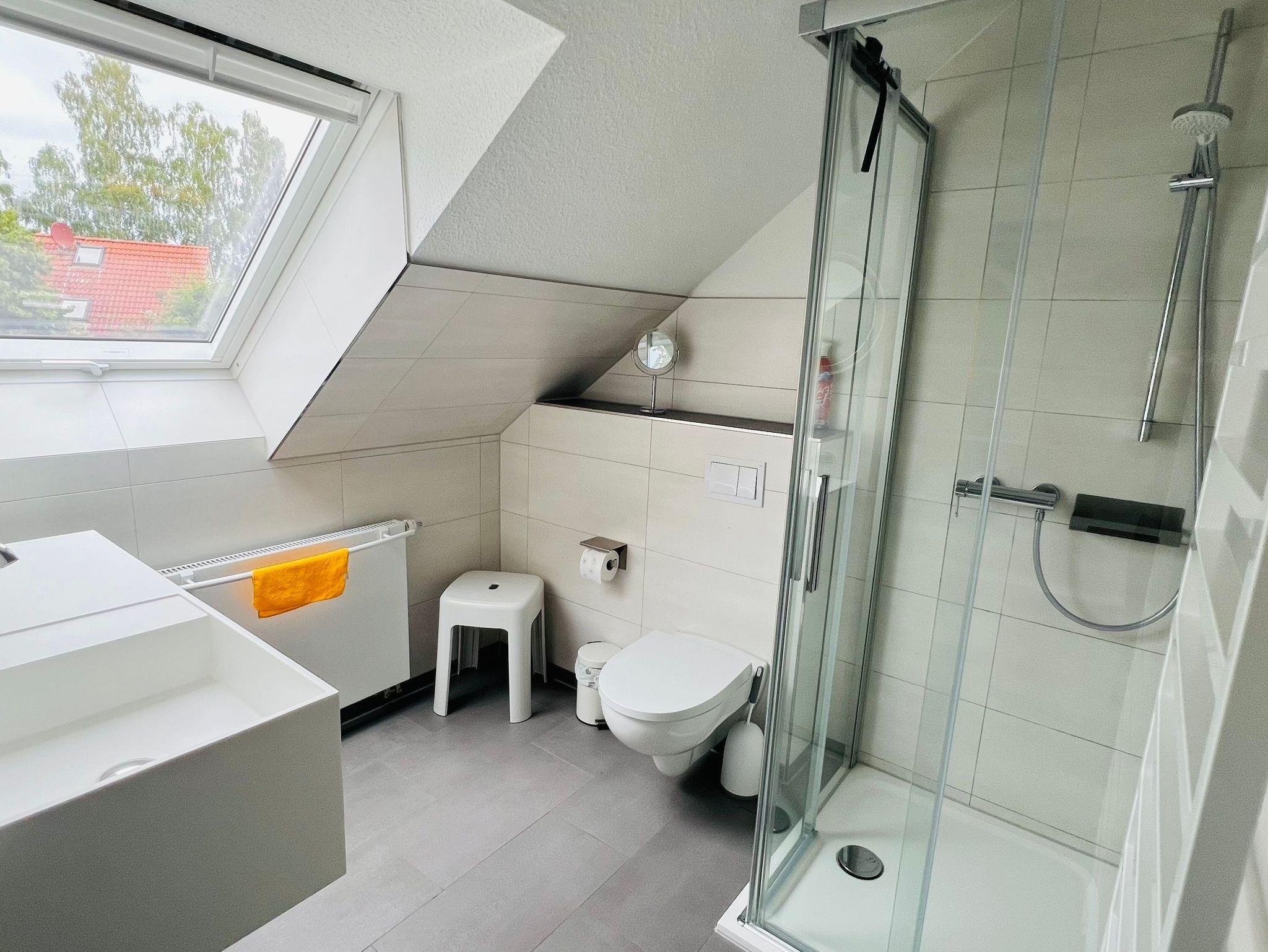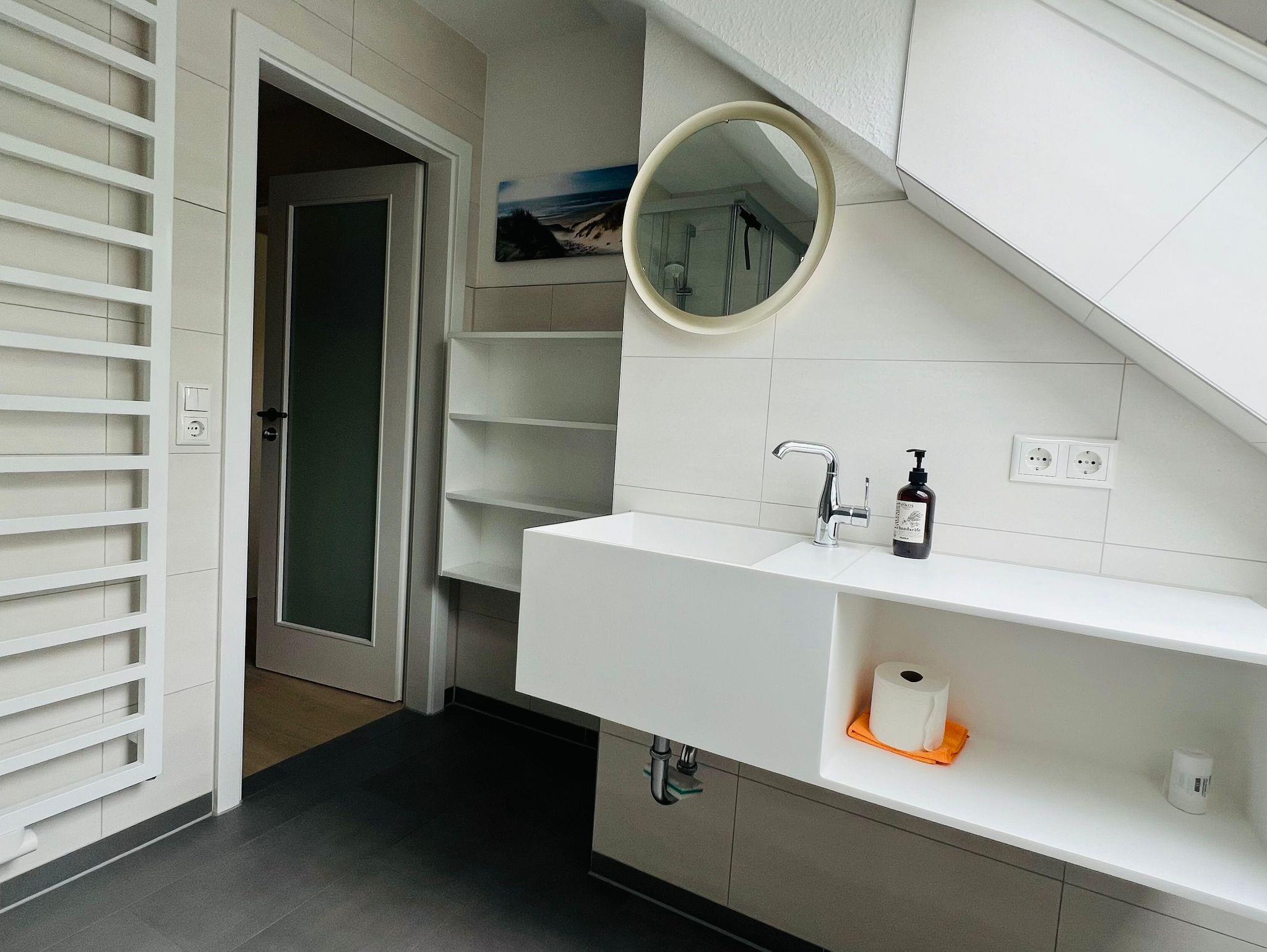 Das Bad ist mit einer ebenerdigen Echtglas Dusche, modernem Waschtisch, sowie einem zusätzliche großen Handtuchheizkörper ausgestattet.