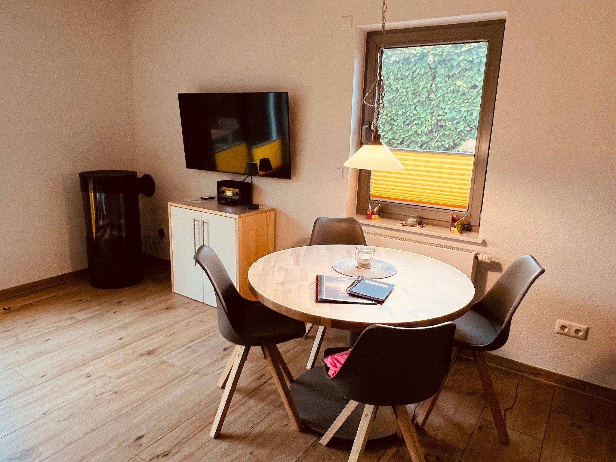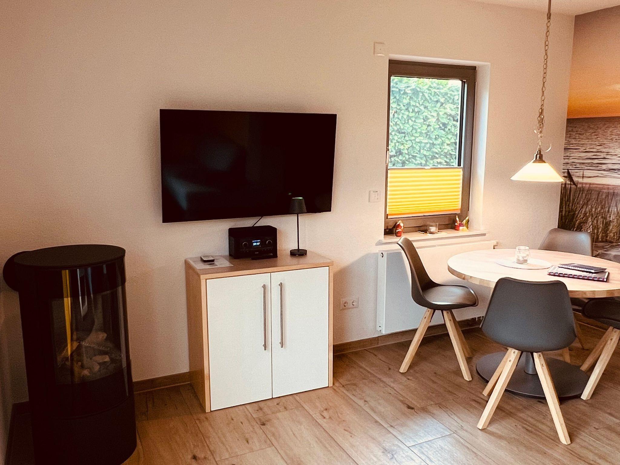 Im Wohn,-Essbereich gibt es ein Gaskamin (kein Holzauflegen!), er sorgt bei kalter Jahreszeit mit echtem Feuer für gemütliche Wärme, die sie auf der bequemen Eckcouch oder vom Tisch aus genießen können. Durch den großen 50“ Fernseher haben sie entspannte Fernsehabende. Unter diesem befindet sich ein modernes hochwertiges Radio. Ein Blu-ray Player ist im Schrank installiert. Am runden Naturholztisch sitzen sie in bequemen Stühlen. Stielgerechte Gläser finden Sie in der beleuchtetem Hänge im Wohnbereich.