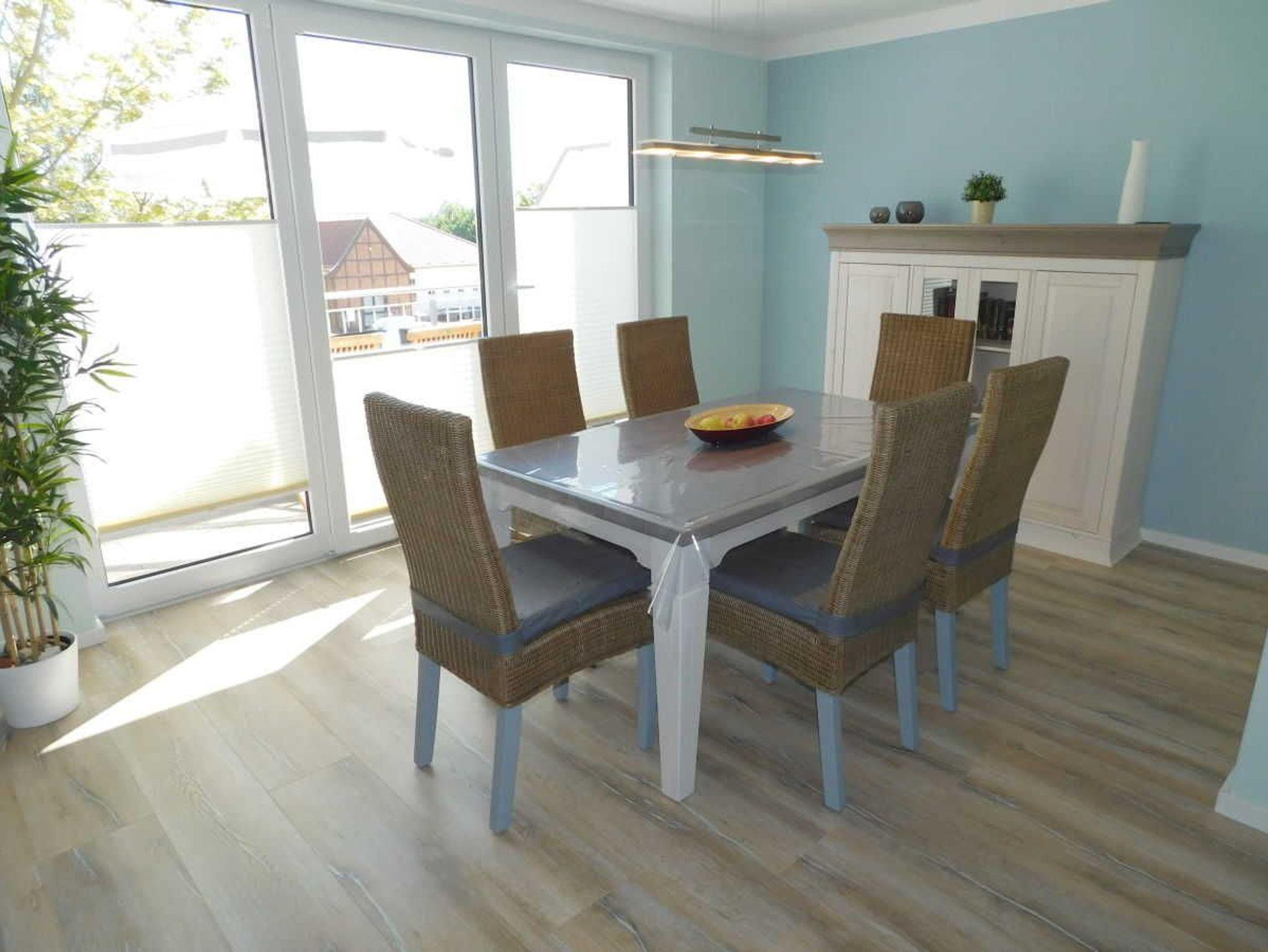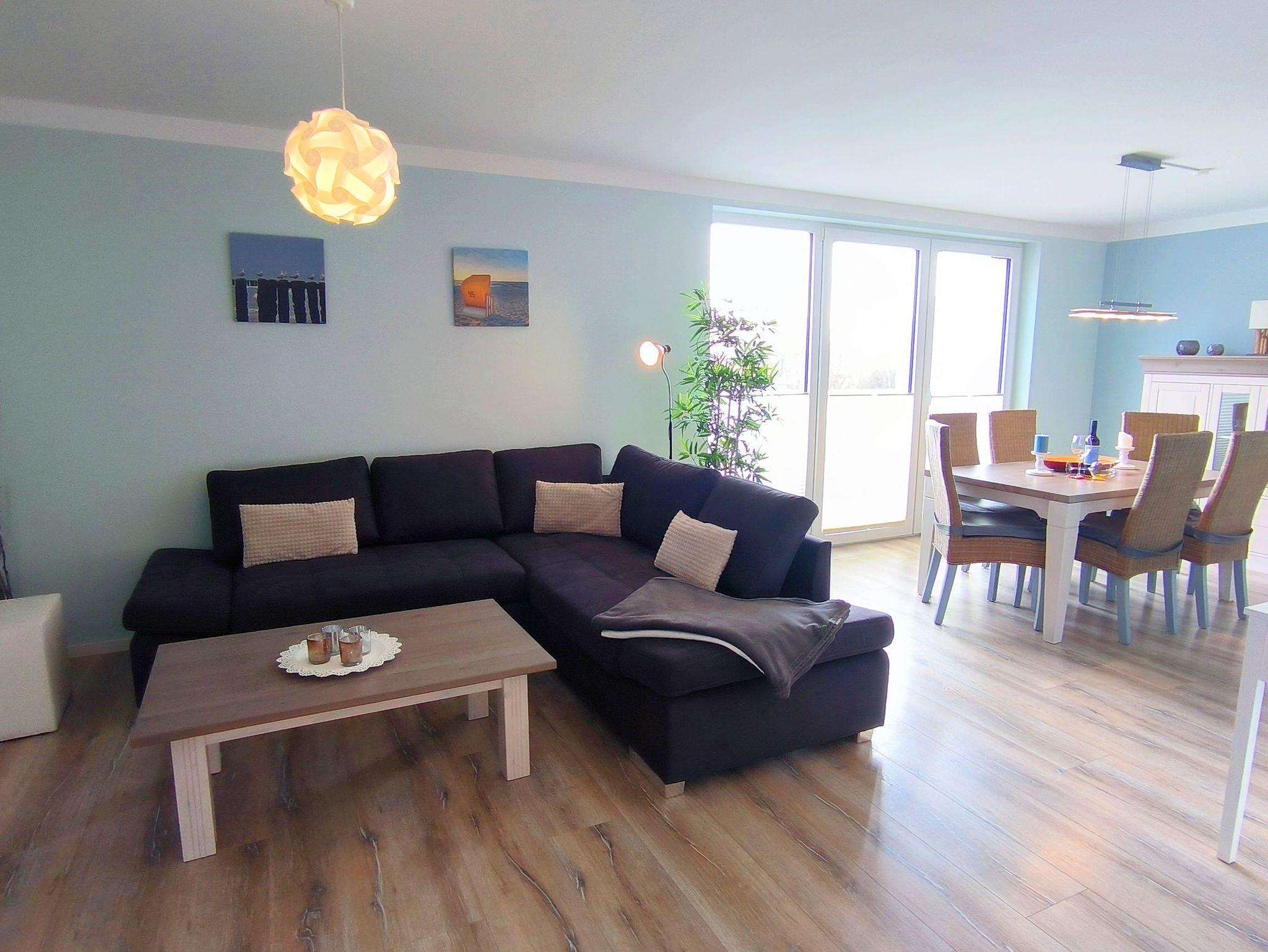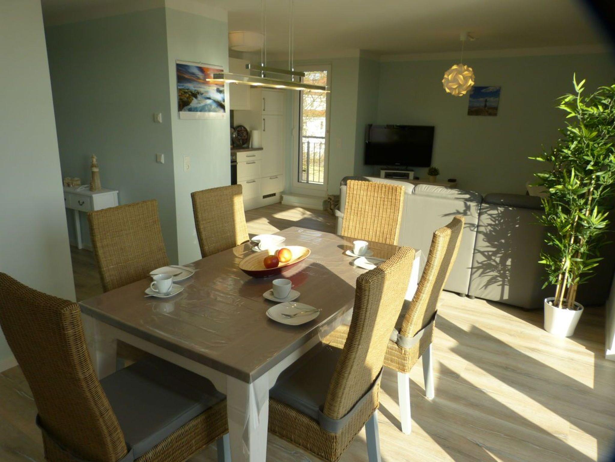 Unsere 93 qm große, gemütliche Ferienwohnung im maritimen Landhausstil mit exklusive Ausstattung , wie großem LCD Fernseher, WLAN, Blu-ray Player mit großer DVD-Sammlung für die regnerischen Tage uvm, befindet sich im Dachgeschoss eines Ende 2014 fertiggestelltem Ferienkomplexes mit Fahrstuhl und eigenem Auto Stellplatz direkt neben dem Gebäude. Die Wohnung verfügt über einen großzügigen Wohnbereich mit integrierter exklusiver Küchenzeile sowie einen komfortablen Essplatz. Insgesamt 3 Balkone laden zum Relaxen ein, wobei der Baklon mit kleinem Haffblick (Süden) über eine gemütliche Sitzecke und Essecke verfügt. Sie finden bei uns zwei helle, geräumige Schlafzimmer, die Platz für 2 bis maximal 6 Personen bieten. Ein Schlafzimmer verfügt über ein schönes, komfortables Doppelbett (Boxspringbett). Das andere über ein Etagenbett und ein Einzelbett mit integriertem Rollbett. Unser großzügiges Badezimmer verfügt über eine ebenerdige große Dusche und ein separates WC. Für die kleinen Gäste ist ein Kinderbett, Kinderstuhl und separates Kindergeschirr vorhanden