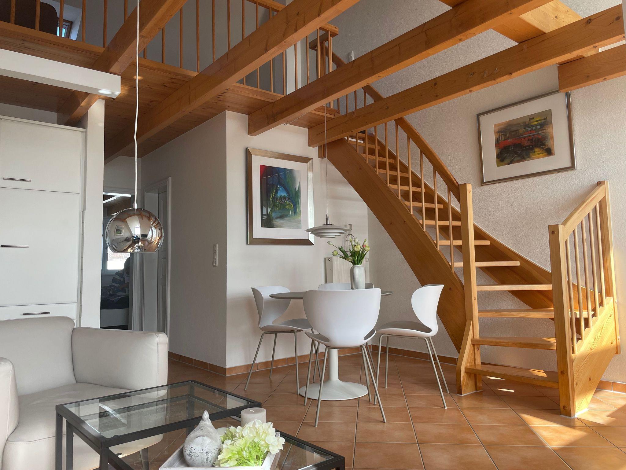 Großzügige Maisonnettewohnung mit offenen Wohn- Eßbereich und komplett ausgestatteter Küche. Herrliche Südloggia mit tollem Blick auf den Yachthafen und Salzhaff.