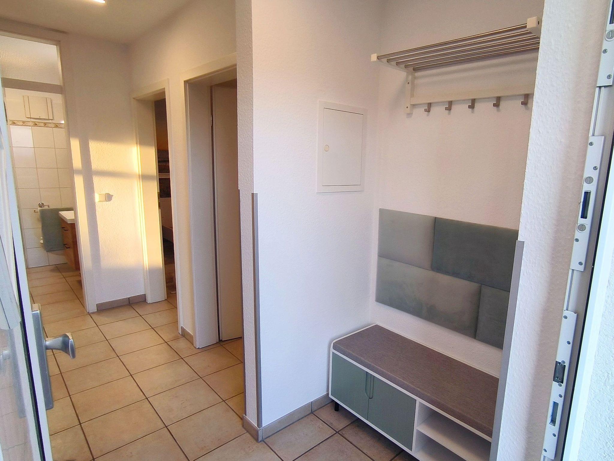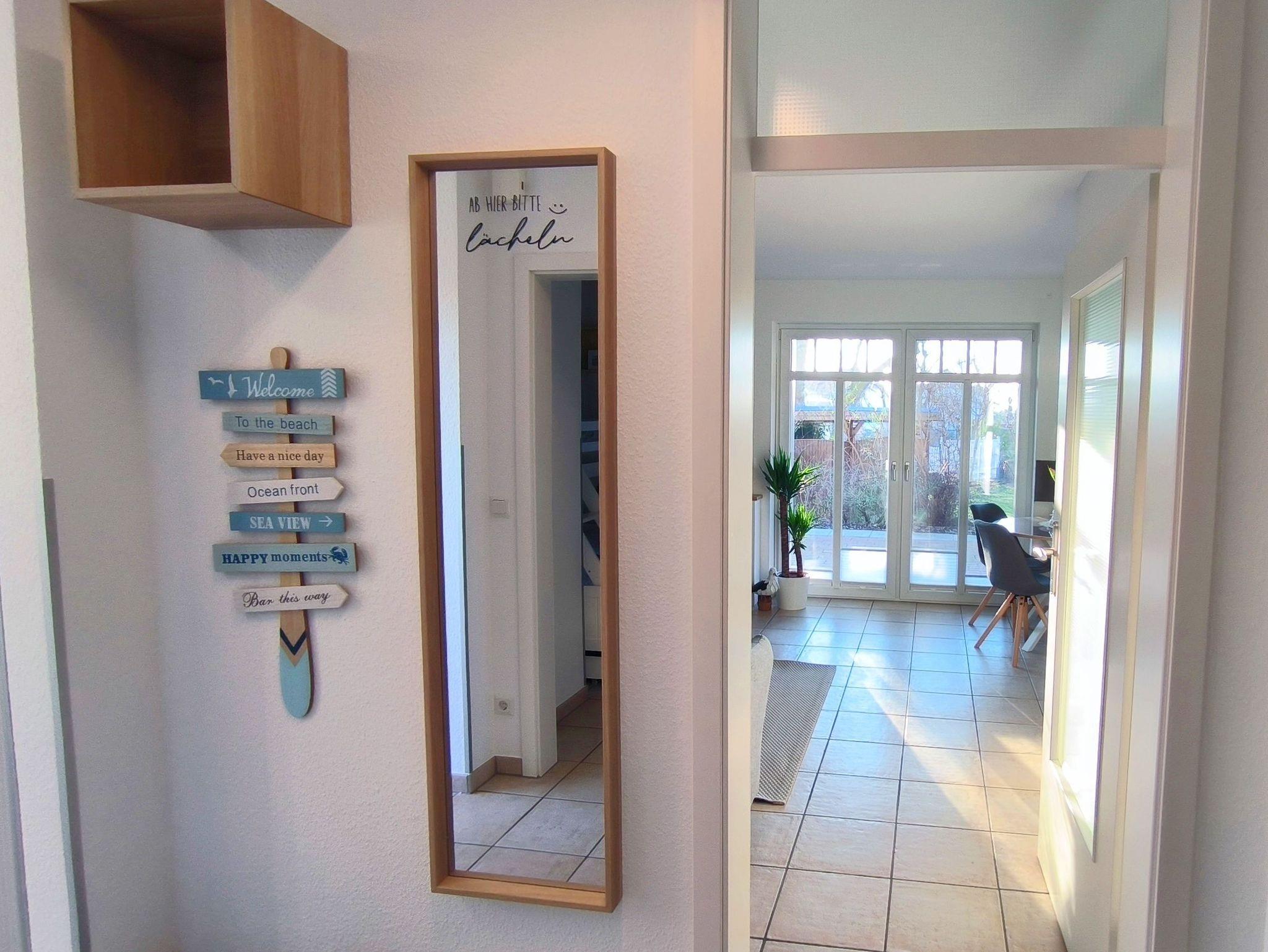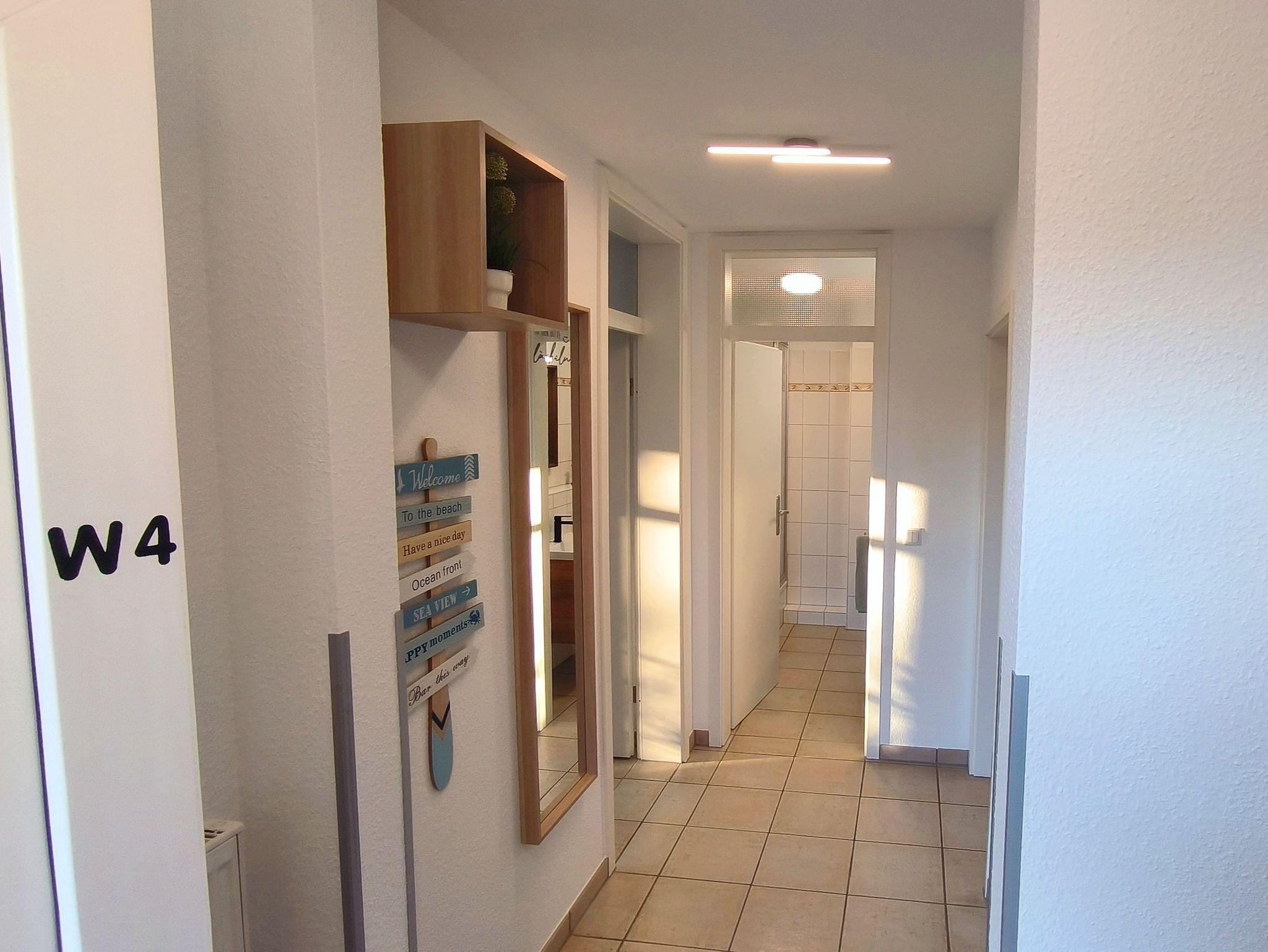Die FeWo verfügt über einen Flur, mit Zugang zum Kinderzimmer, dem Schlafzimmer, dem Badezimmer und dem Wohnzimmer mit offener Küche.