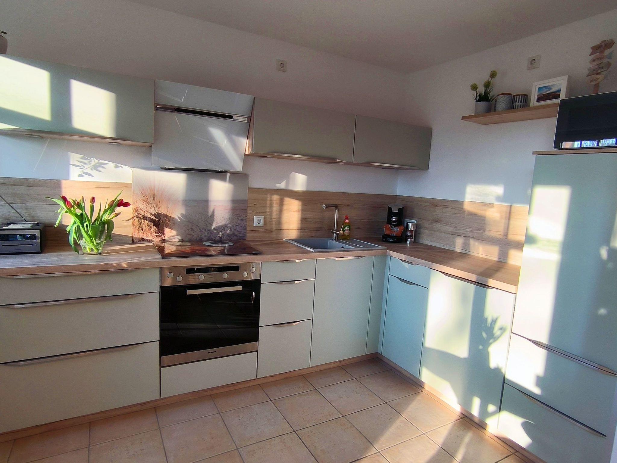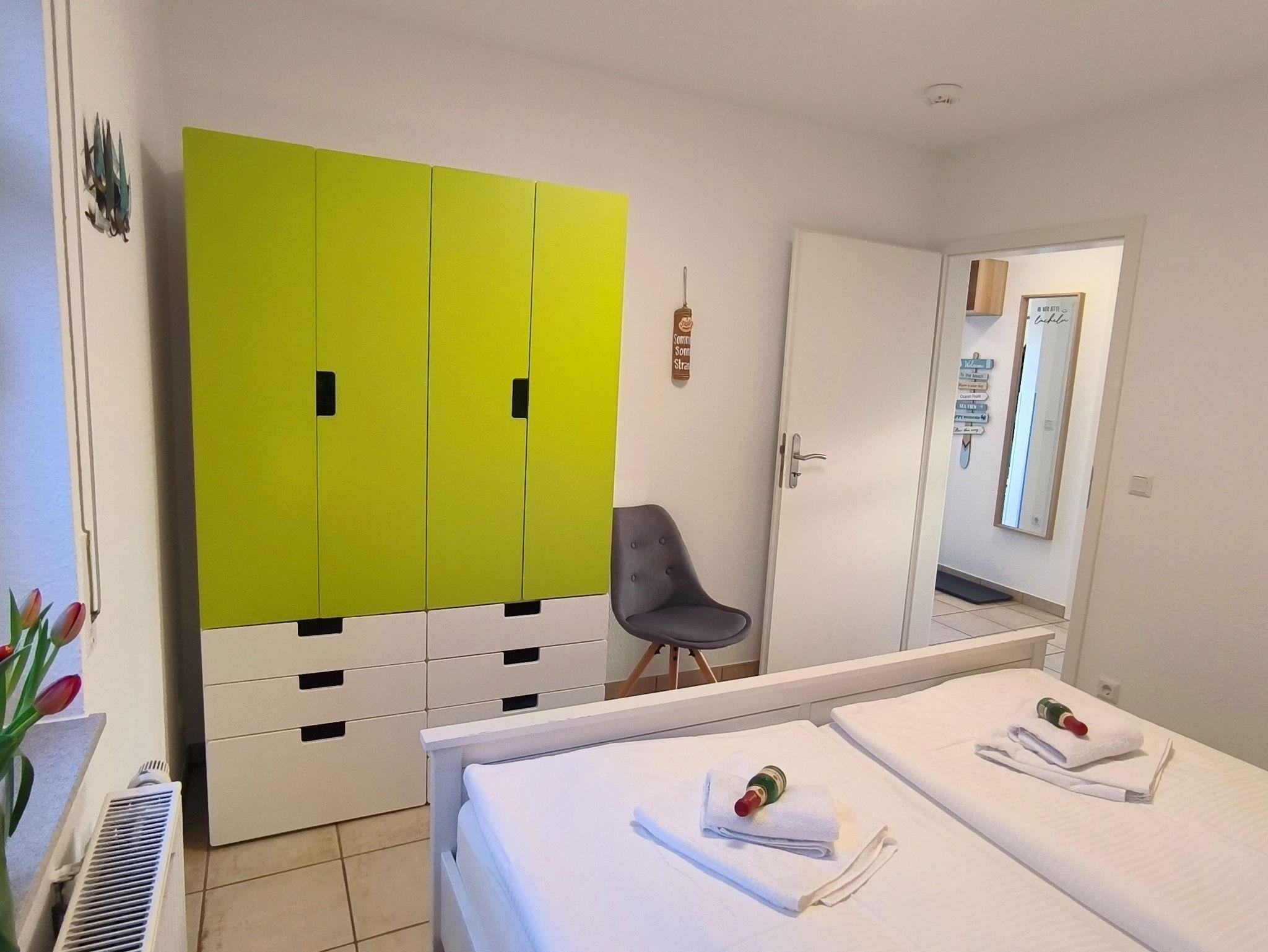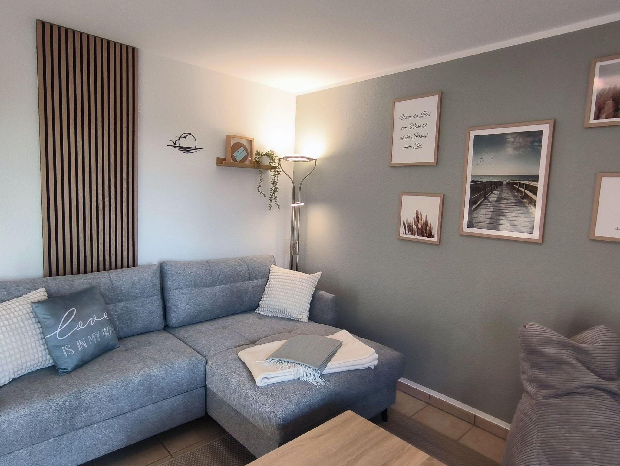 Die FeWo verfügt über einen Flur, mit Zugang zum Kinderzimmer, dem Schlafzimmer, dem Badezimmer und dem Wohnzimmer mit offener Küche.