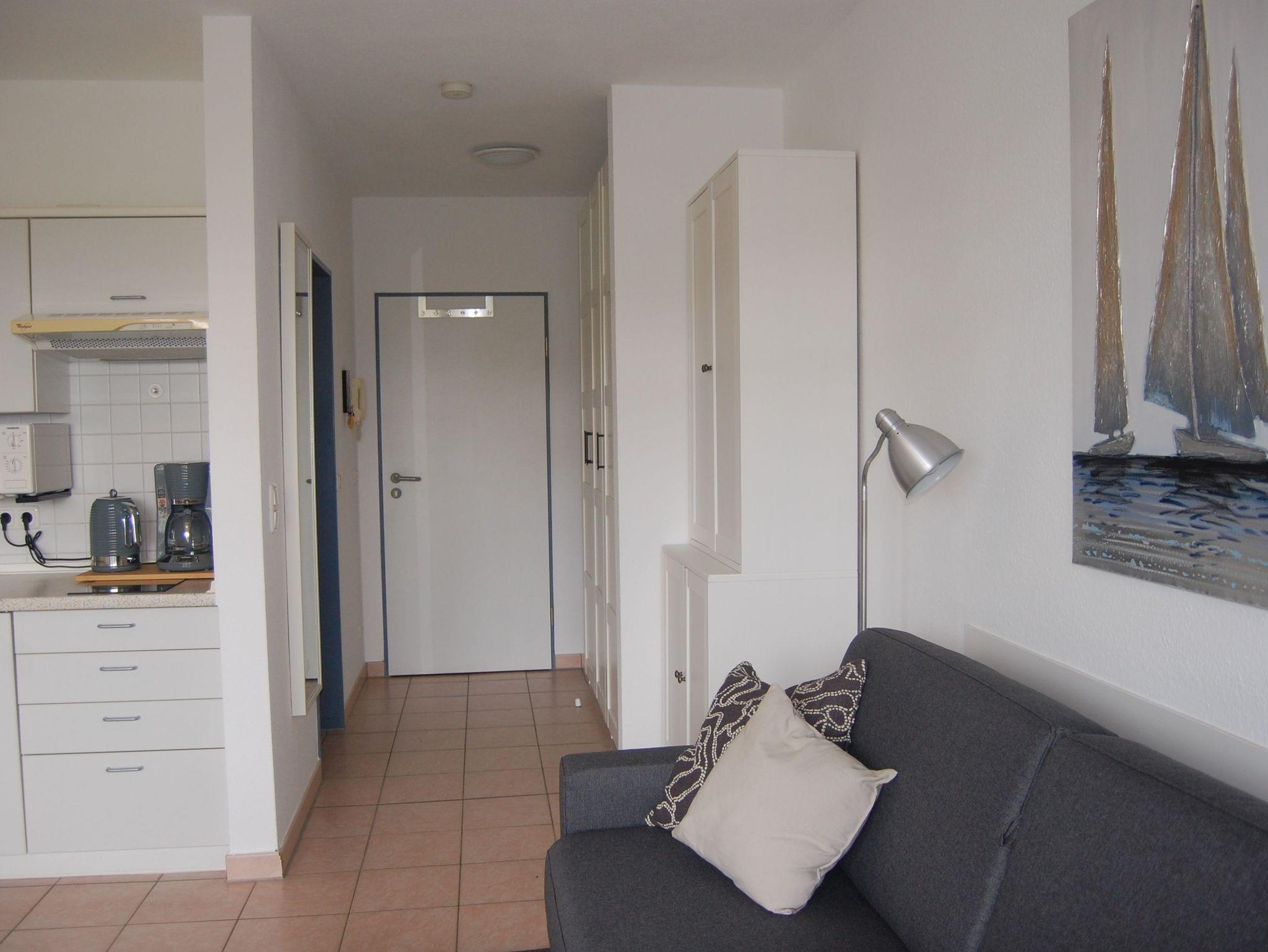 In erster Reihe zur Haffpromenade und nur 200 Meter vom Ostseestrand liegt unsere kleine, 24qm große, liebevoll und neu ausgestattete 1-Zimmer-Wohnung für 2 Personen. Sie verfügt über einen kombinierten Wohn-/ Schlafbereich mit hochwertiger Schlafcouch (170 X 200 cm) und Pantryküche, ein separates Duschbad und einen Balkon.