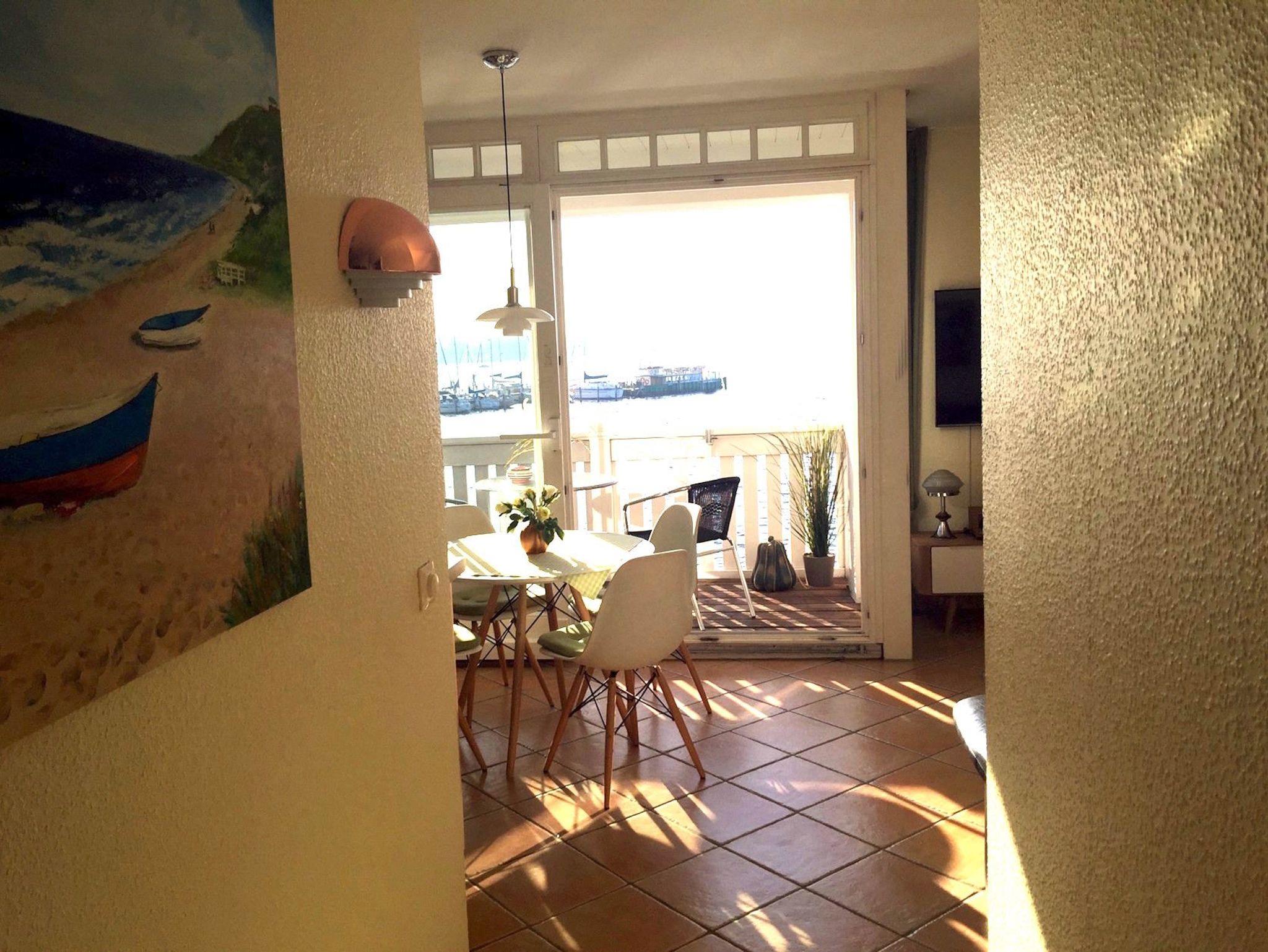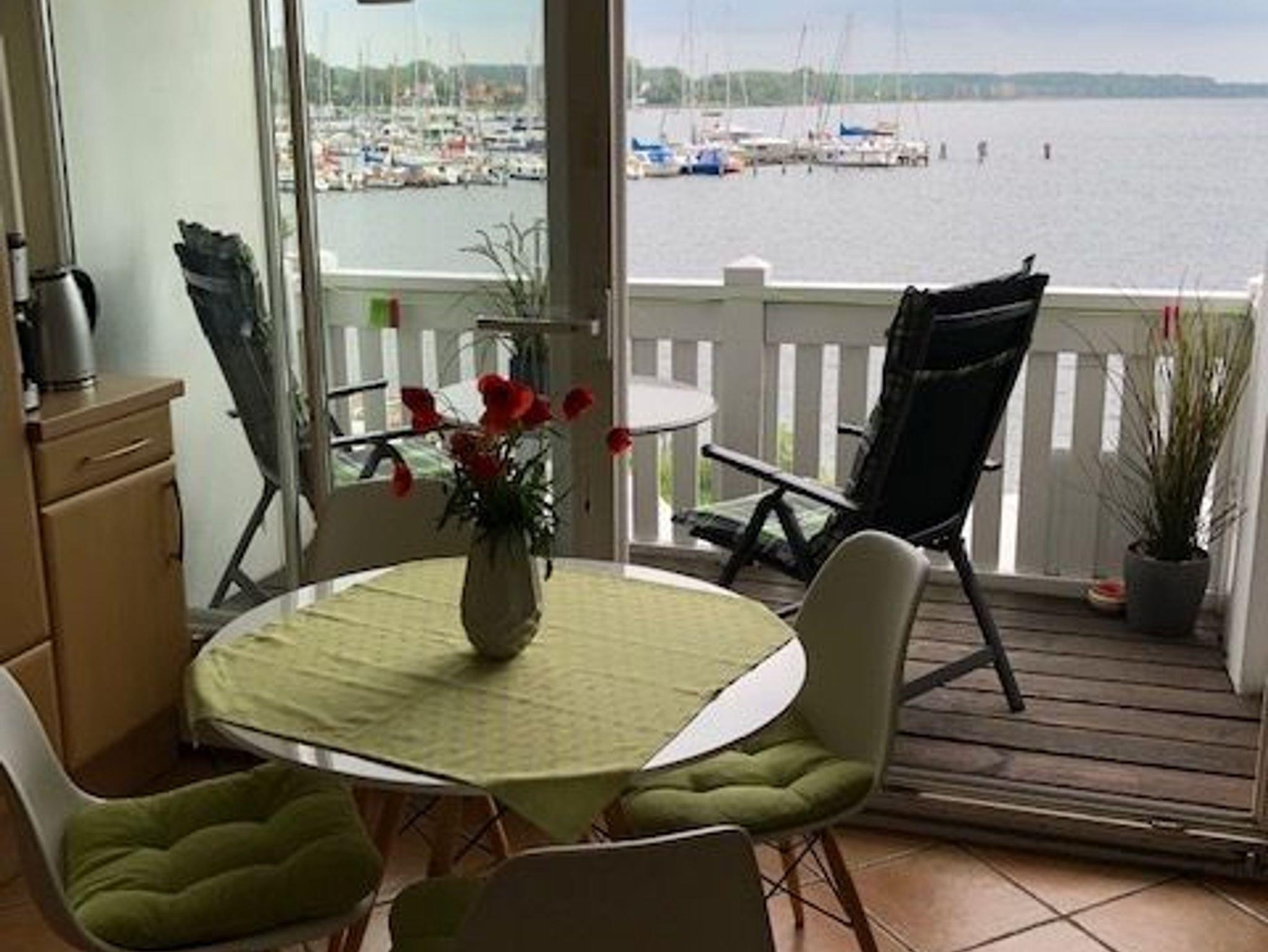 Bereits beim Betreten der Wohnung begrüßt Sie ein offener Wohn- und Küchenbereich mit einem atemberaubenden Ausblick direkt auf das Salzhaff mit seinem idyllischen Hafen.
