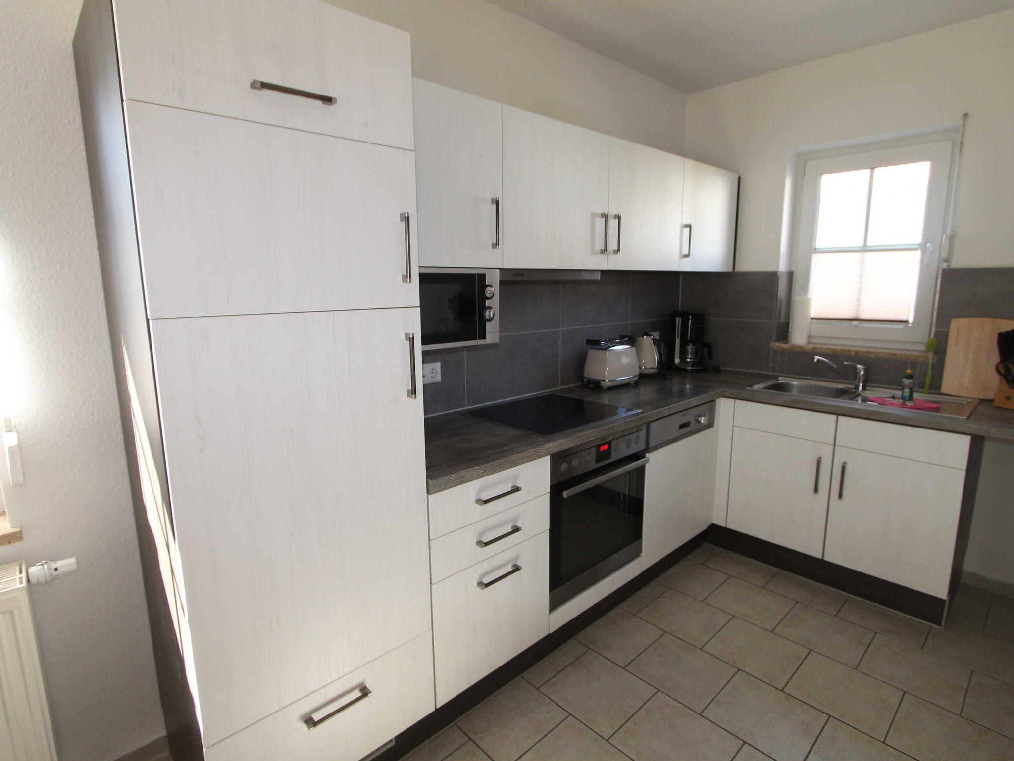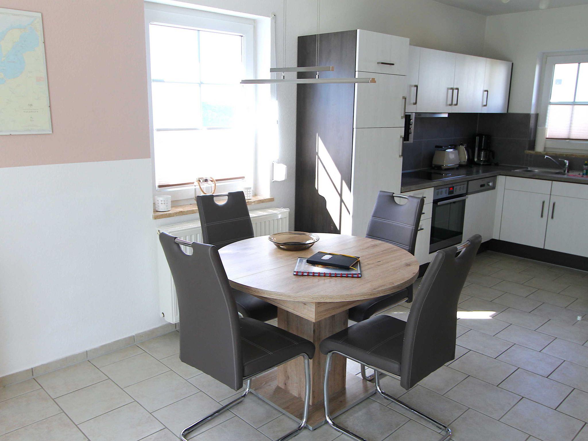 im Wohnraum integriert ist der Essbereich mit Tisch und Stühen sowie die komplett ausgestattete Küchenzeile mit Herd- Backofen, Kühlschrank und vielem mehr.