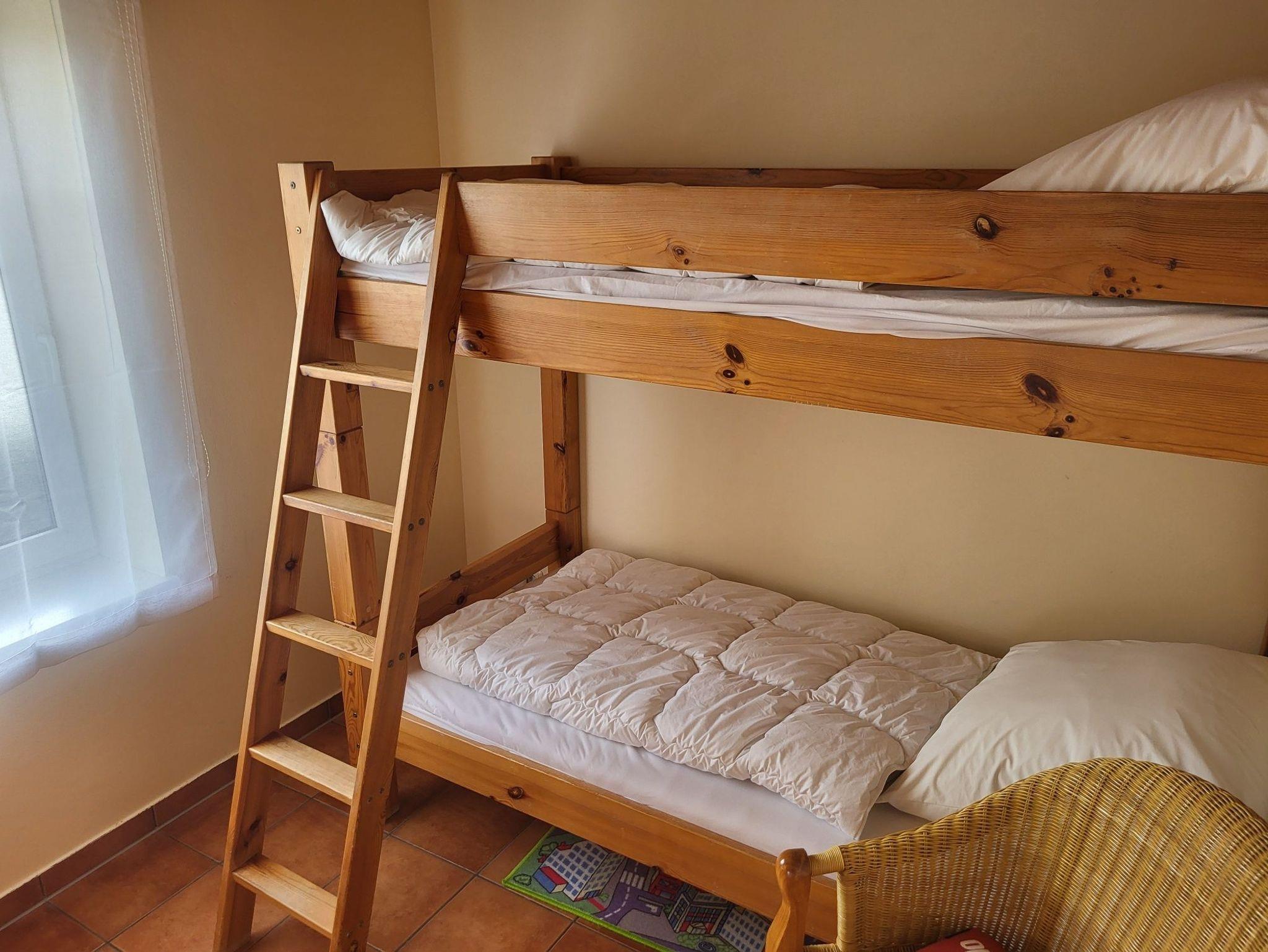 Schlafzimmer 1 verfügt über ein Doppelbett (2 Boxspringbetten je 0,90 m), das wahlweise zusammen oder getrennt gestellt werden kann. In Schlafzimmer 2 befindet sich ein Etagenbett bzw. Doppelstockbett und es besteht die Möglichkeit, eine zusätzliche Aufbettung für ein Kind vorzunehmen.
