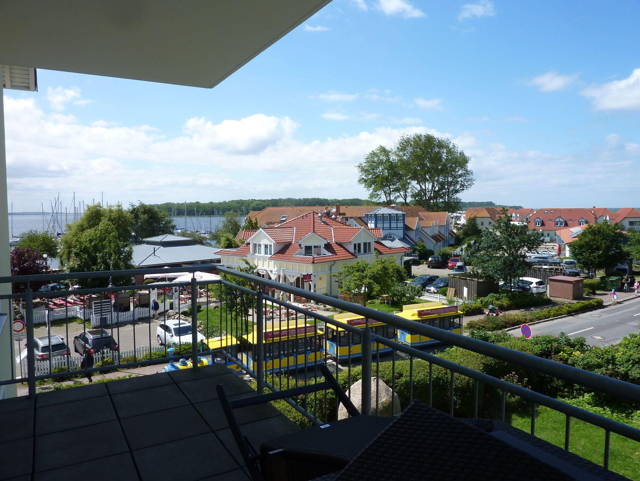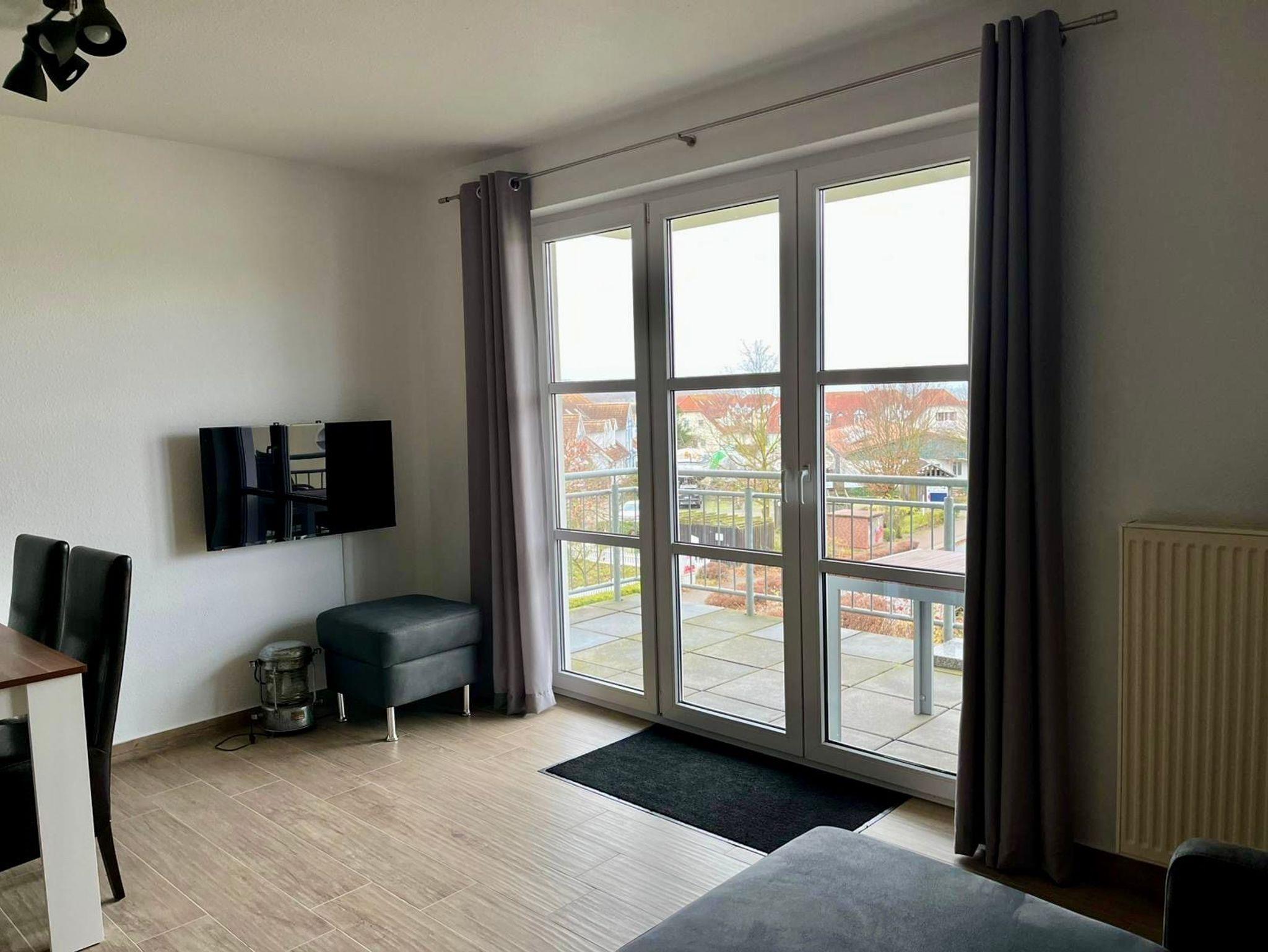Die voll ausgestattete Küchenzeile, die mit einem Backofen und Geschirrspüler ausgestattet ist, ist harmonisch in das einladende Wohnzimmer integriert. Von diesem Raum aus gelangen Sie auf den großzügigen Balkon, der einen direkten Blick auf das Salzhaff und die Ostsee bietet. Die komfortablen Balkonmöbel sowie der Sonnenschirm laden dazu ein, die Nachmittags- und Abendsonne in vollen Zügen zu genießen.