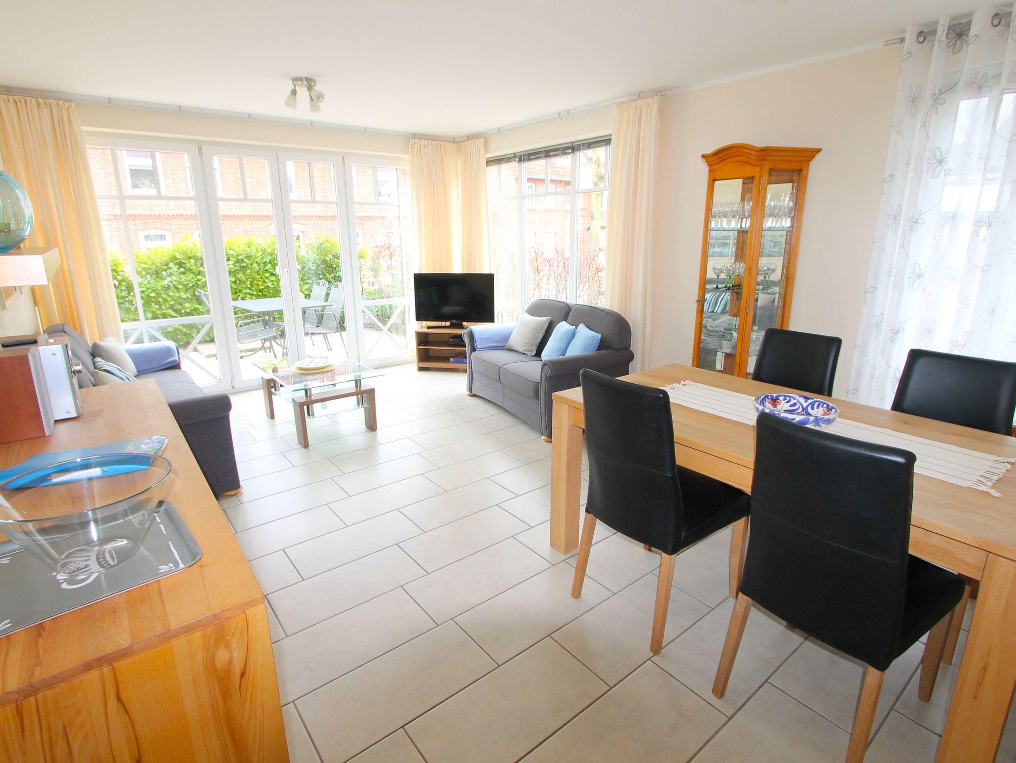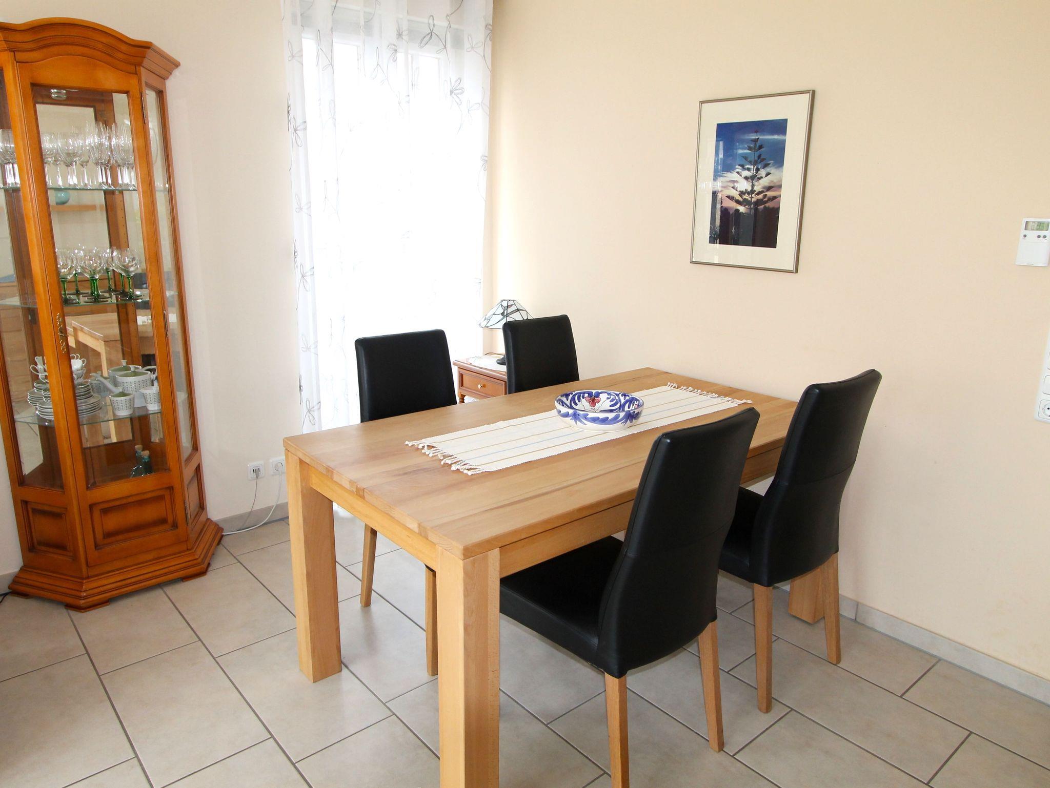 Zur Wohnung gehört ein großes Wohn- und Esszimmer mit Couchbereich und SAT-TV sowie der Essbereich mit einem großen Tisch und Stühlen. Bodentiefe Fenster sorgen für viel Licht und die angrenzende Süd- Terrasse mit Gartenmöbeln lädt zum Sitzen und Entspannen ein.