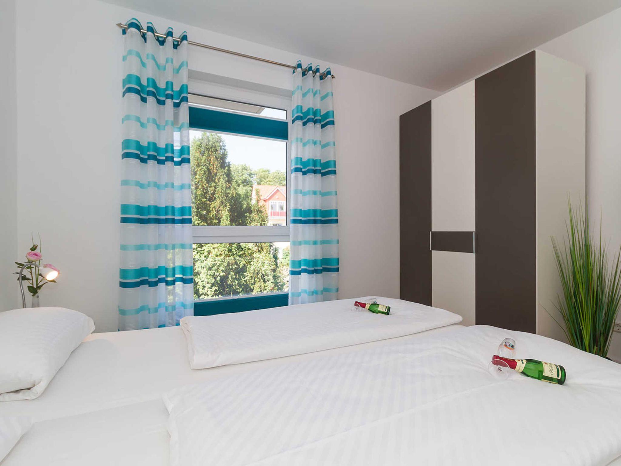 In der Ferienwohnung Ostseebrise erwartet Sie ein Schlafzimmer mit großem Doppelbett (180 x 200) und Flachbildschirm.