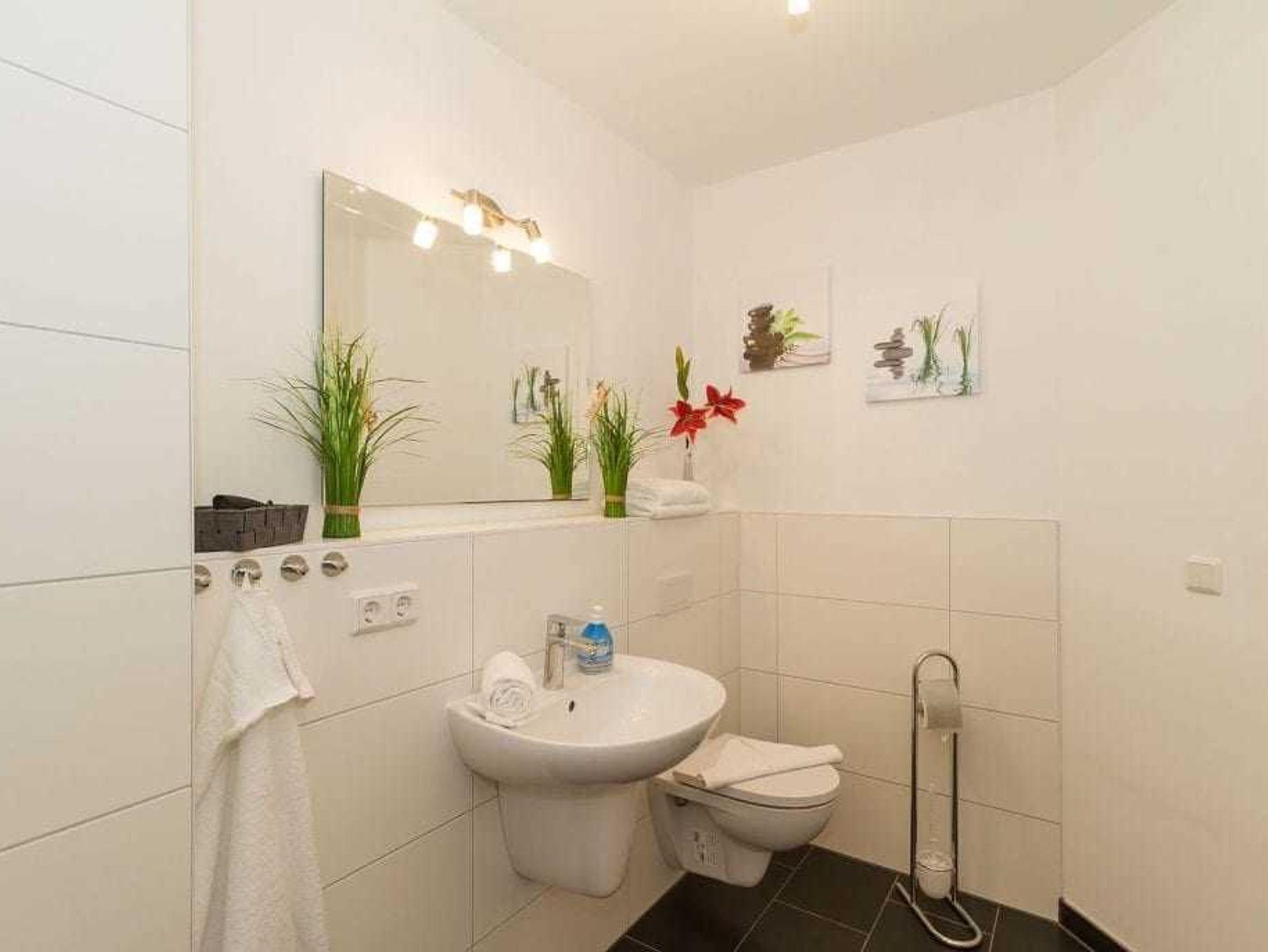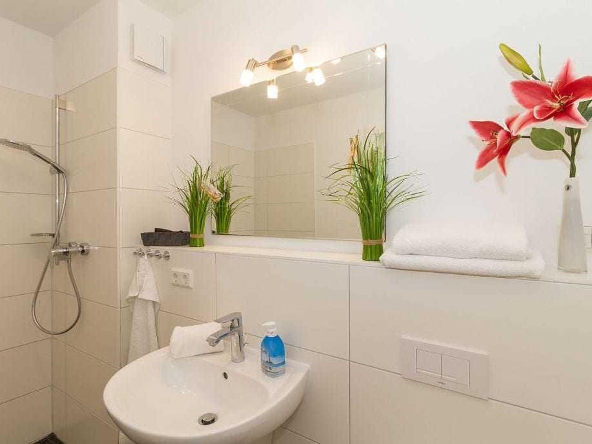 Das Badezimmer verfügt über eine ebenerdige Dusche für den bequemen Einstieg. Ein Fön liegt für Sie bereit.