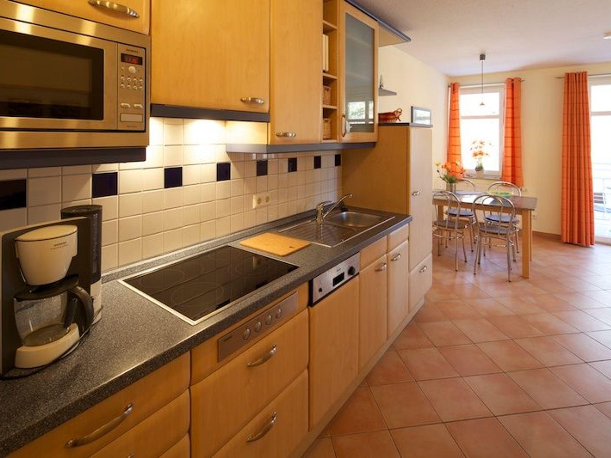 Die im I. OG gelegene Wohnung, in warmen und hellen Farben mit maritimem Flair, hat eine offene, moderne Küche, mit Geschirspüler, Cerankochfeld, Mirowelle, Kaffemaschine, Wasserkocher und vieles mehr.