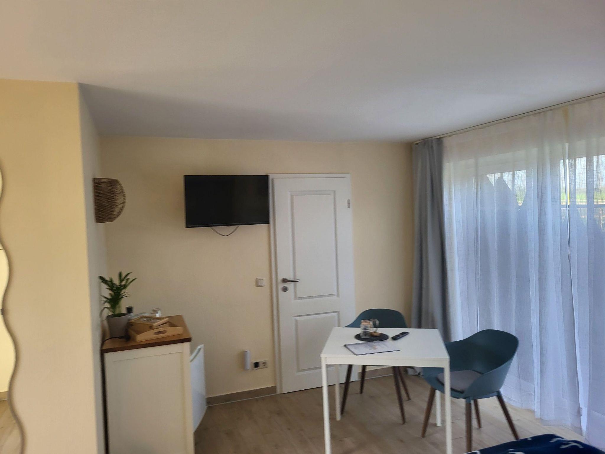 Das Doppelzimmer verfügt über ein Boxspringbett, das wahlweise als Doppelbett oder zwei Einzelbetten gestellt werden kann. Es gibt ein Duschbad/WC und ein kleines Küchenregal mit Wasserkocher, Minikühlschrank und Geschirr.
