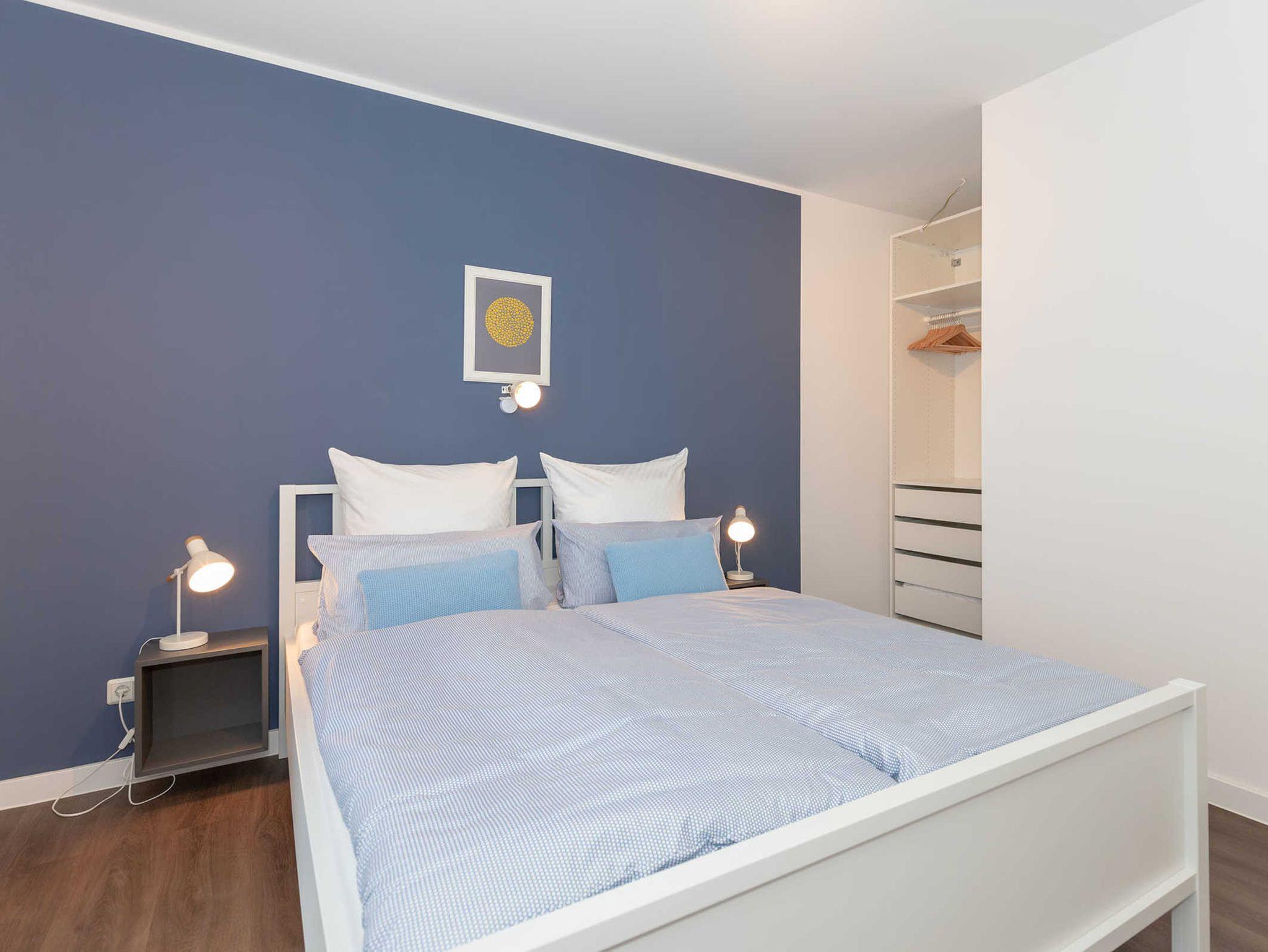 Die Wohnung verfügt über 2 Schlafzimmer. Im ersten Schlafzimmer ist ein Doppelbett (1,80m x 2,00m) und im zweiten Schlafzimmer ist ein Etagenbett (untere Liegefläche 1,40 m x 2,00 m und die obere Liegefläche beträgt 90 x 2,00 m).