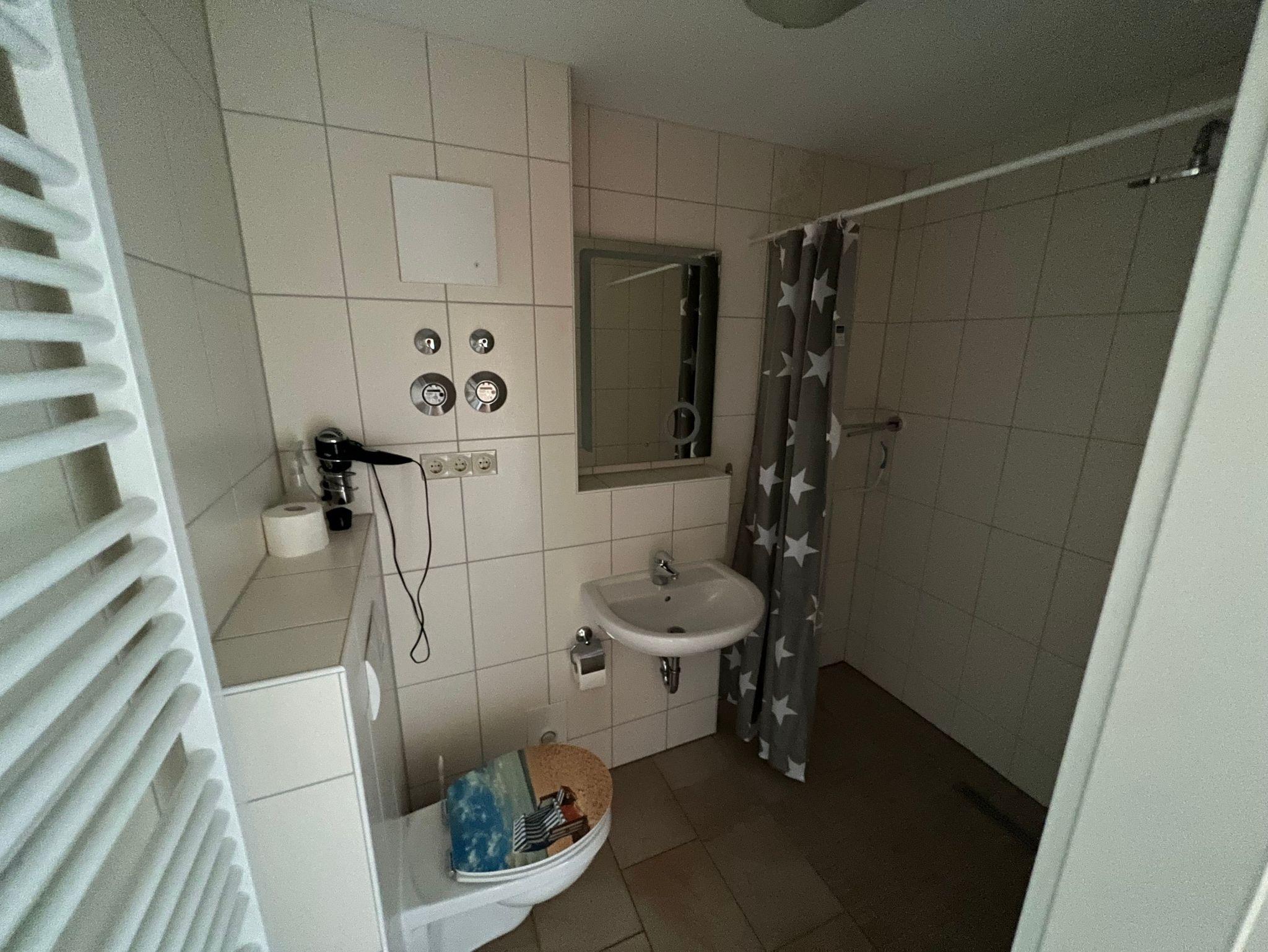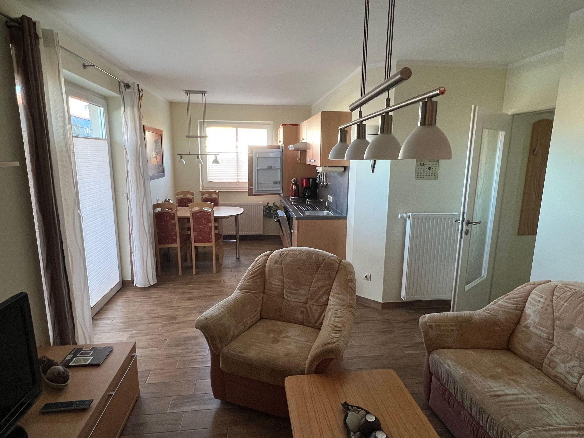 Sie finden in unserer Ferienwohnung 2 SZ, 1 WZ mit offener Küche und voll ausgestatteter Küchenzeile (Herd, Backofen, Spülmaschine., Kühlschrank, Kaffeemaschine, Toaster und Wasserkocher) vor, Bad mit WC, Dusche ebenerdig seniorengerecht.
