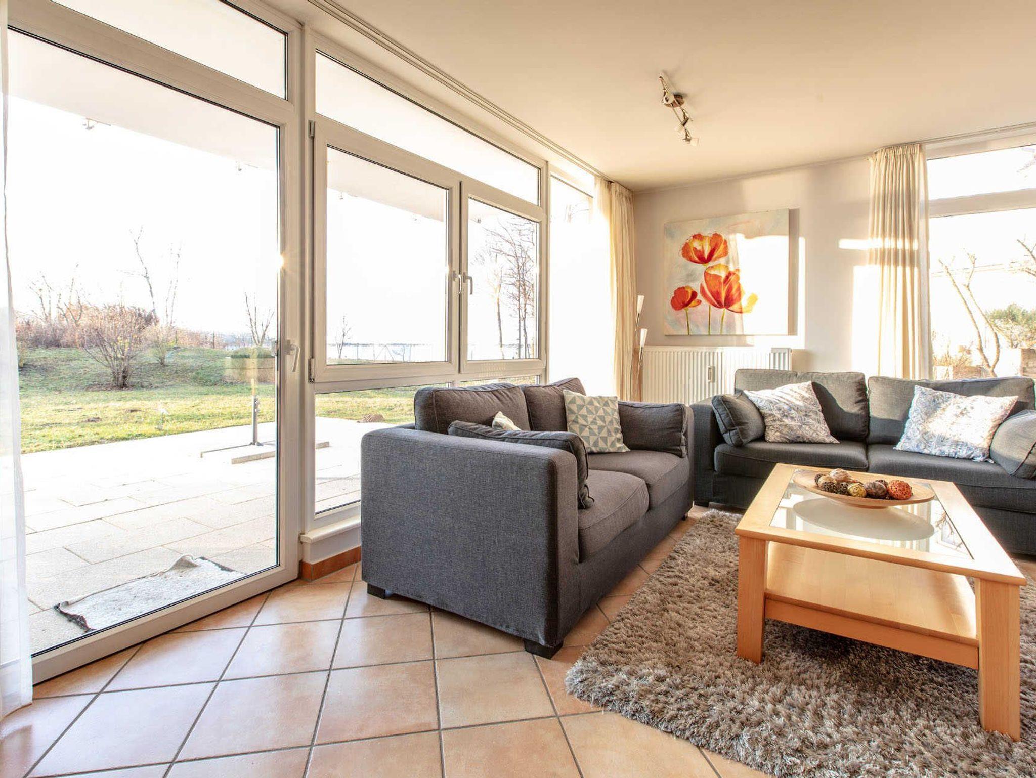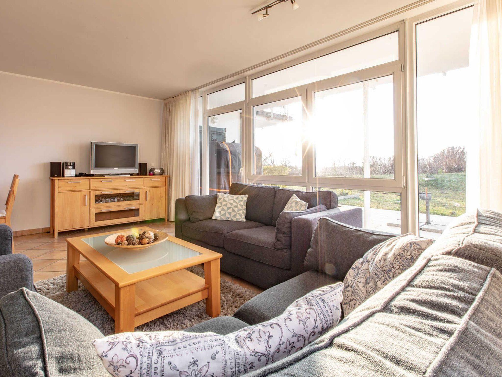 Wunderschöne 3-Zimmer-Wohnung mit traumhaften Blick auf das Salzhaff Erdgeschoss-Wohnung mit schöner Sonnenterrasse und eigenem Strandkorb auf der Terrasse. Wohnraum mit großer Schlafcouch und Couchtisch, Esstisch mit 6 Sitzplätzen, jeweils ein Flachbild - TV in den Schlafräumen, Stereoanlage, Einbauküche mit Geschirrspüler, Kühlschrank mit Gefrierfach, Kaffeemaschine, Wasserkocher, Toaster, 4-Platten-Herd (Ceran) mit Backofen, Mikrowelle, Schlafzimmer mit Doppelbett (180x200 - zwei einzelne Matratzen) und Kleiderschrank, Schlafzimmer mit Boxspringbett (160x200 - zwei einzelne Matratzen) und Kommode, Fußböden gefliest, Terrasse zum Südwesten und Blick auf das Salzhaff und eigenem Strandkorb (Zugang vom Wohnraum), der kostenfreie Parkplatz befindet sich am Haus. Kinderreisebett und Kinderhochstuhl sind kostenfrei zubuchbar. Nichtraucherwohnung, ein Haustier ist gestattet (50,00 EUR pro Aufenthalt = Haustierendreinigung). Wäschepaket mit Handtüchern und Bettwäsche zusätzlich buchbar (p.P. 25,00 EUR).