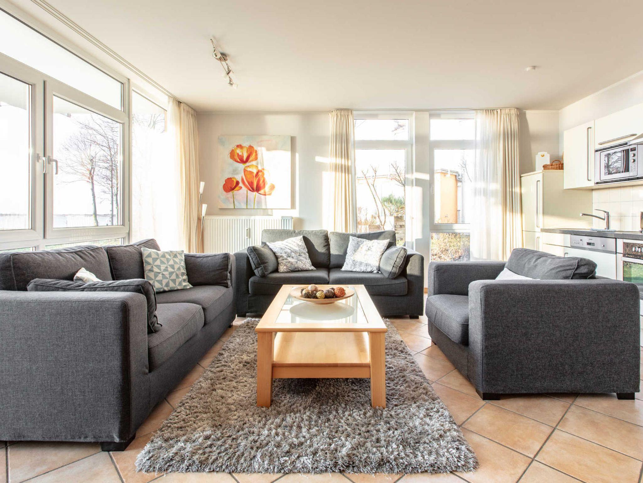 Wunderschöne 3 - Zimmer - Wohnung mit traumhaften Blick auf das Salzhaff. Erdgeschoss - Wohnung mit schöner Sonnenterrasse und eigenem Strandkorb. Wohnraum mit einer gemütlichen Couch und Couchtisch, Esstisch mit 6 Sitzplätzen, Flachbild - TV, Smart -TV, Bluetooth-Box, Radio, Einbauküche mit Geschirrspüler, Kühlschrank mit Gefrierfach, Kaffeemaschine, Wasserkocher, Toaster, 4 - Platten Herd (Ceran mit Backofen, Mikrowelle, Schlafzimmer mit Doppelbett (180 x 200 cm zwei einzelne Matratzen) und Kleiderschrank, Kinderzimmer mit Boxspringbett (160 x 200 cm zwei einzelne Matratzen) und Kommode, Fußböden gefliest.