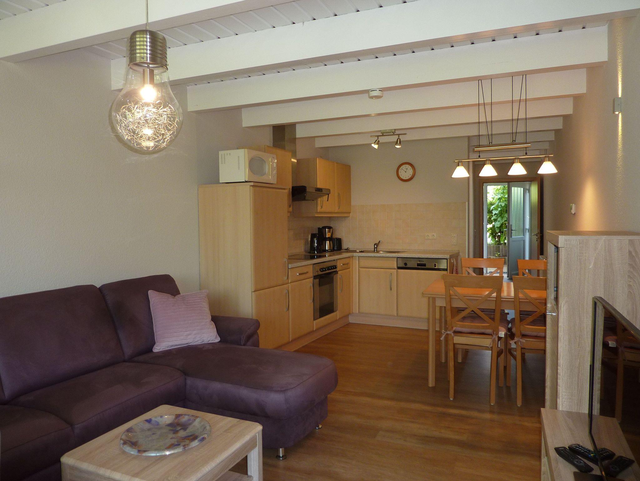 Die Ferienwohnung verfügt über einen großzügigen Wohnraum mit integrierter Küchenzeile, 2 Schlafräumen, Badezimmer mit Dusche und WC oben und ein WC unten. Weiterhin gibt es ein Kinderbett. Unsere Wohnung hat Balkon und Terrasse.