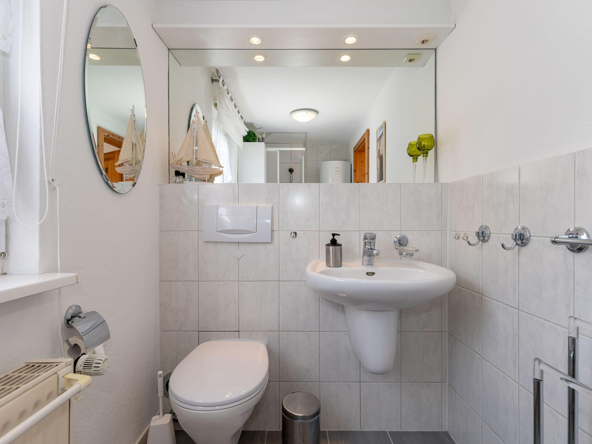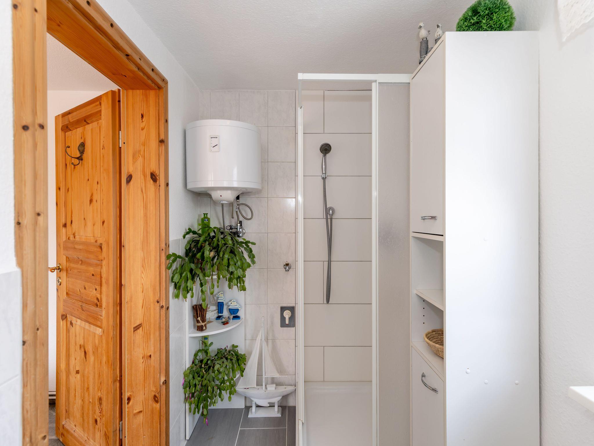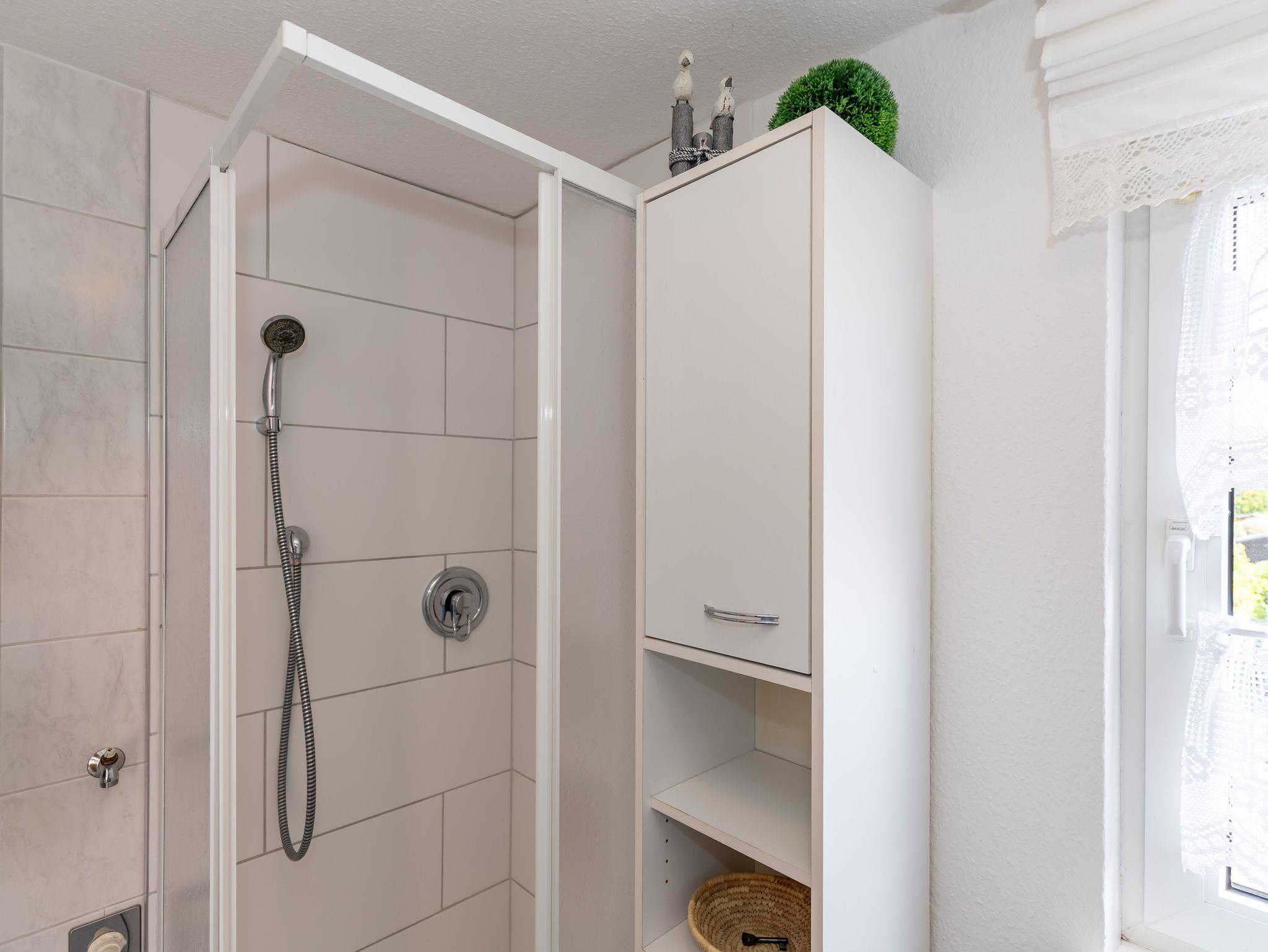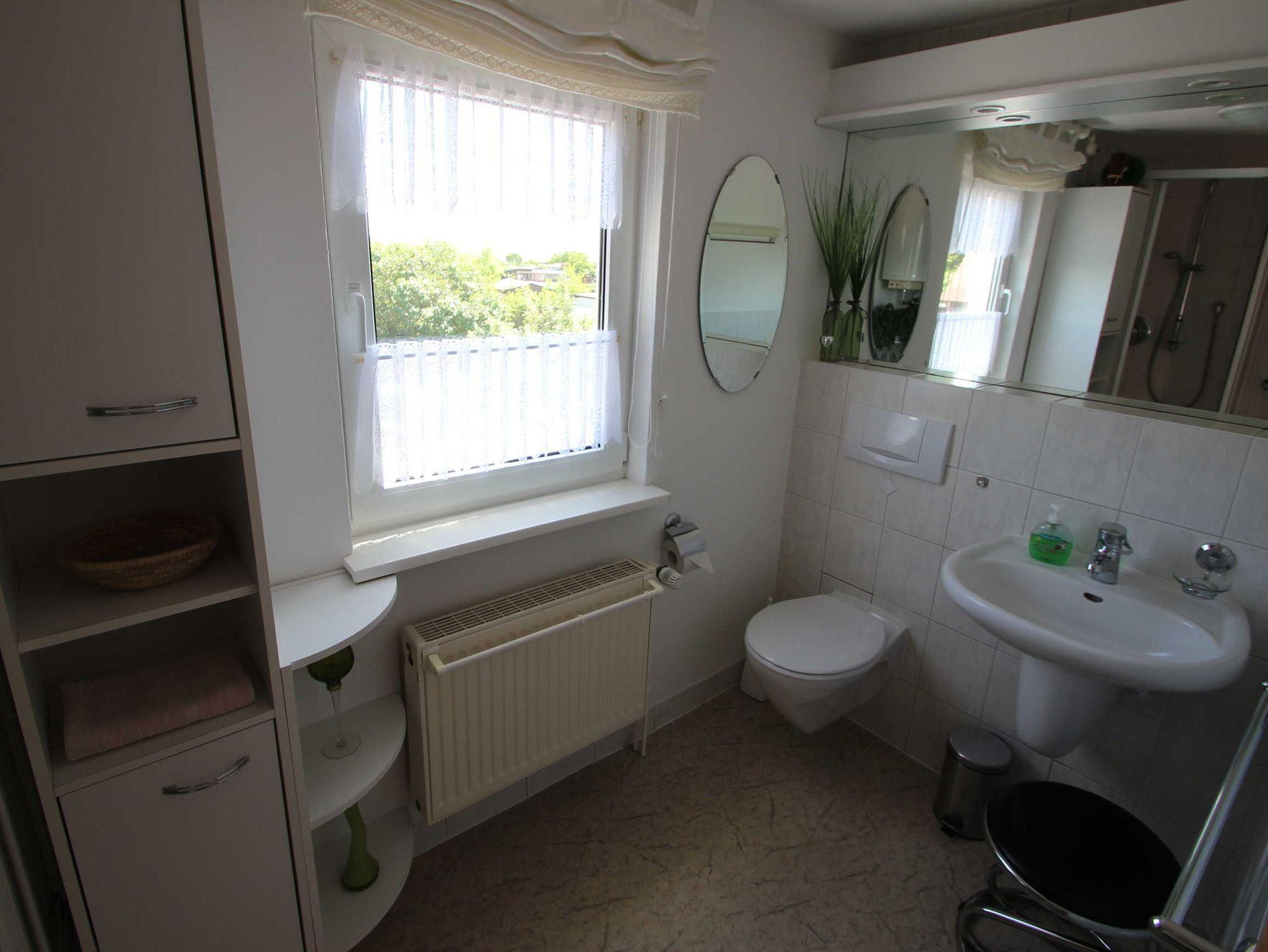 Das angrenzende Bad mit Tageslichtfenster verfügt über Waschbecken, WC und Dusche.