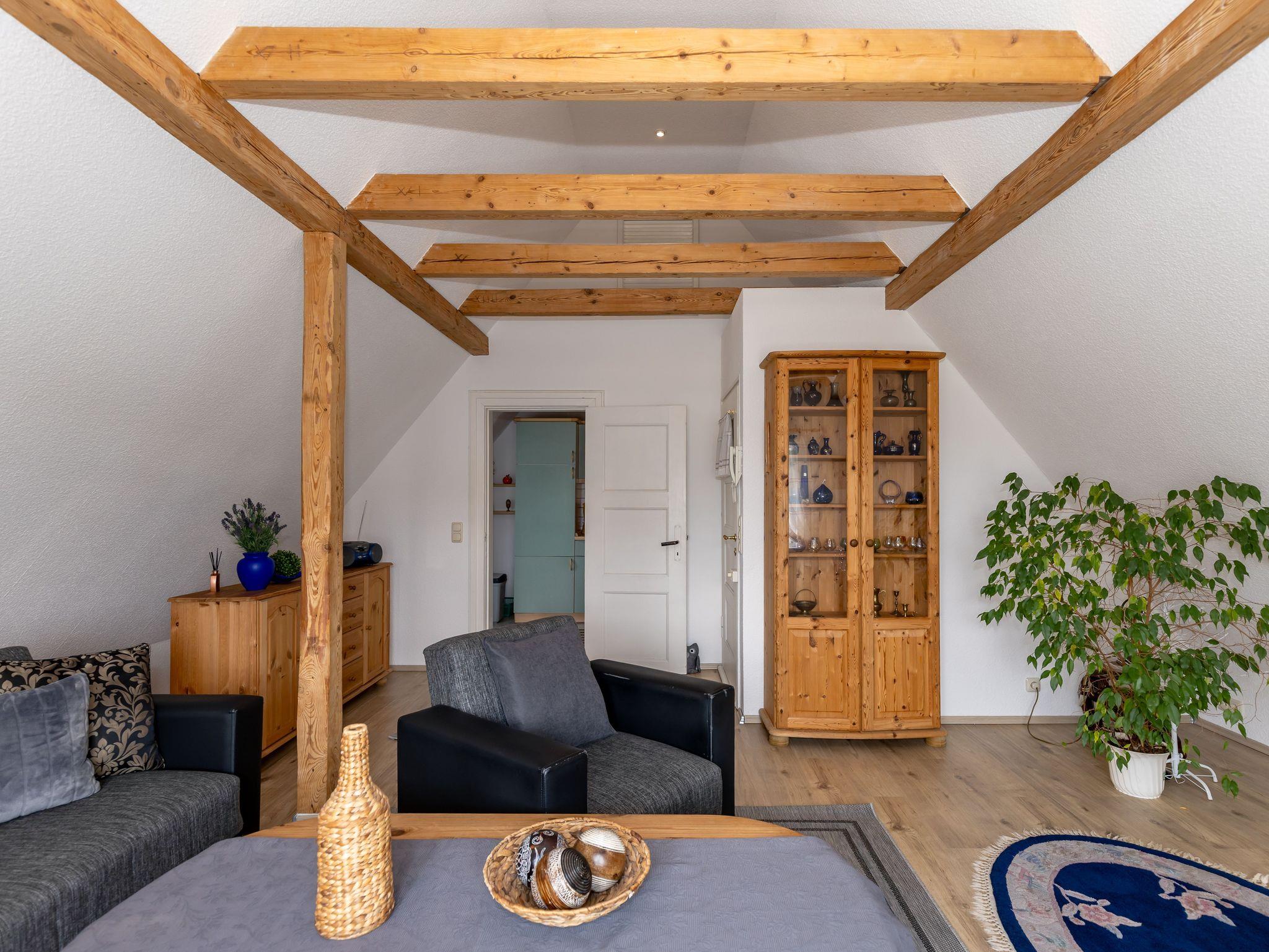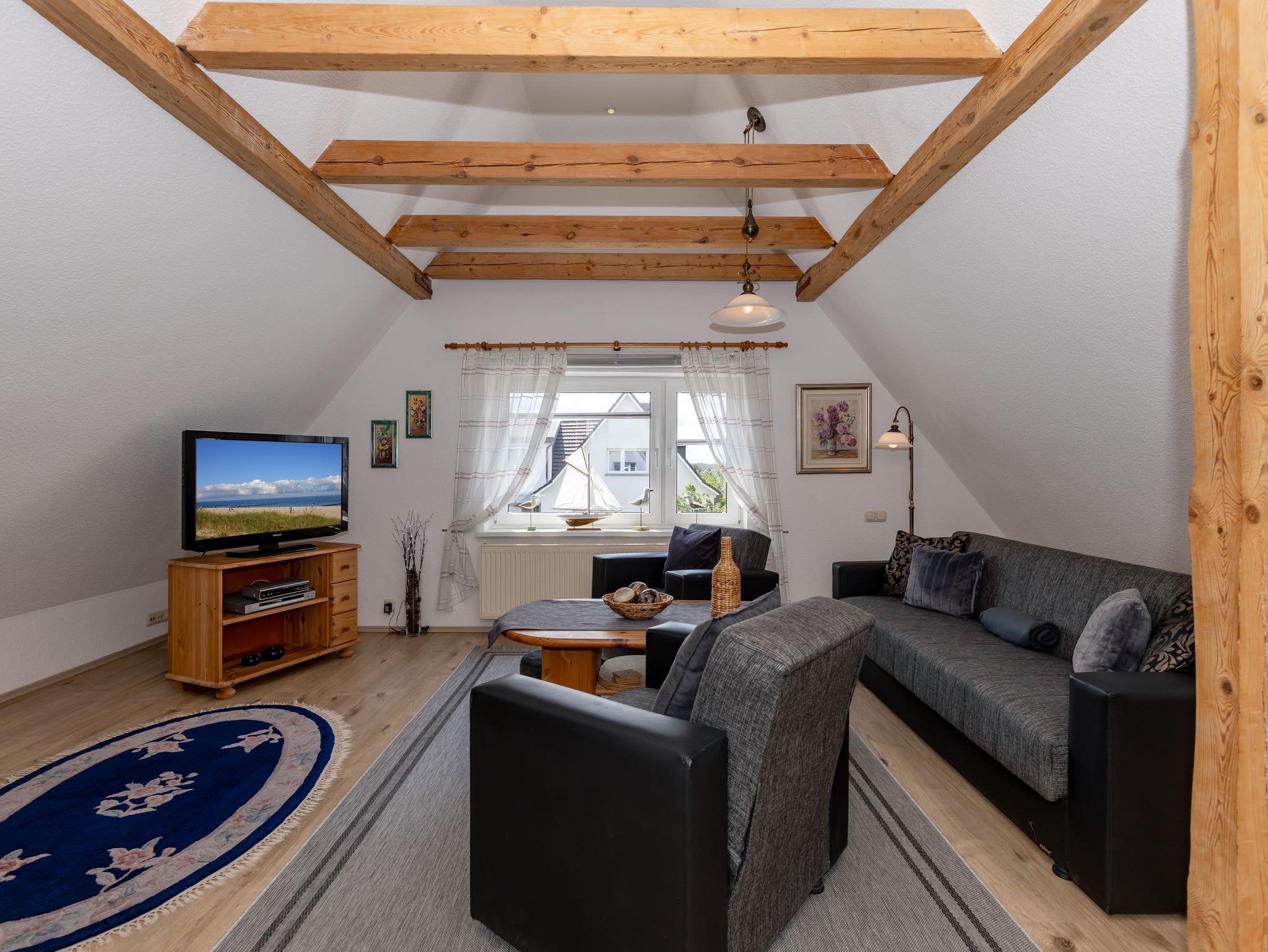 Das Wohnzimmer verfügt über eine moderne und sehr bequeme Couchgarnitur, einen Tv mit Sat-Anschluss, sowie ein CD-Radio. Durch das ausgebaute Spitzdach und die Herausarbeitung der Dachbalken bekommt das Wohnzimmer ein wohlig warmes Ambiente. Vom Wohnzimmer aus gelangen Sie in die separate, voll ausgestattete Küche mit Wasserkocher, Kaffeemaschine, Toaster, 4-Platten-Kochfeld, Backofen, Kühlschrank (ohne Gefrierfach), ausreichend Geschirr und Kochutensilien. Tisch und Stühle sind ebenfalls vorhanden.