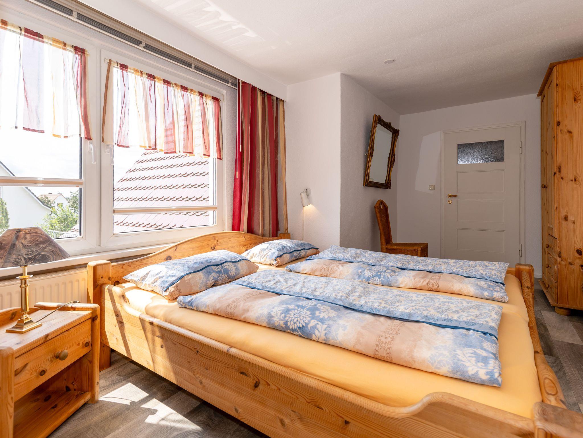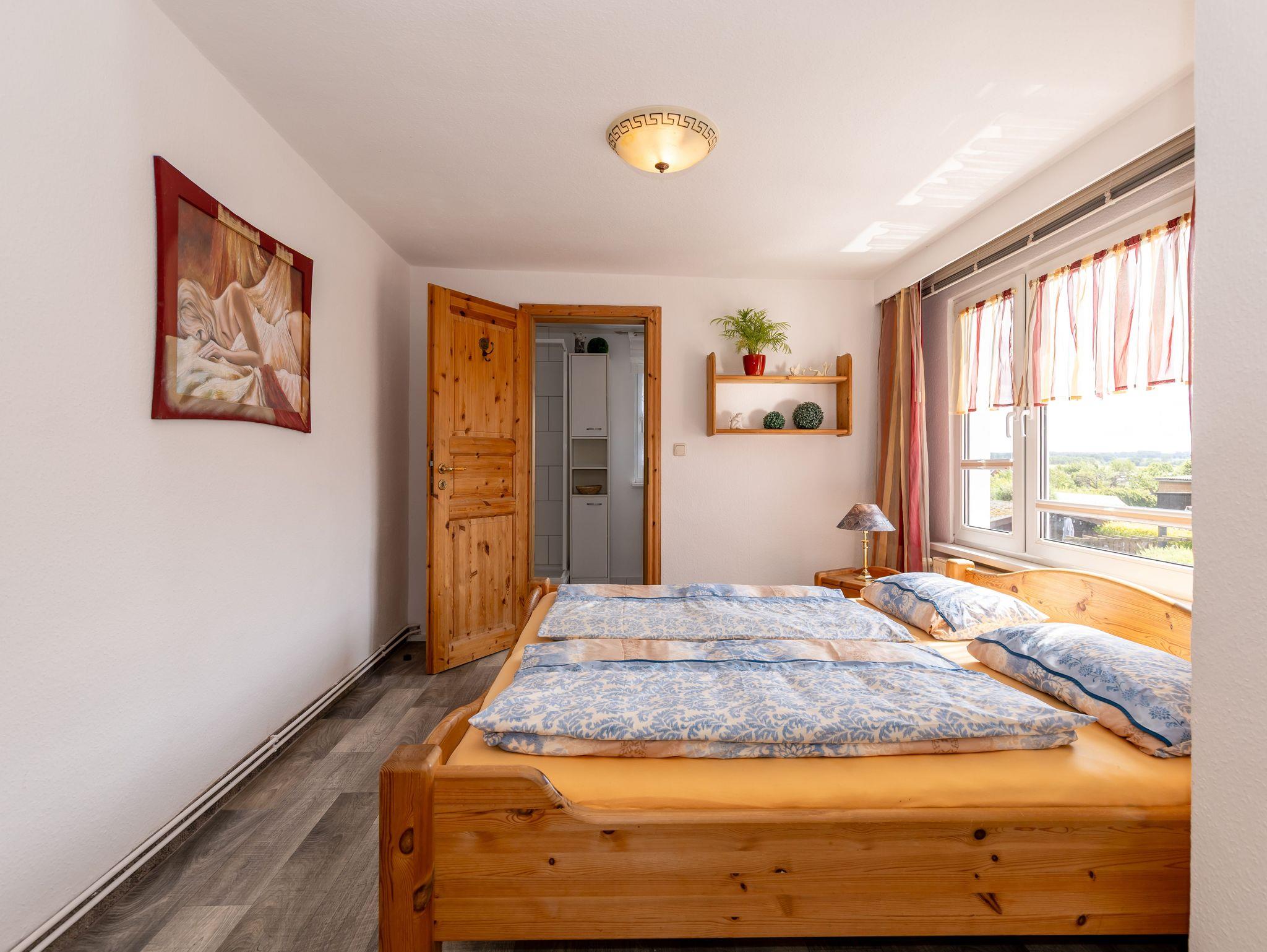 Das Schlafzimmer ist ausgestattet mit einem Kleiderschrank, einem Ganzkörperspiegel, einem Doppelbett (1,80 x 2,00) mit manuell verstellbaren Lattenrosten und einem herrlichen Blick in den Garten. Hier können Sie abends gemeinsam die Sternschnuppen zählen und werden morgens von der Sonne wachgekitzelt.