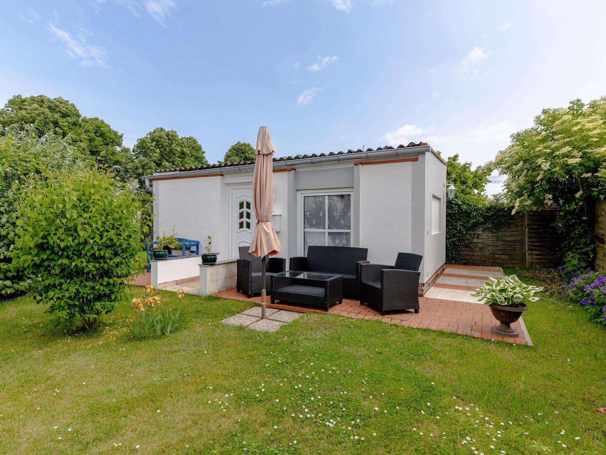 Zu dieser Wohnung gehört eine Gartenterrasse und Sitzgelegenheiten im Garten, zum Sonnetanken, Lesen oder zum Lauschen des Vogelgezwitschers.