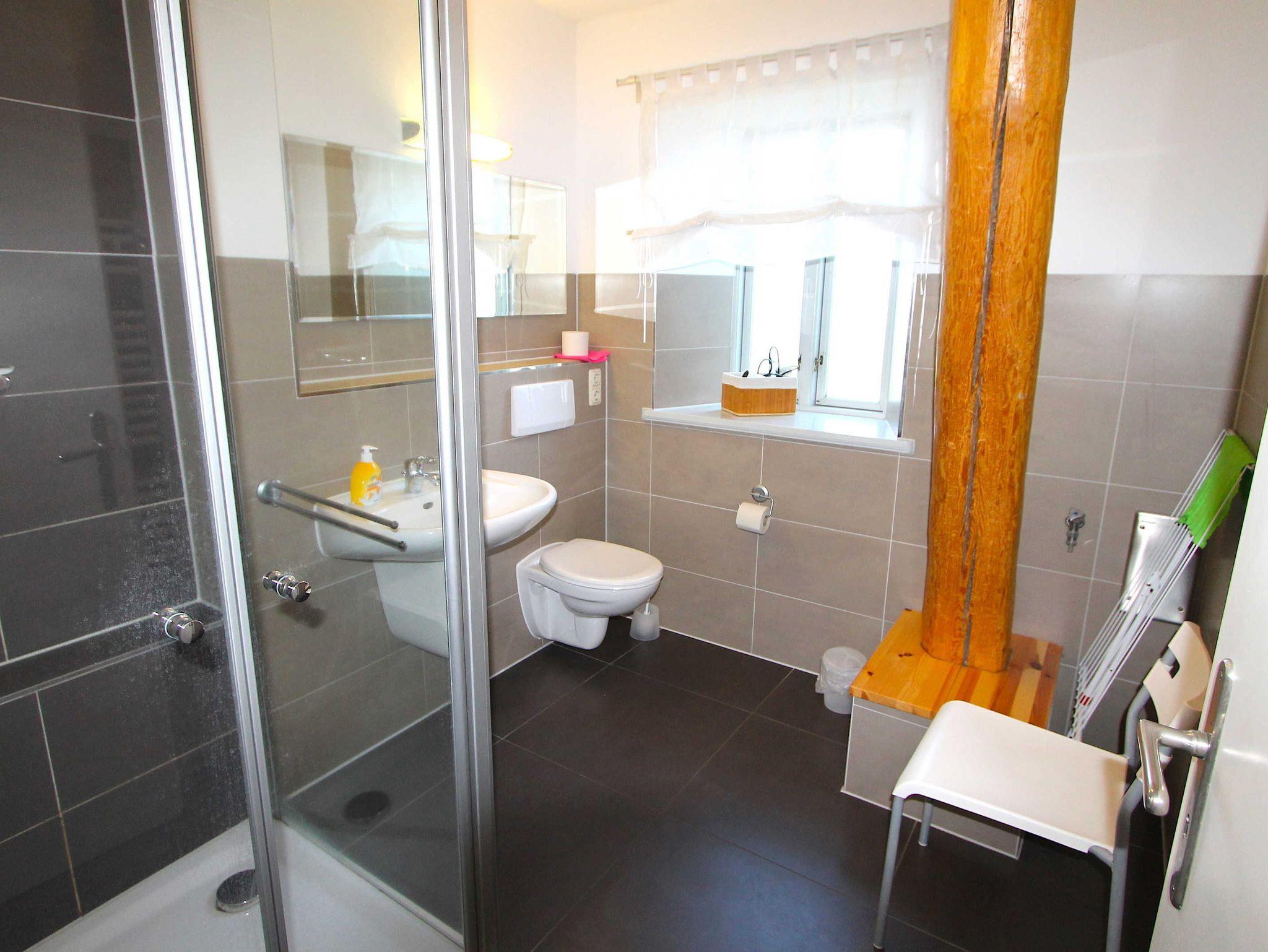 Im geräumigen Badezimmer befinden sich eine Dusche und WC.