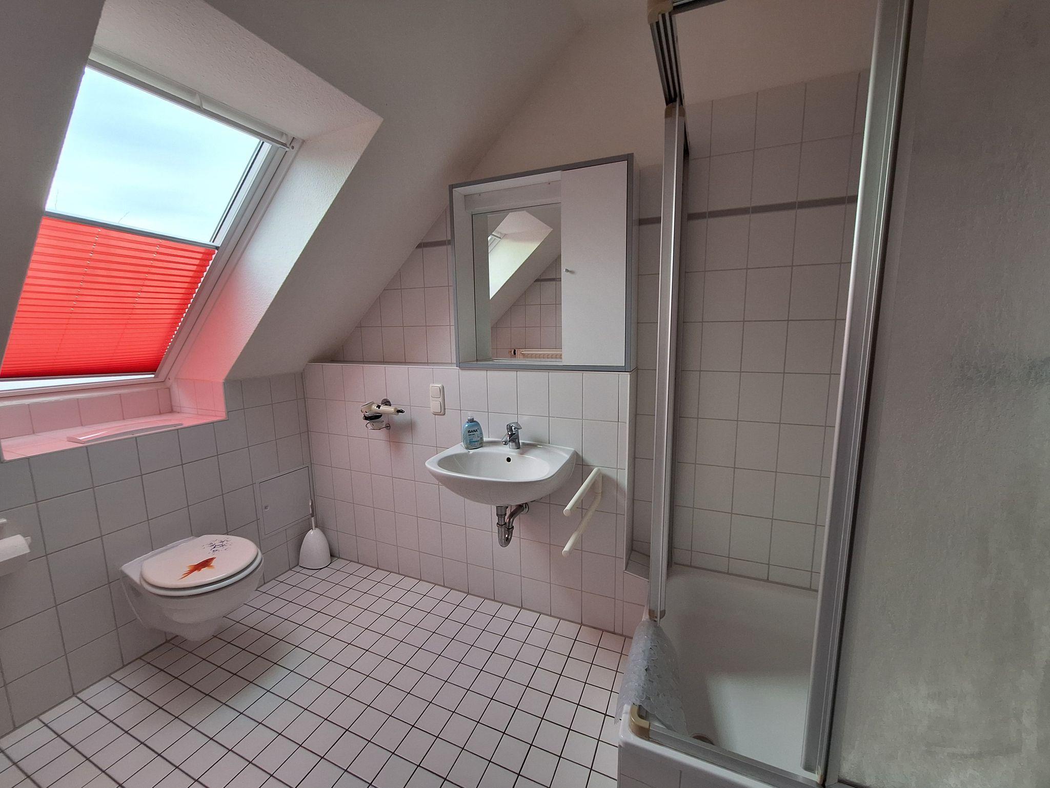 Sie finden ein geräumiges Tageslicht- Badezimmer mit Dusche u. WC vor.