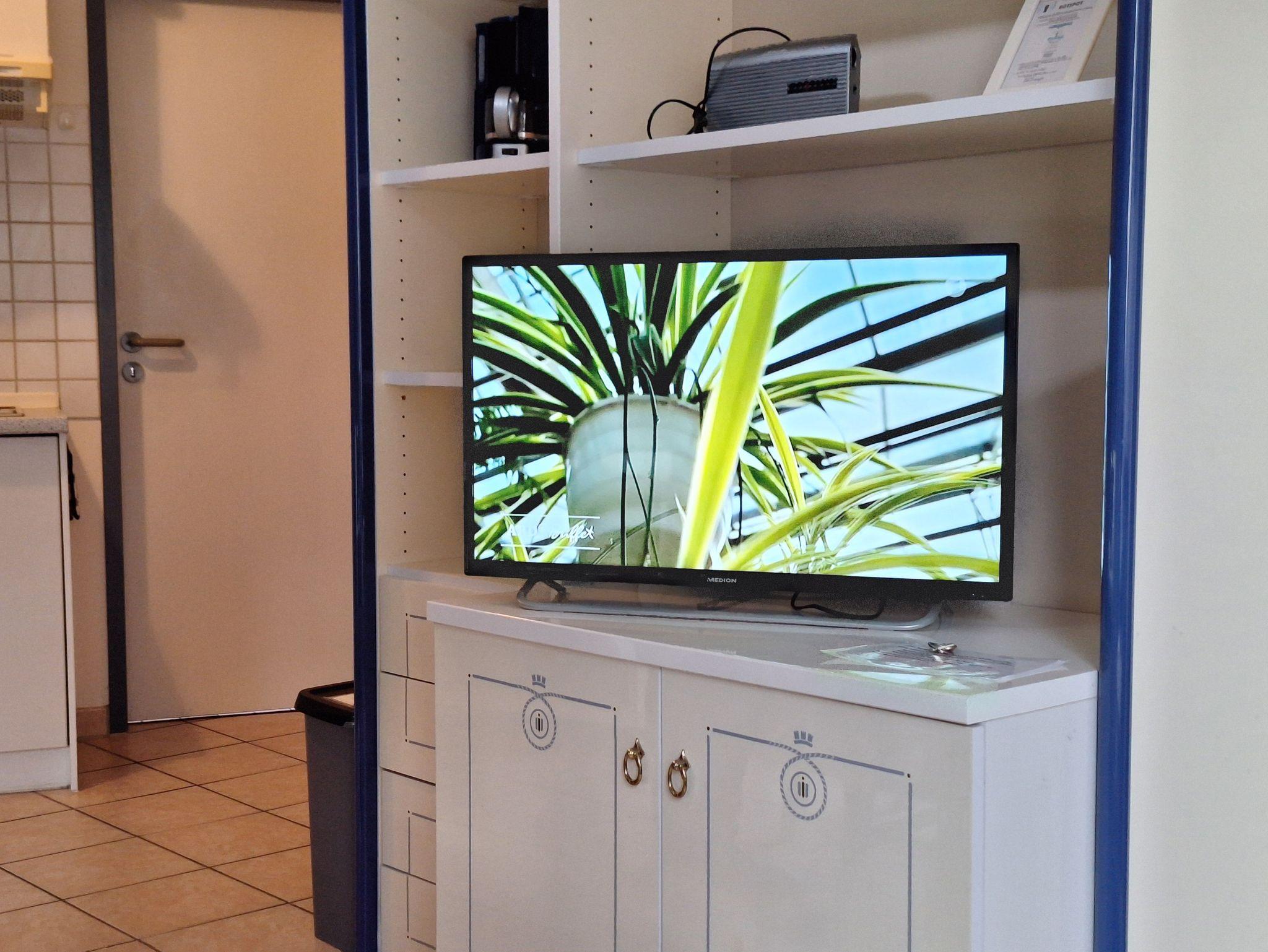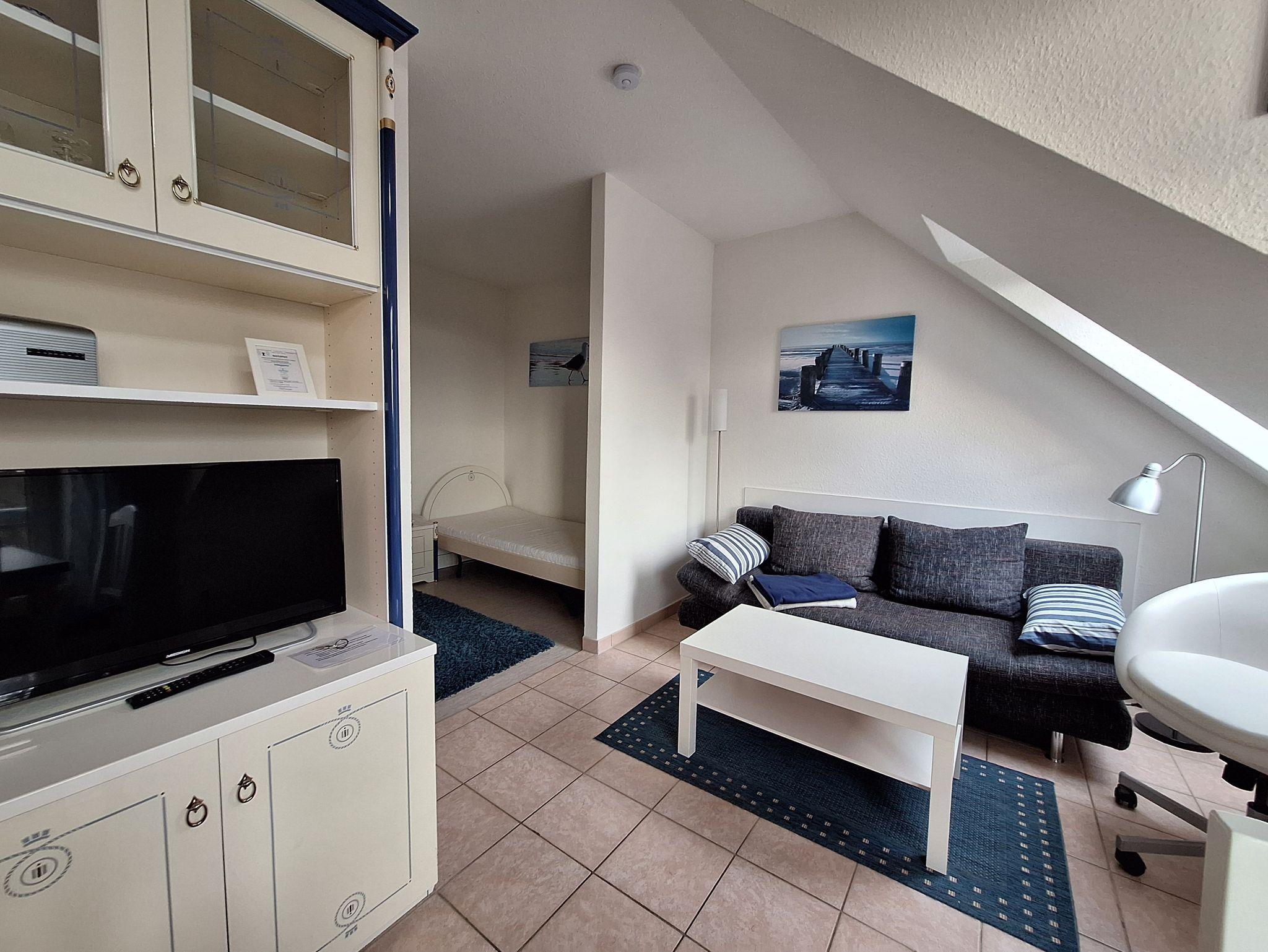 Das Wohnzimmer ist ausgestattet mit einer Schlafcouch, Sat-TV und integriertem Essbereich. Angrenzend ist eine Küchenzeile mit Kühlschrank und Gefrierfach, 2-Platten-Herd, Mikrowelle, Senseo- und Filter- Kaffemaschine, Wasserkocher u. Toaster.