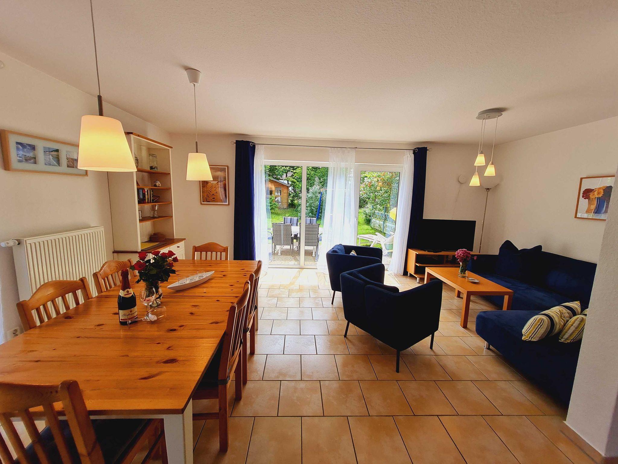 Ein großer gemütlicher Holzesstisch mit Holzstühlen sorgt für die richtige Atmosphäre beim Speisen.