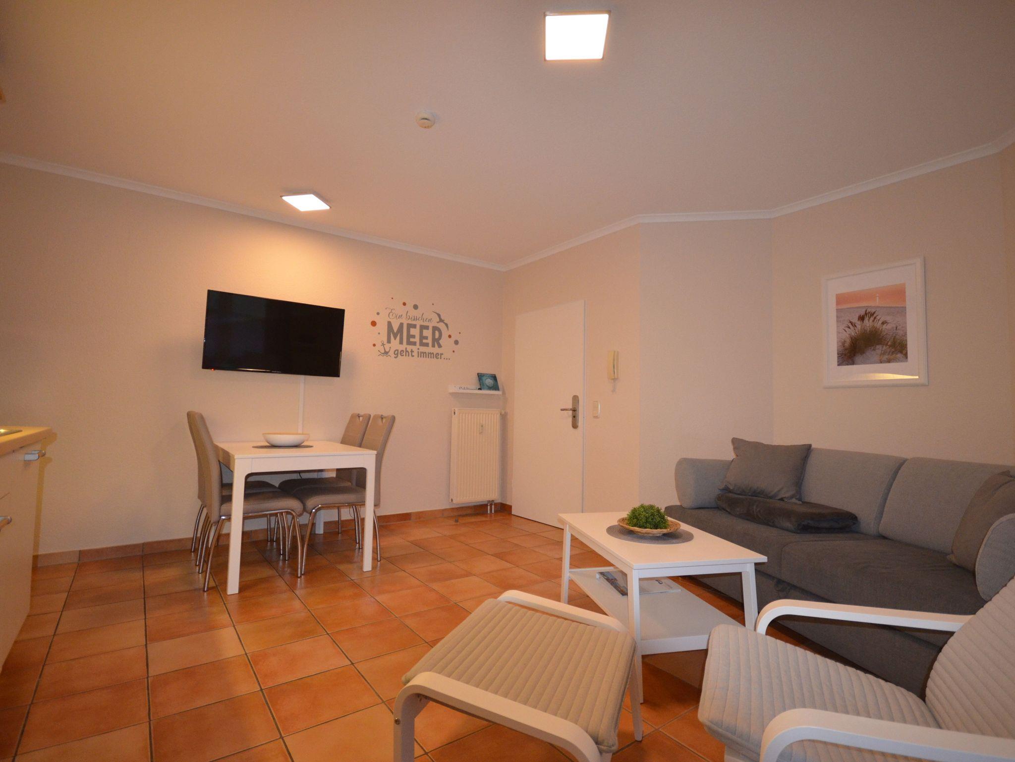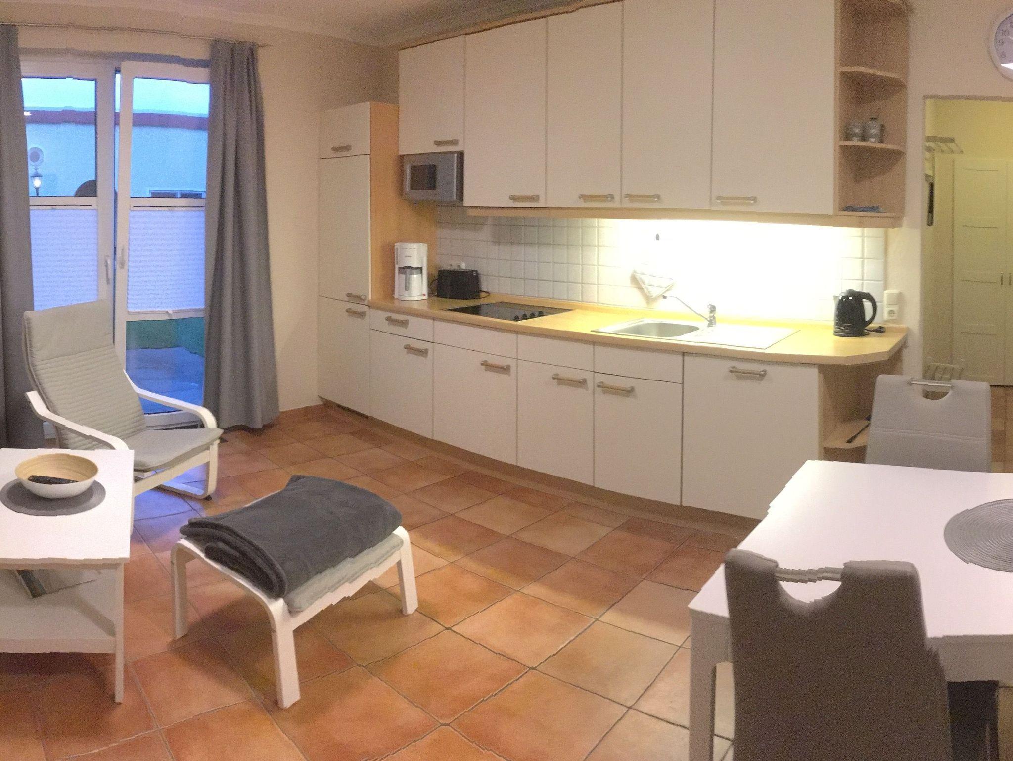 Kleine moderne Ferienwohnung mit Terrasse, einem Schlafzimmer sowie einer Schlafcouch im Wohn-Essbereich für insgesamt 4 Personen. In der Küchenzeile stehen neben der Spülmaschine und dem Herd natürlich auch eine Mikrowelle, eine Kaffee- und Senseo-Kaffeemaschine zur Verfügung. Fernseher, Radio, sind ebenso vorhanden, wie kostenfreies WLAN.