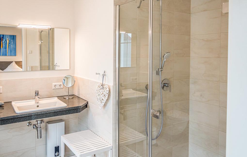 - Jeweils mit ebenerdiger Dusche, Waschtisch, Spiegel, WC und Haartrockner