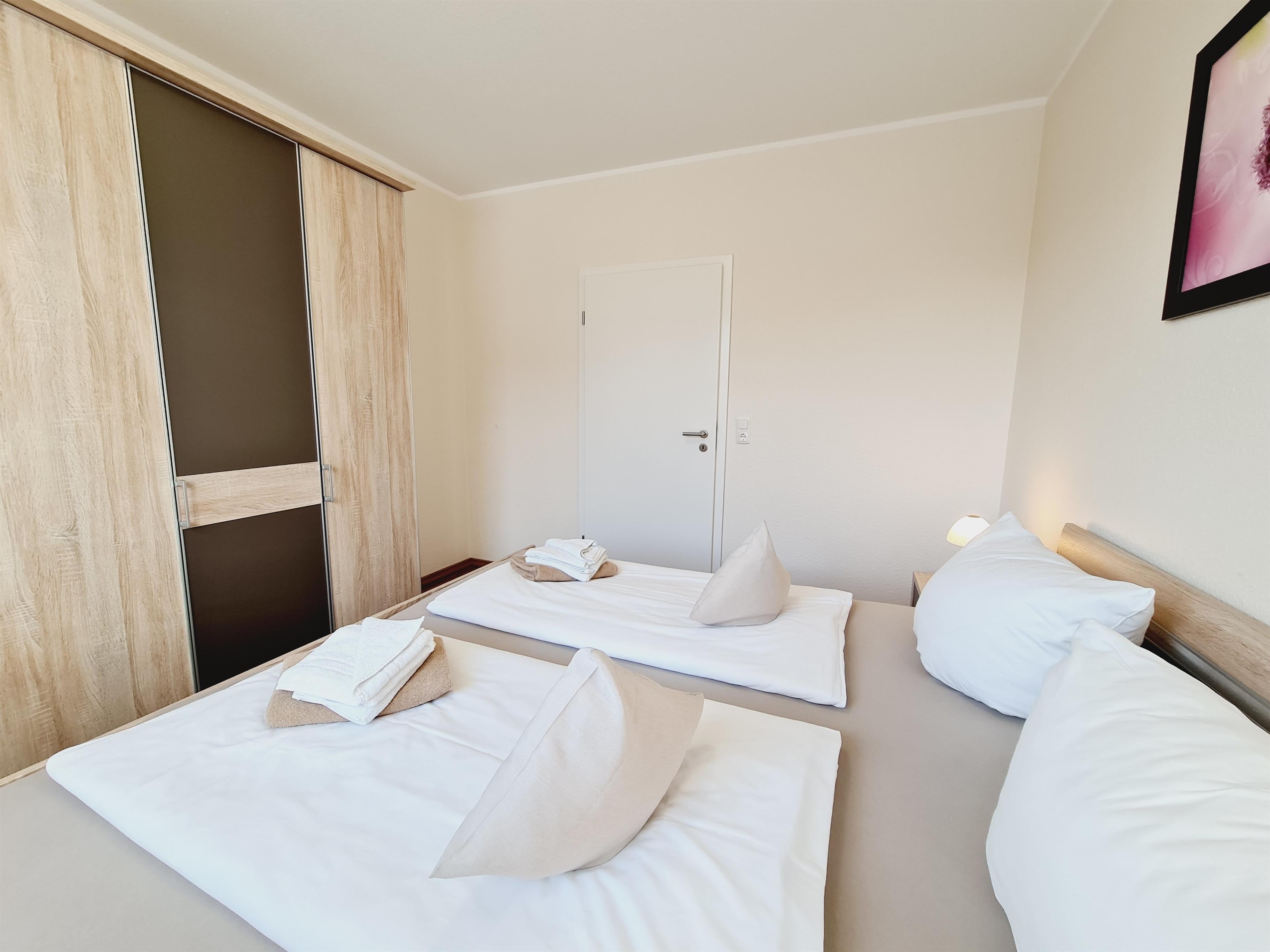 Die Fewo 'Gorch Fock' , 71qm, mit einer großen Terrasse liegt im Erdgeschoss und verfügt über zwei Schlafzimmer. Die offene Küche, in weiß/Lack mit einer Holzoptikarbeitsfläche, ist mit allem Komfort wie Geschirrspüler, Kühlschrank mit Gefrierfach, Mikrowelle, Cerankochfeld, erhöhter Backofen, Granitspüle, Kaffeemaschine, Gewürzen usw. ausgestattet. Der weißgelackte Esstisch mit den bequemen Schwingstühlen bietet Platz für 6 Personen. Der gemütliche Wohnraum mit Kamin ist mit einer dunkelroten Leder-Komfortsitzecke und einem behaglichen Fernsehsessel ausgestattet. Ein großer 50 Zoll-Smart TV, Blu-Ray-Player, sowie Spiele, Bücher und Umgebungskarten sind vorhanden. Das helle, schöne Badezimmer mit Tageslichtfenster ist in rot/weiß gehalten, mit einem anthrazitfarbenen Waschtisch, 1m x 1m Dusche und Badewanne, Fußbodenheizung und Radio ausgestattet. Der geräumige Flur und ein separater Abstellraum bieten viel Platz. Die Wohnung hat ein Schlafzimmer mit einem Doppelbett (180 x 200 cm) und einem weiteren 41 Zoll Smart TV. Das weitere Schlafzimmer nebenan besteht aus 2 Einzelbetten jeweils mit einer Liegefläche von 90 x 200 cm. An allen Fenstern und Türen befinden sich elektrische Rollläden.
