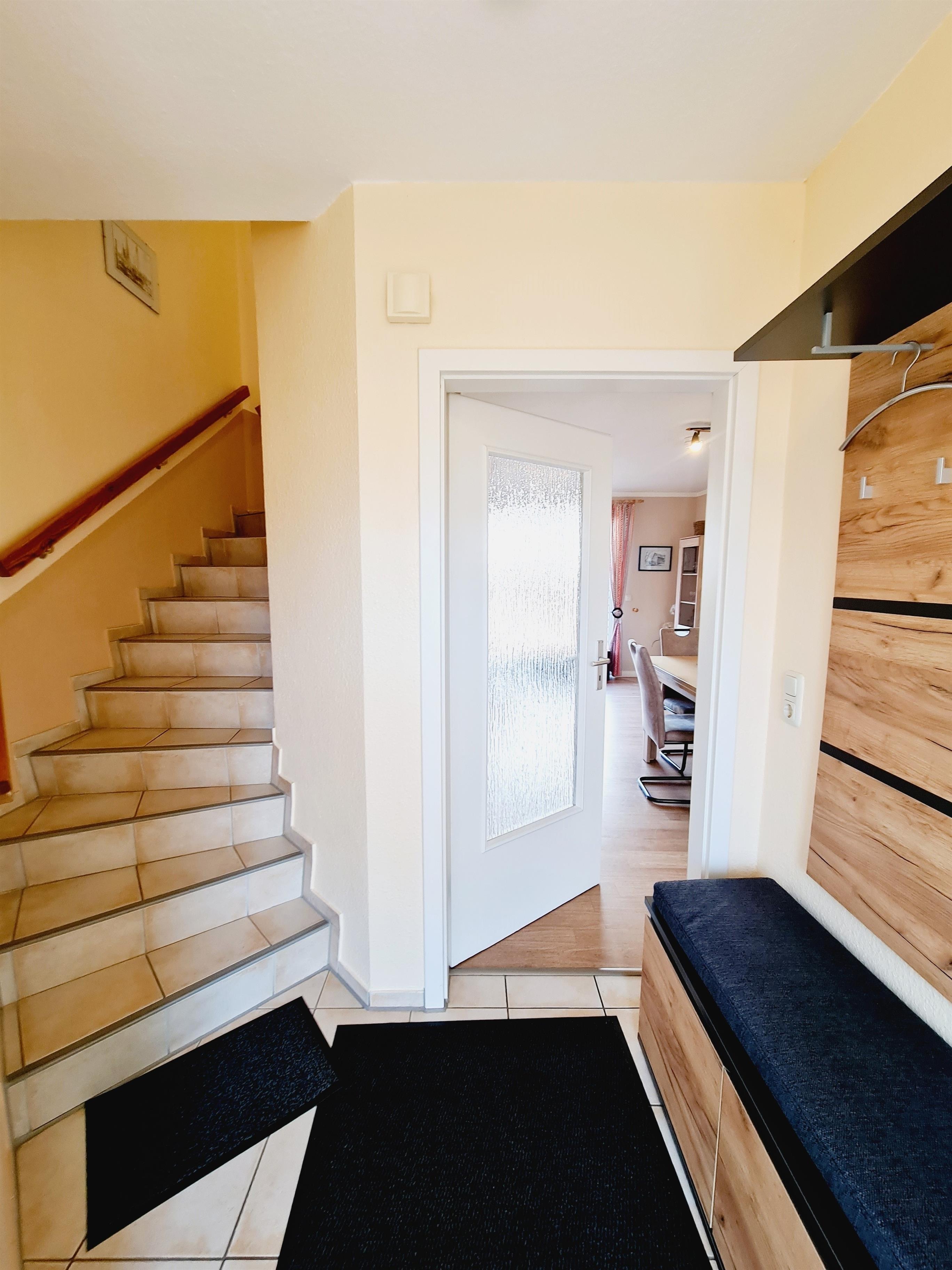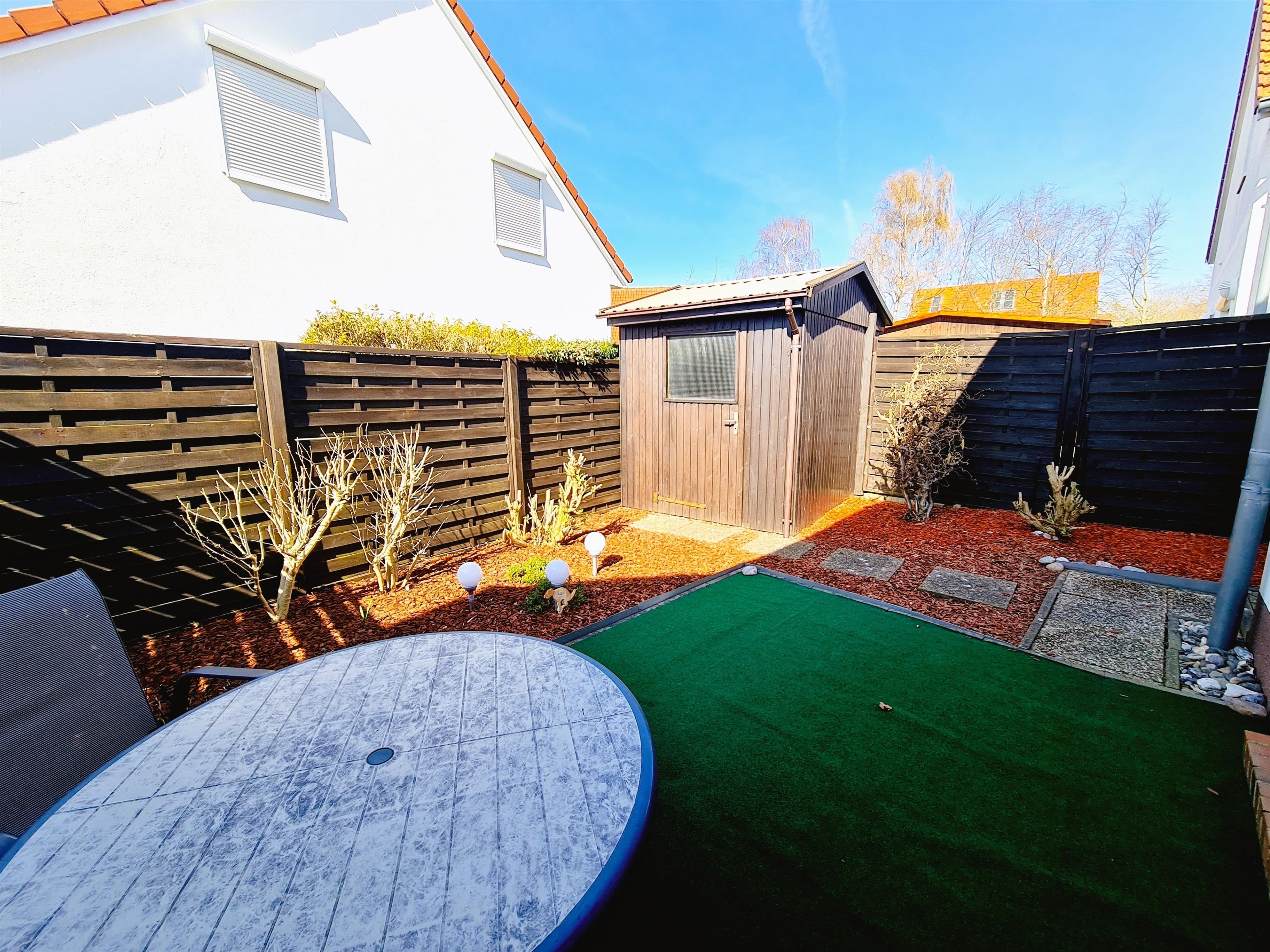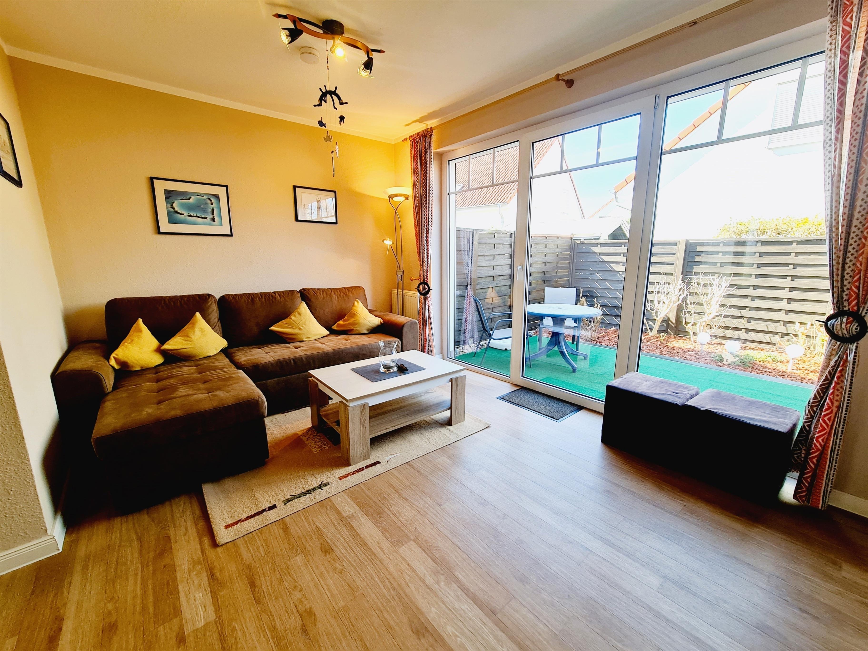 Ferienhaus mit Garten hintere Teil eingezäunt mitTerrasse. Das Ferienhaus bietet 65 qm Wohnfläche über 2 Ebenen. Im Erdgeschoss des Ferienhauses befindet sich der Wohn- Essbereich mit gut ausgestatteter Küche (Mikrowelle, Kühlschrank, Herd mit Backofen, Geschirrspüler usw. Gäste WC und Abstellraum.