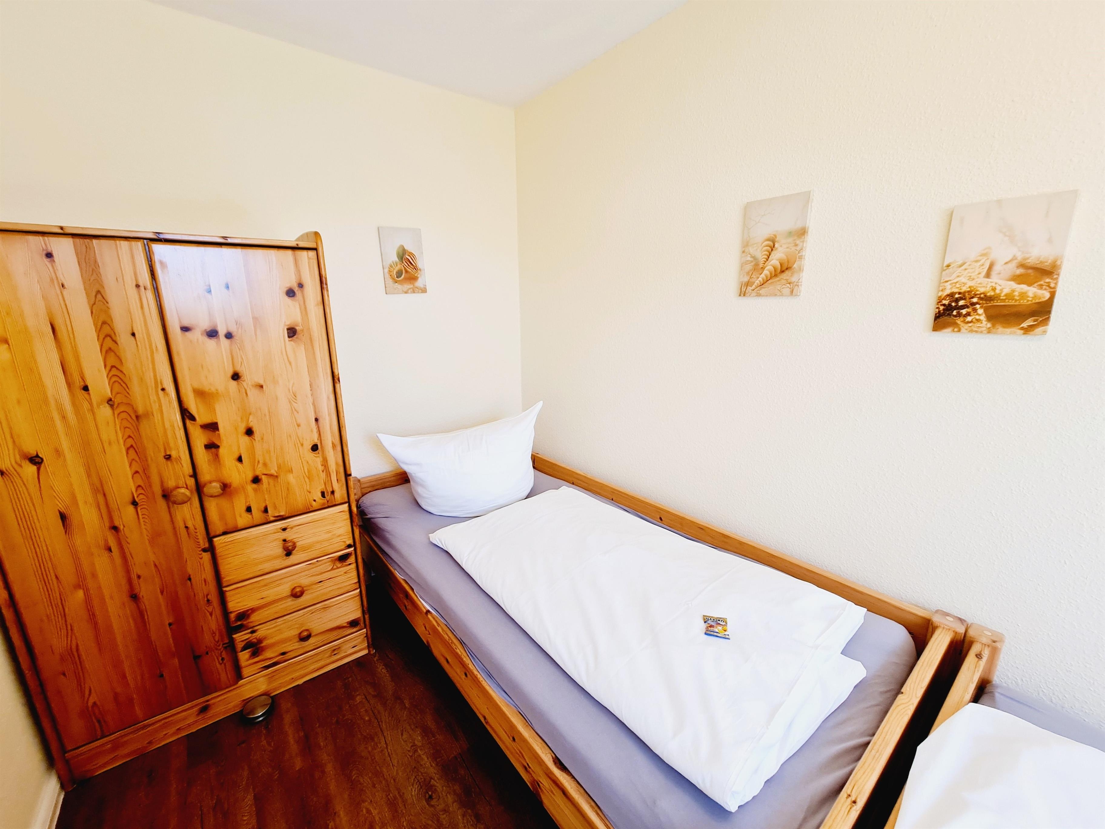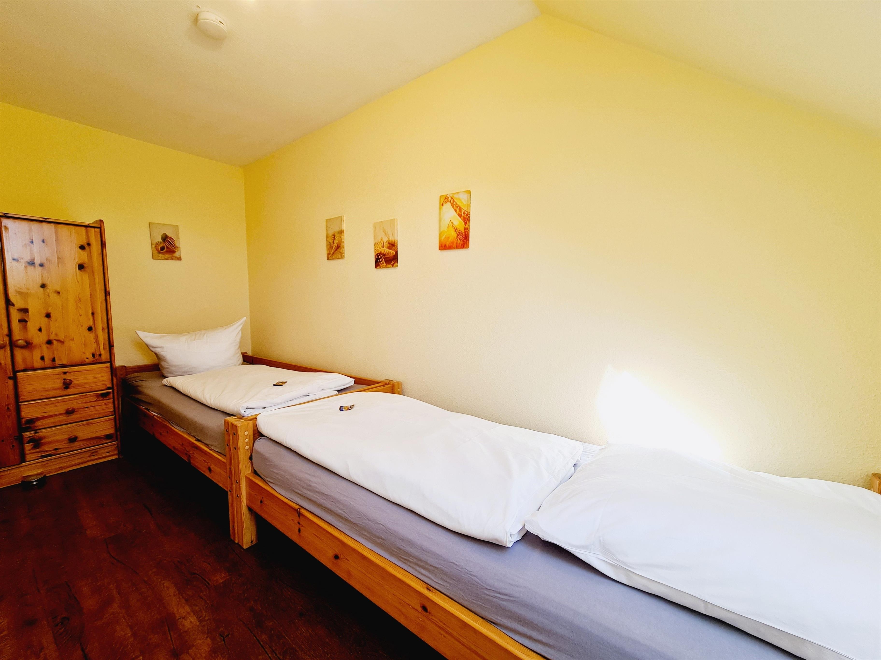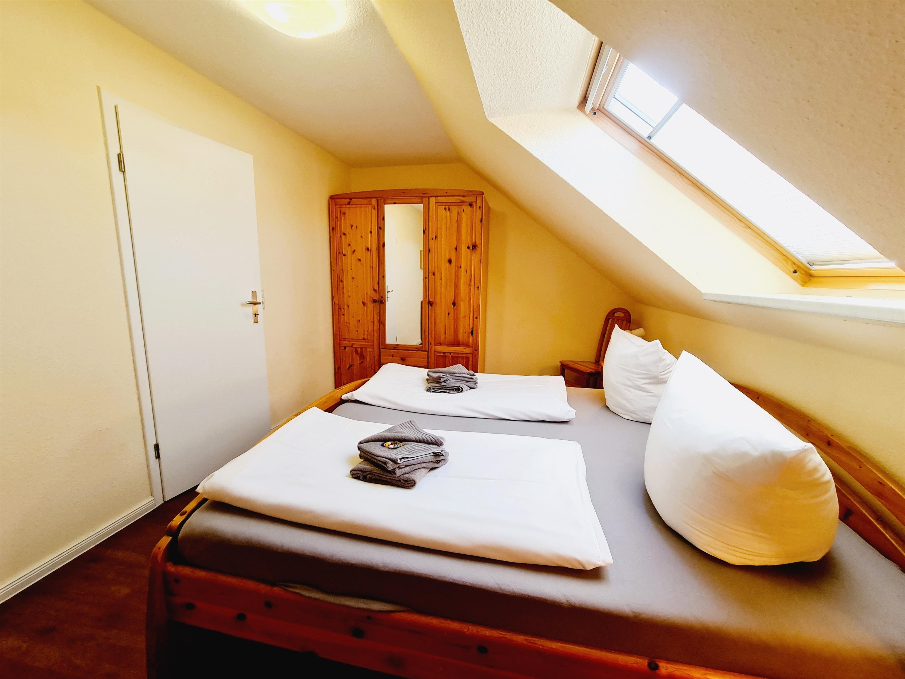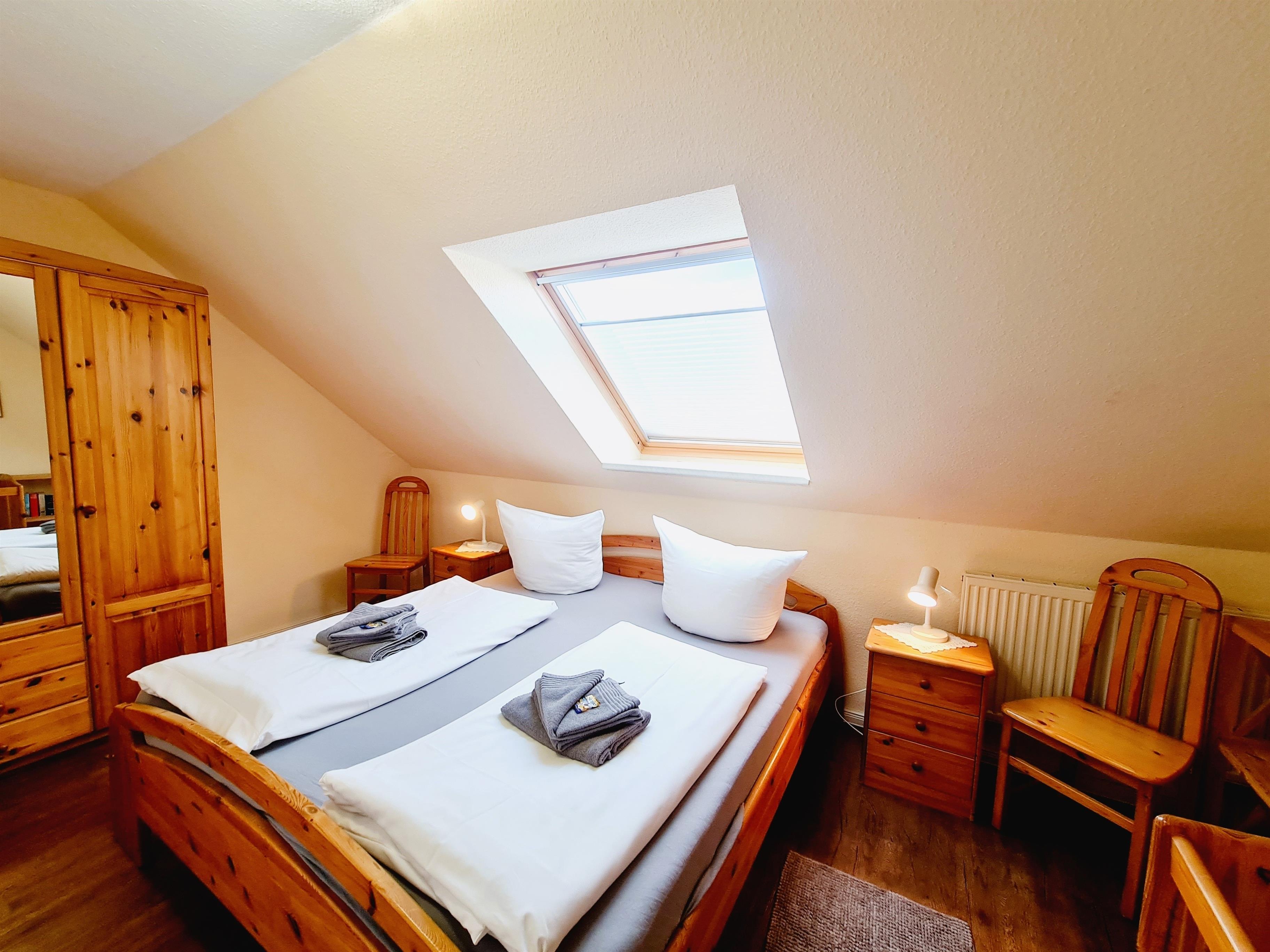 Die 1. Etage des Ferienhauses verfügt über 2 Schlafräume (Doppelbett + Kinderbett / 2 Einzelbetten), Duschbad mit WC. Zur Ausstattung des Ferienhauses gehören außerdem Bügeleisen, Bügelbrett, Fön, Kinderstuhl, E-Grill und das Gartenhaus.