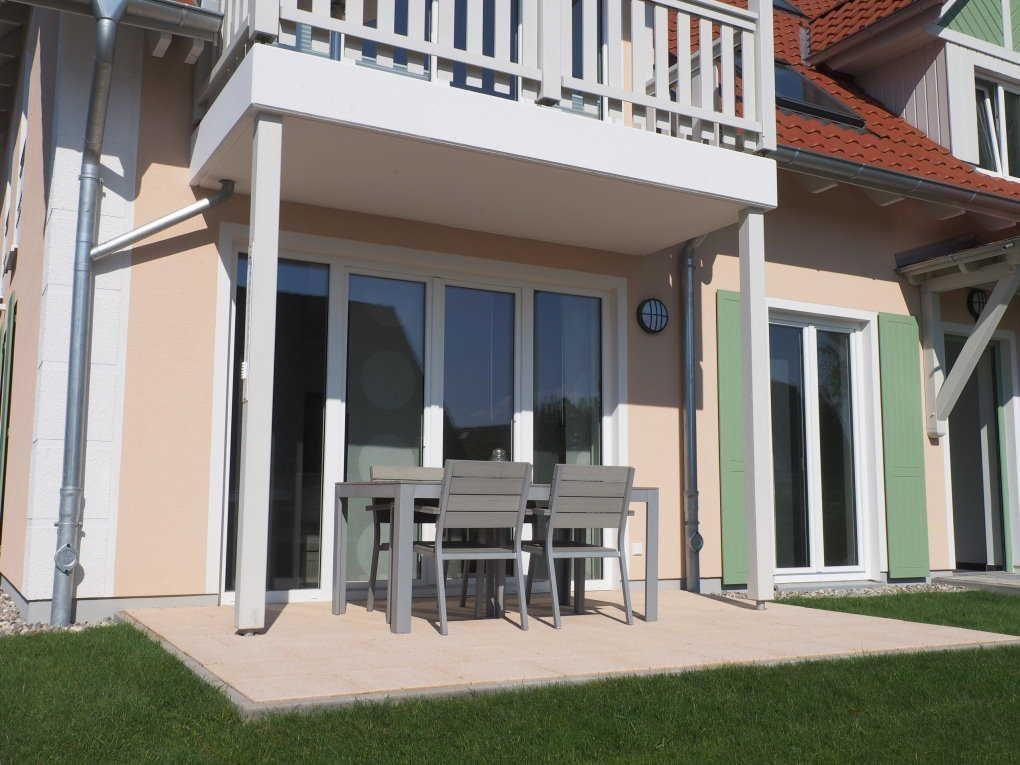Vom Wohnzimmer aus gelangen Sie direkt auf die Westterrasse mit Gartenmöbeln, auf der Sie den Sonnenuntergang in aller Ruhe genießen können – ein perfekter Rückzugsort für entspannte Urlaubsmomente.