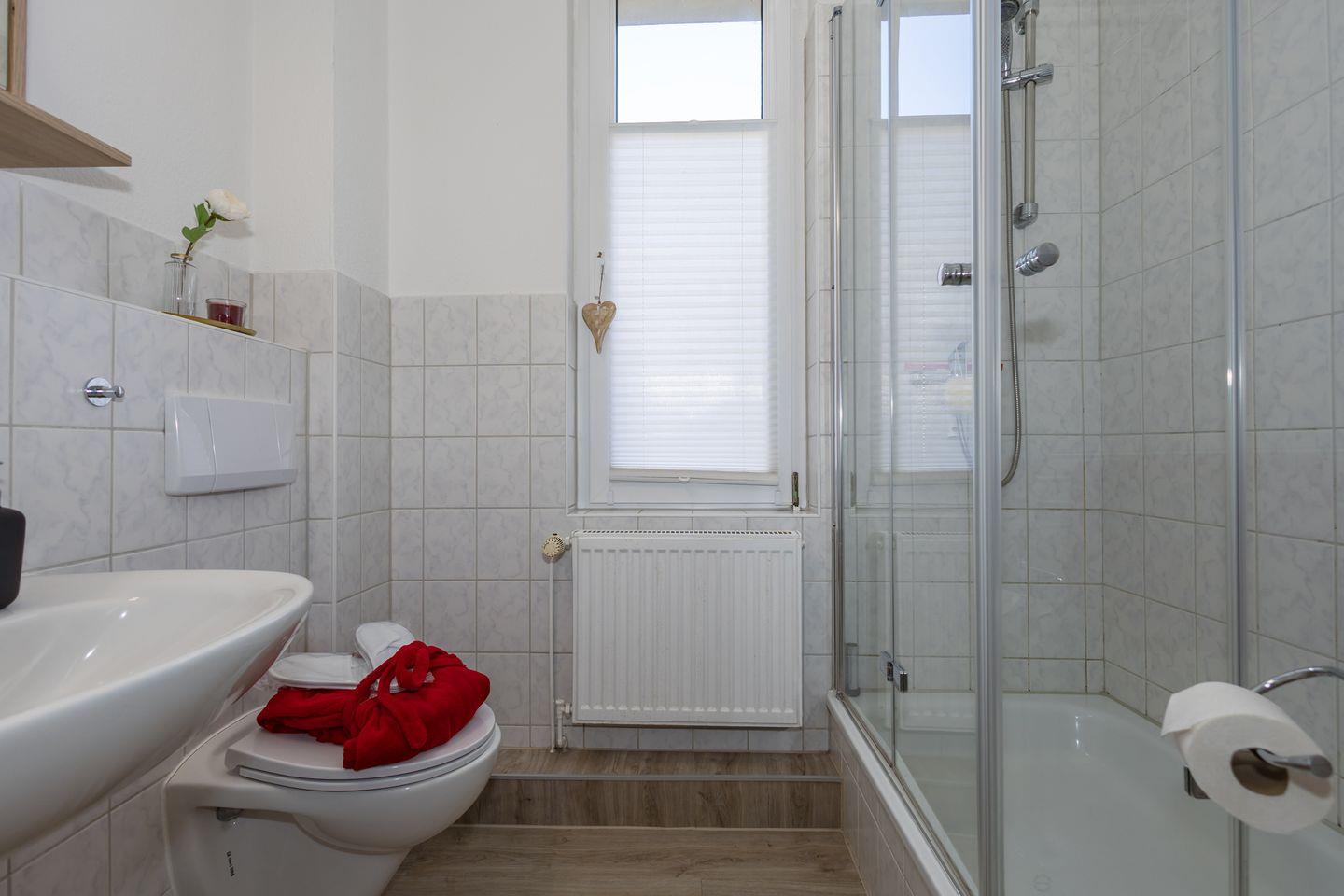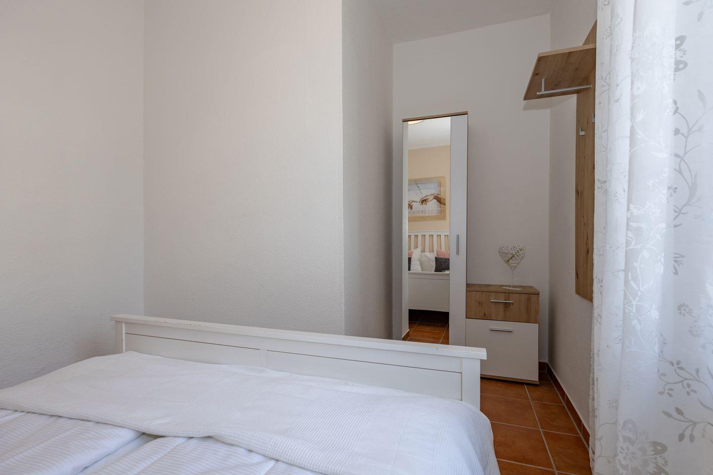 Das Badezimmer ist funktional ausgestattet und verfügt über eine Dusche, ein WC, ein Waschbecken, einen Spiegel sowie einen Haartrockner und bietet warmes Wasser. Für Ihre Sicherheit ist ein Rauchmelder installiert, und die Ferienwohnung ist als Nicht-Raucher-Unterkunft ausgewiesen. Eine Garderobe und eine Kommode erleichtern die Unterbringung Ihrer Kleidung und persönlichen Dinge.