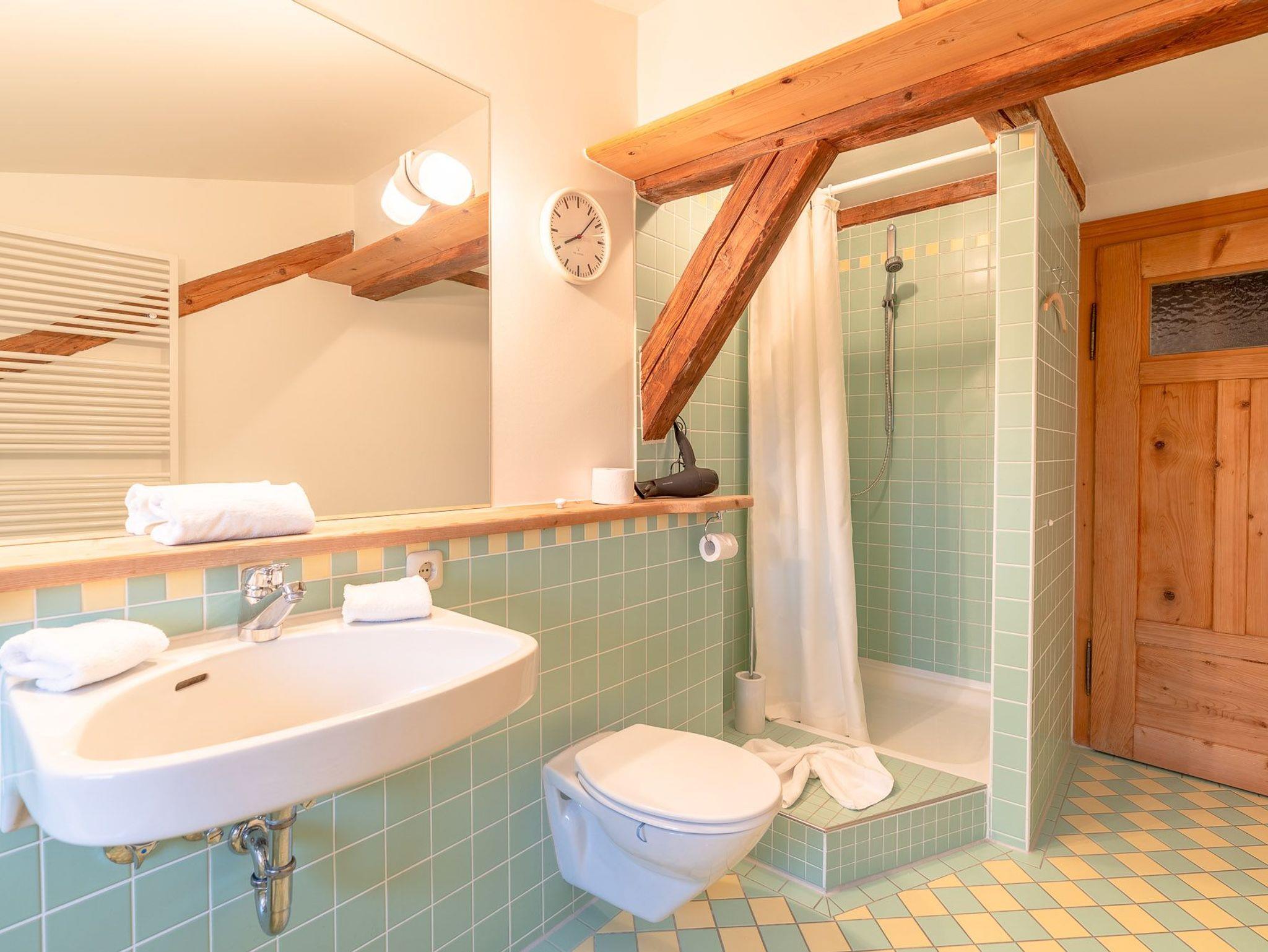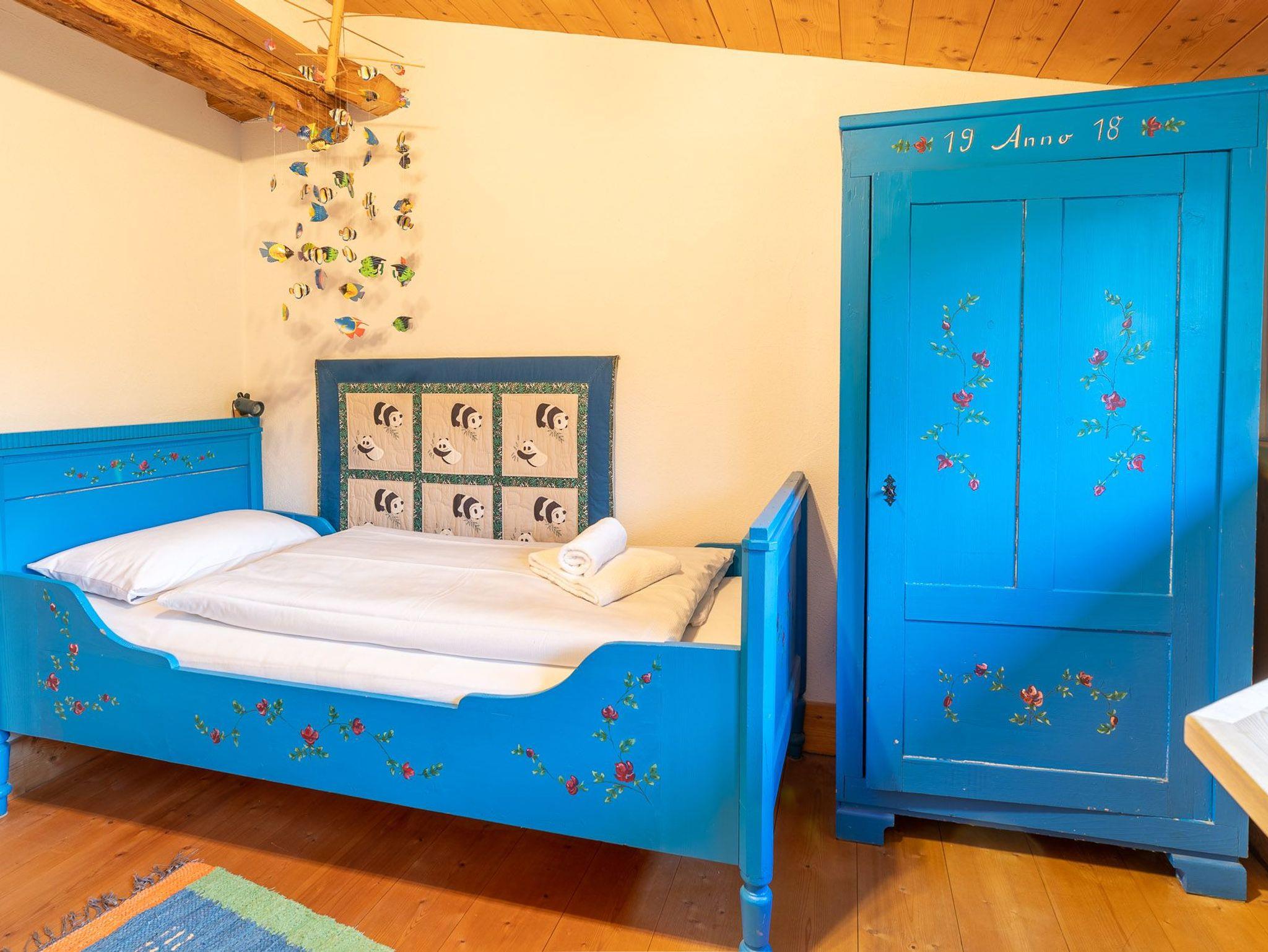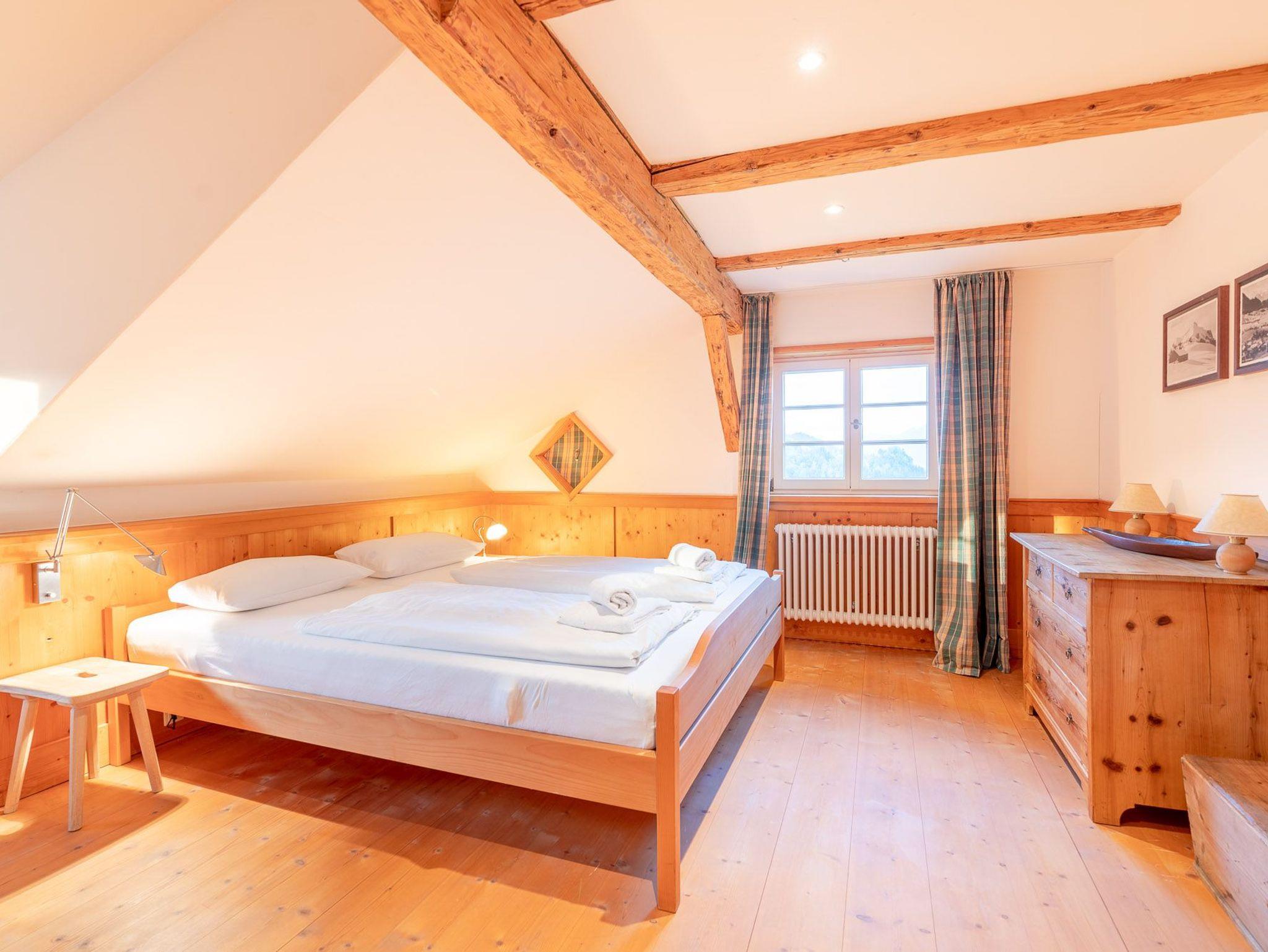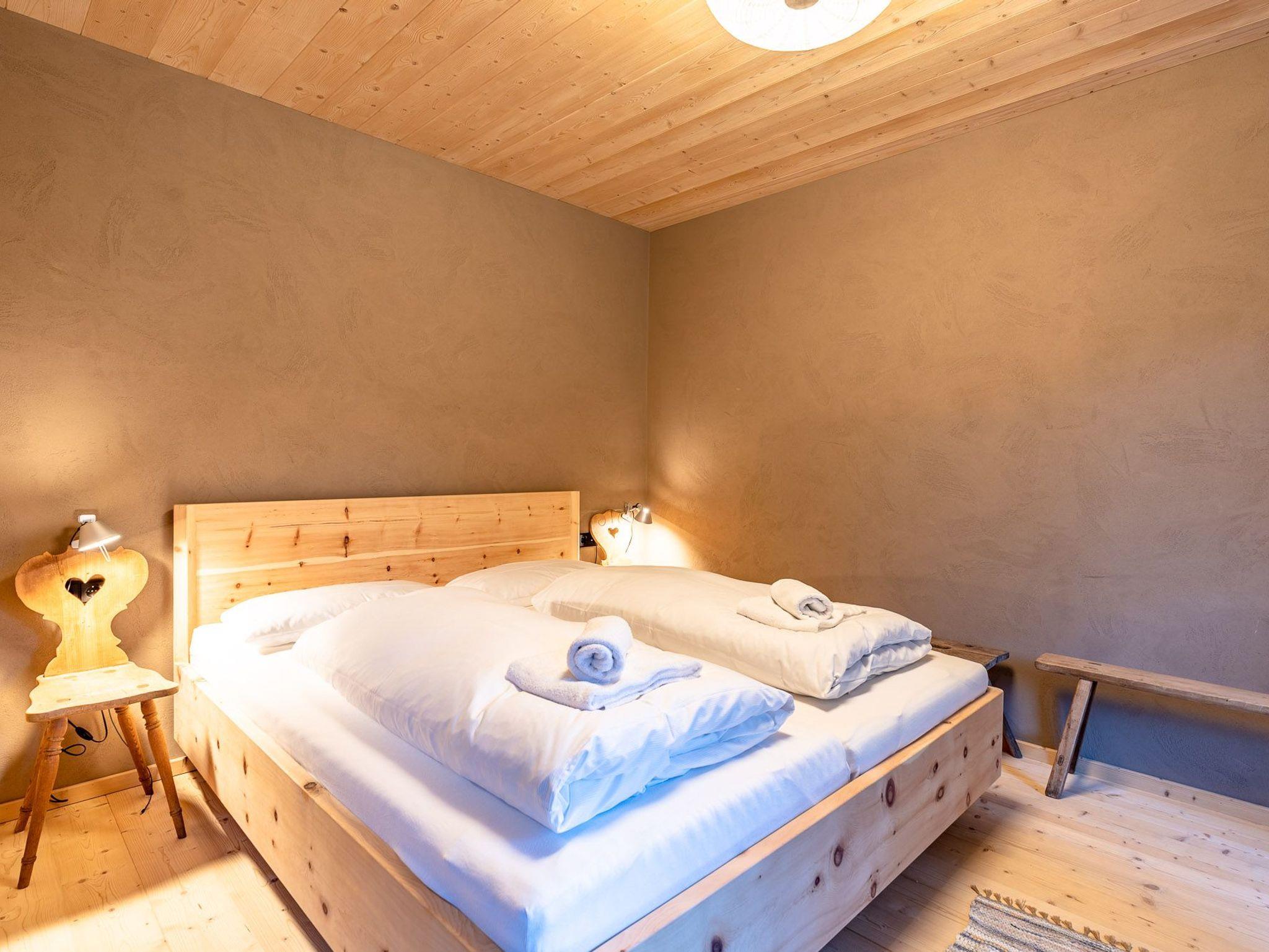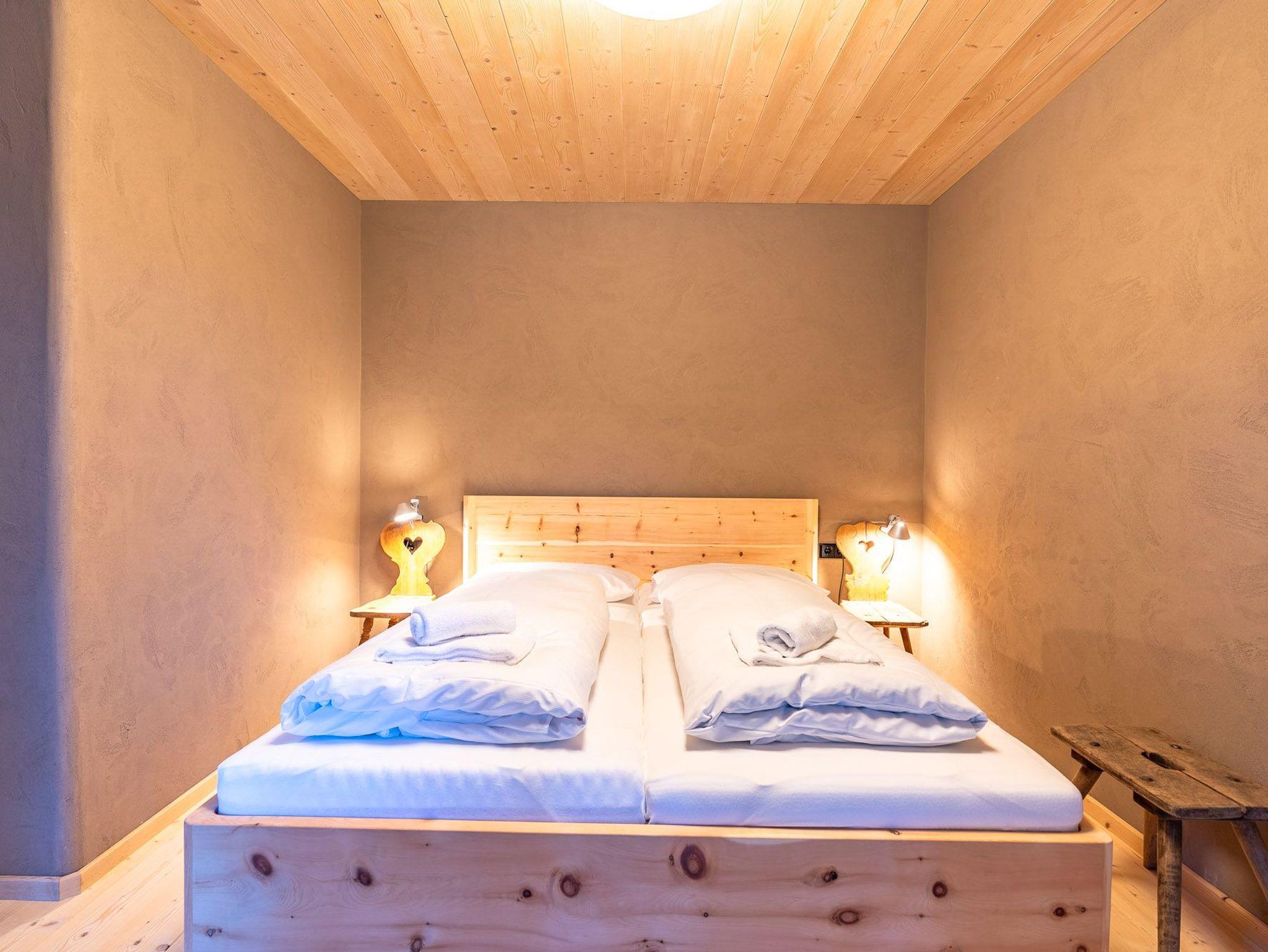 Das 1. Schlafzimmer befindet sich im Untergeschoss. Durch seinen Lehmputz verfügt dieser Raum über ein angenehmes Raumklima und sorgt für einen gesunden Schlaf. Das gemütliche Doppelbett aus Zirbenholz versprüht einen angenehmen Duft nach frischem Holz. Im dazugehörigen Badezimmer stehen Ihnen eine Dusche, WC und ein Doppel-Waschtisch zur Verfügung.