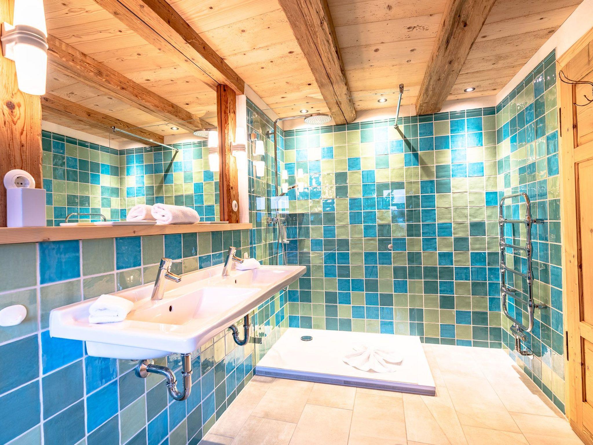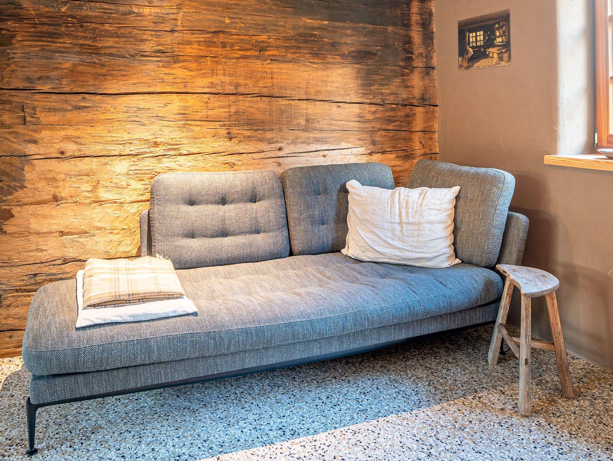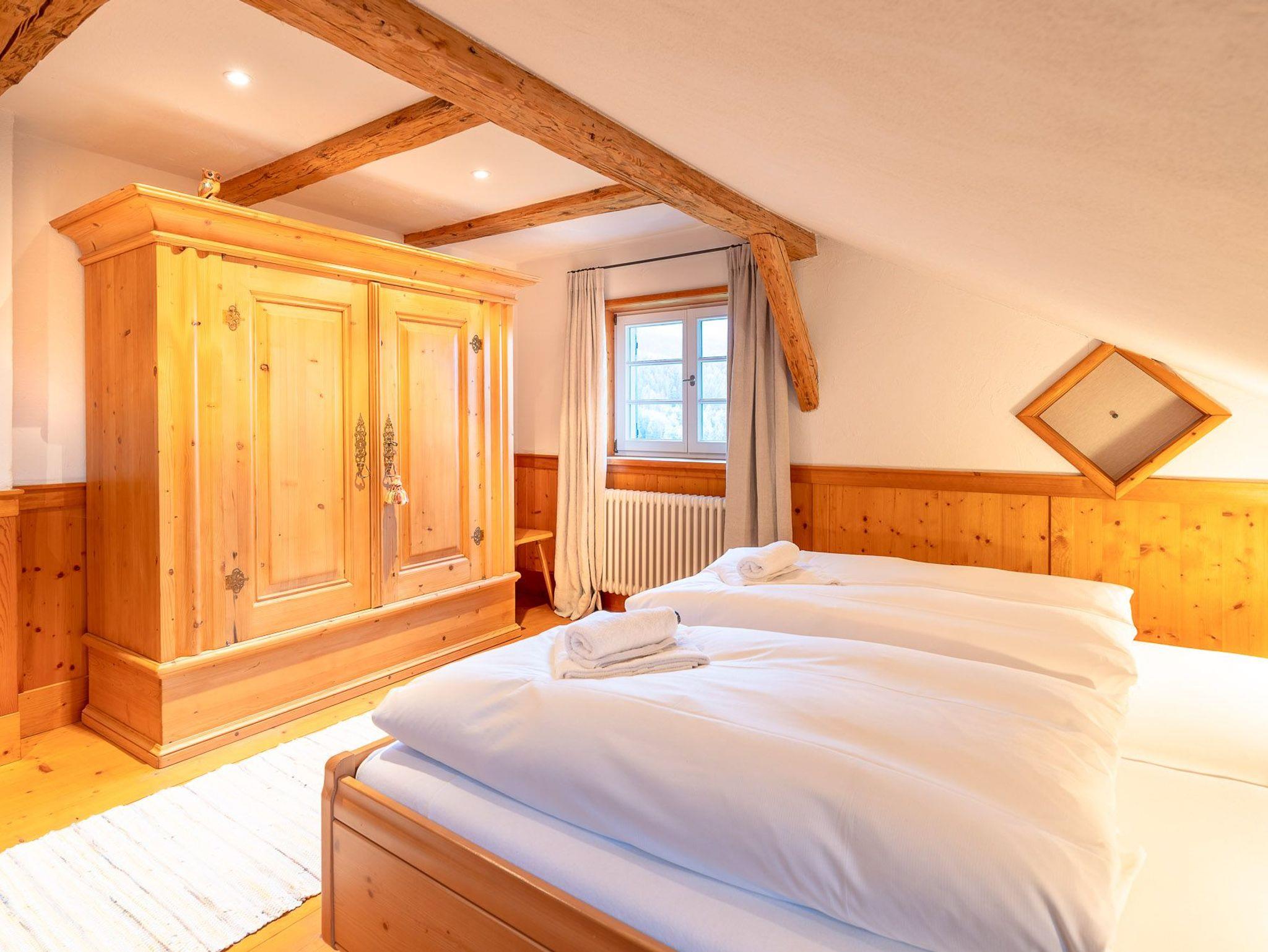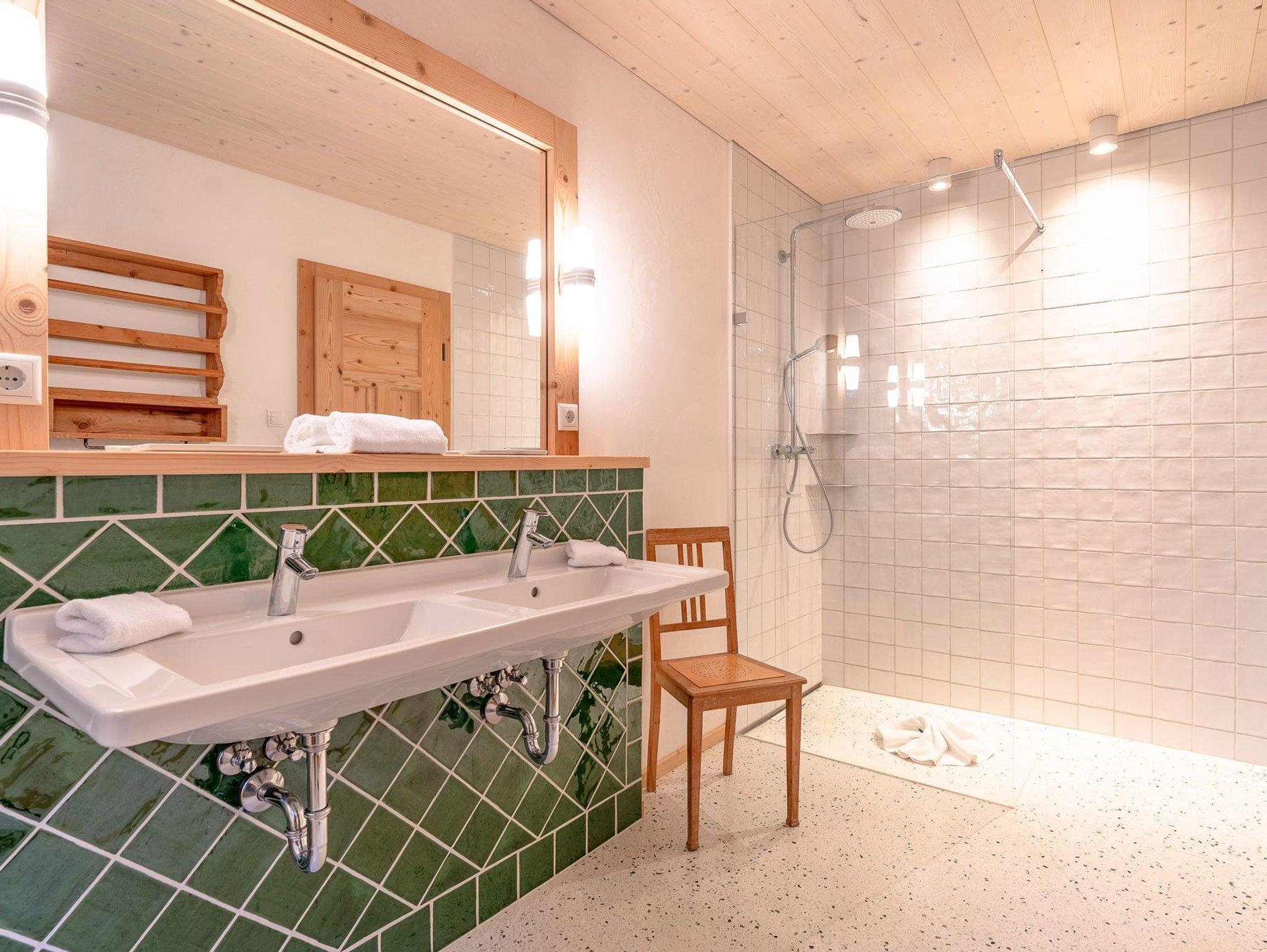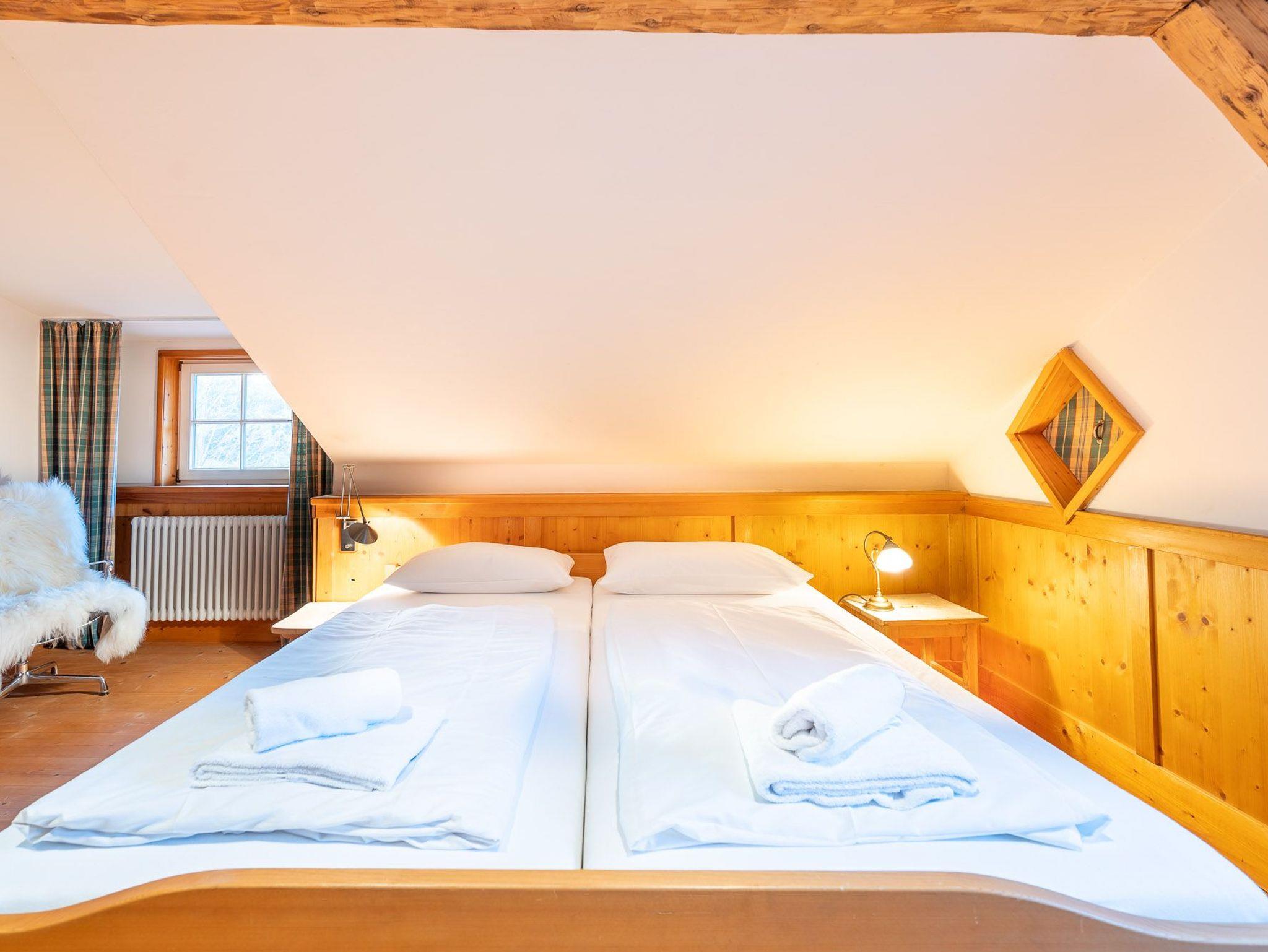 Das 1. Schlafzimmer befindet sich im Untergeschoss. Durch seinen Lehmputz verfügt dieser Raum über ein angenehmes Raumklima und sorgt für einen gesunden Schlaf. Das gemütliche Doppelbett aus Zirbenholz versprüht einen angenehmen Duft nach frischem Holz. Im dazugehörigen Badezimmer stehen Ihnen eine Dusche, WC und ein Doppel-Waschtisch zur Verfügung.