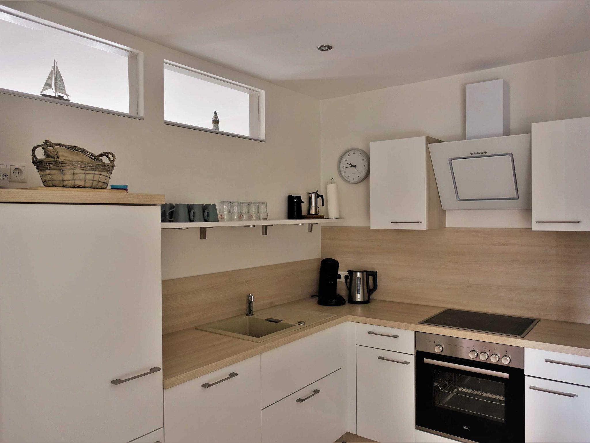 • Einbauküche komplett ausgestattet mit allen Geräten (große Spülmaschine, Cerankochfeld mit Dunstabzugshaube, Backofen, Kühlschrank mit Gefrierfach, Kaffemaschine, Wasserkocher, Toaster, Waffeleisen, Rührgerät …) und reichlich Geschirr und Besteck