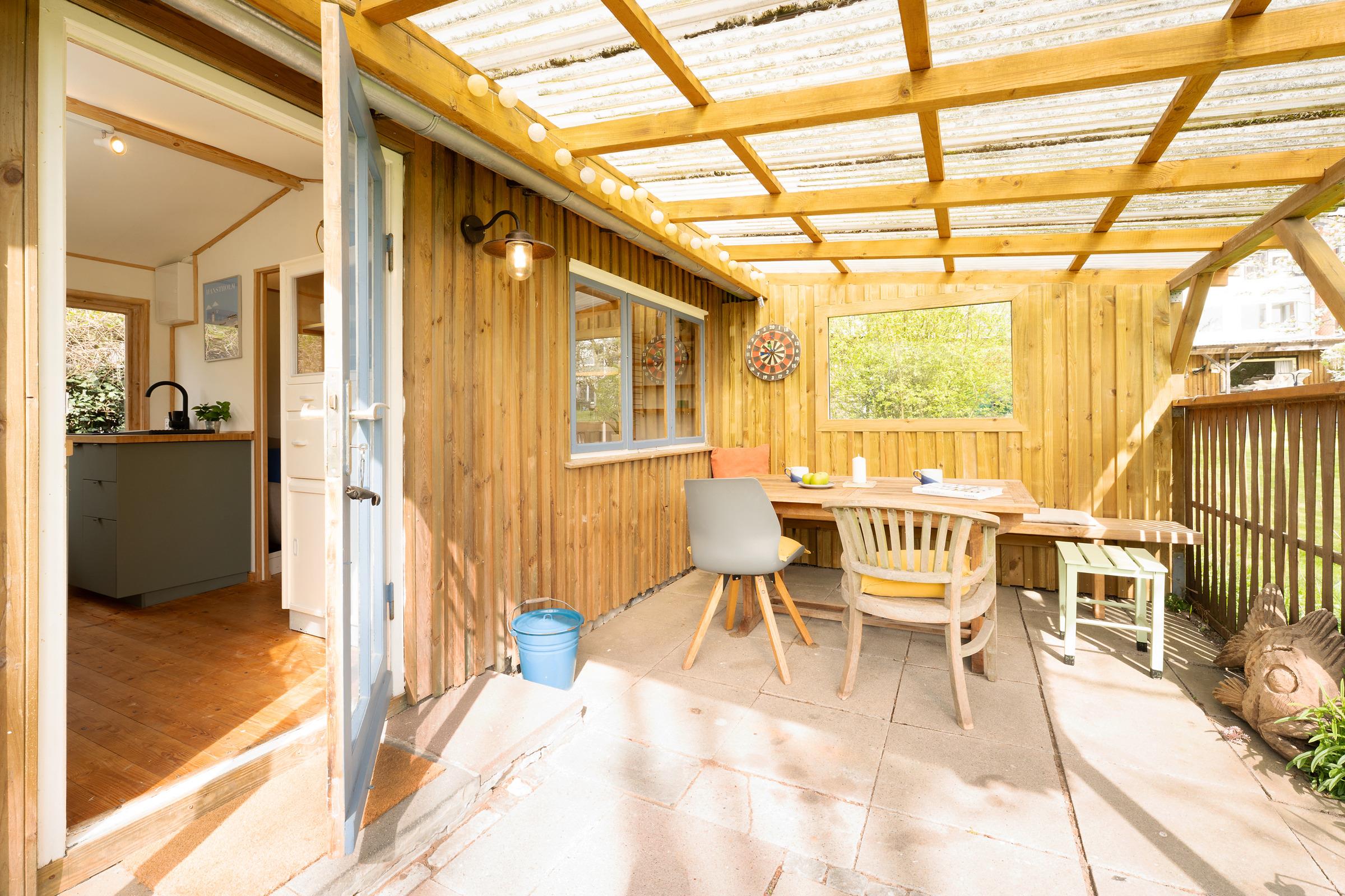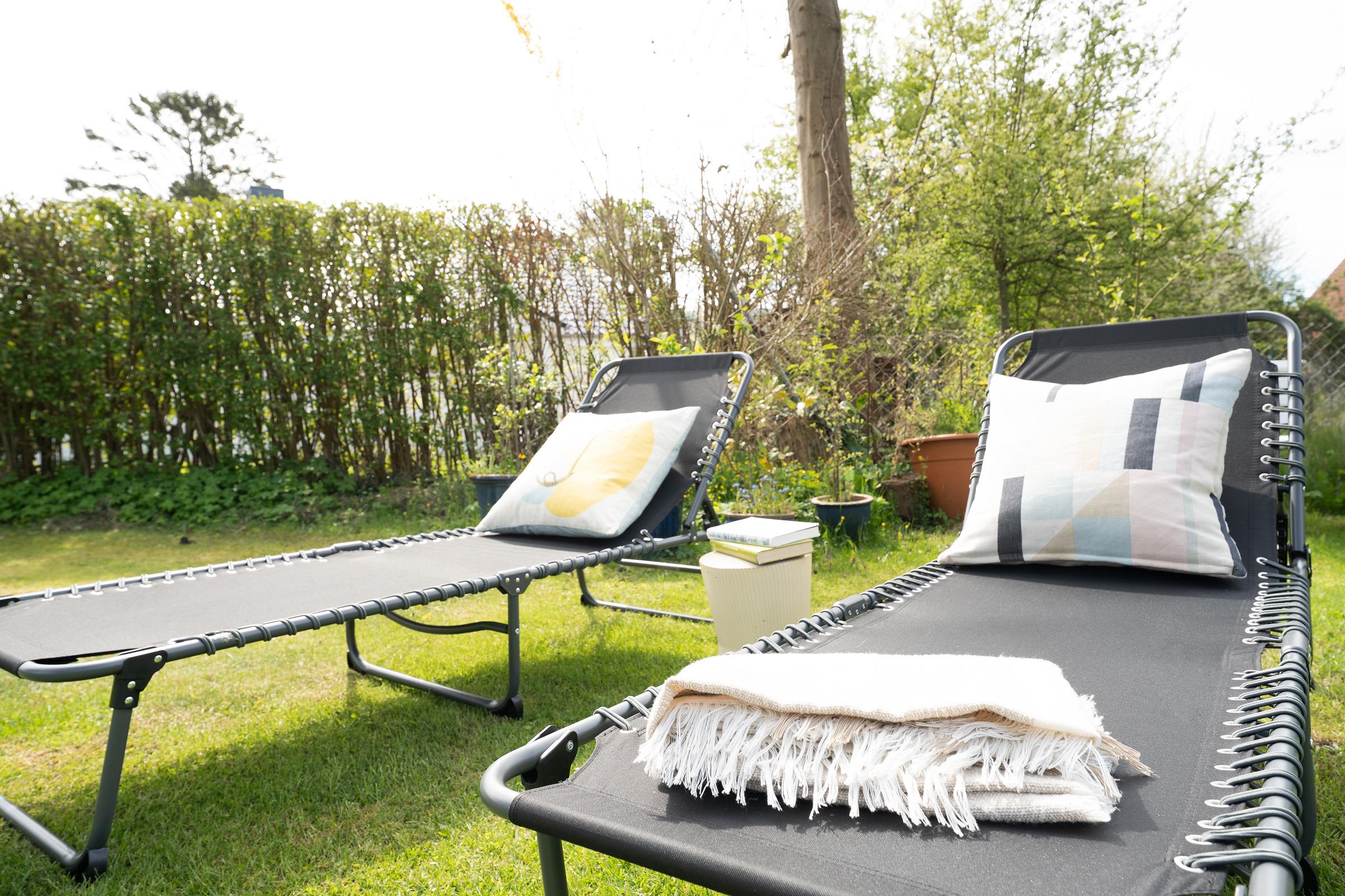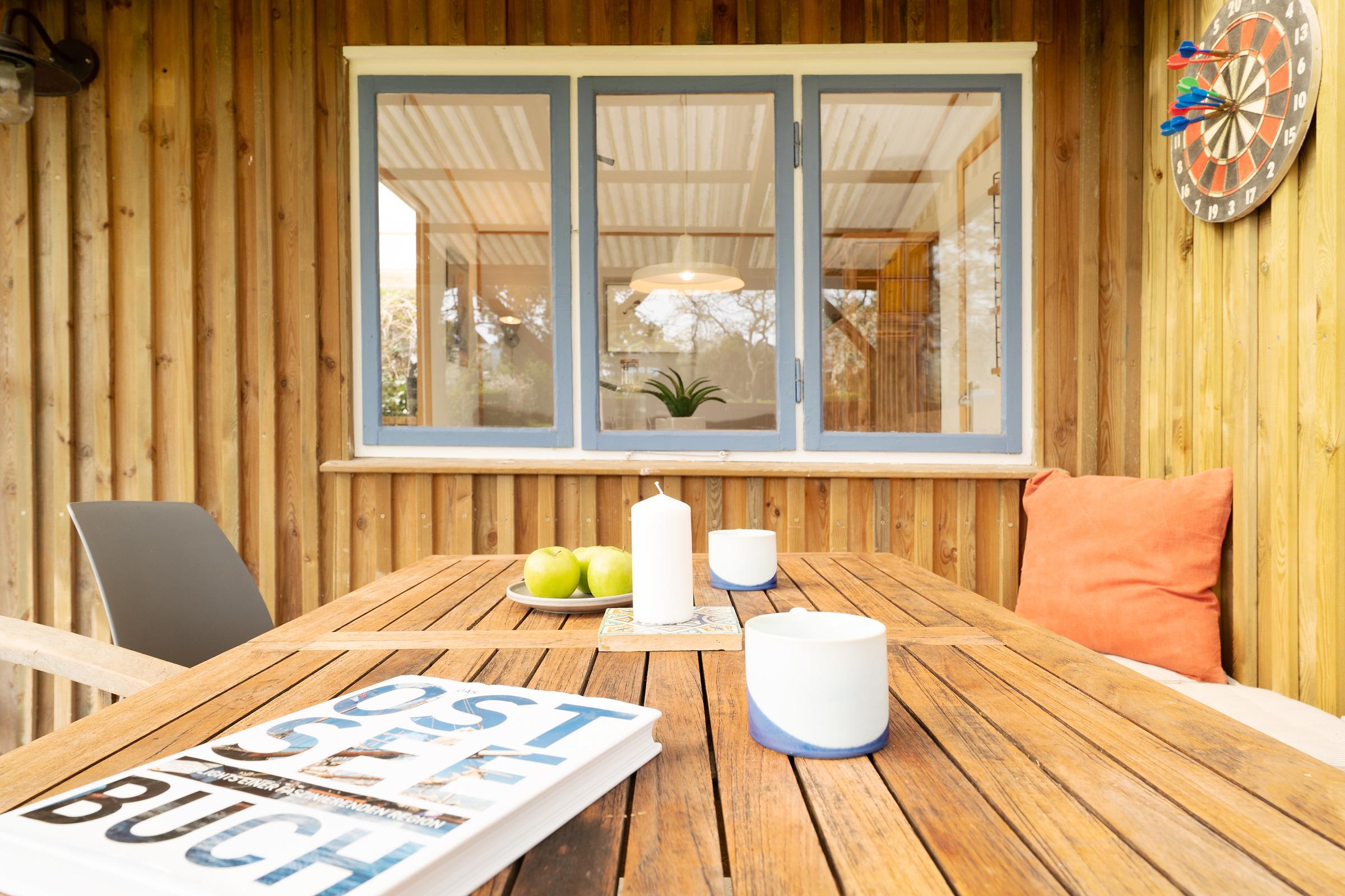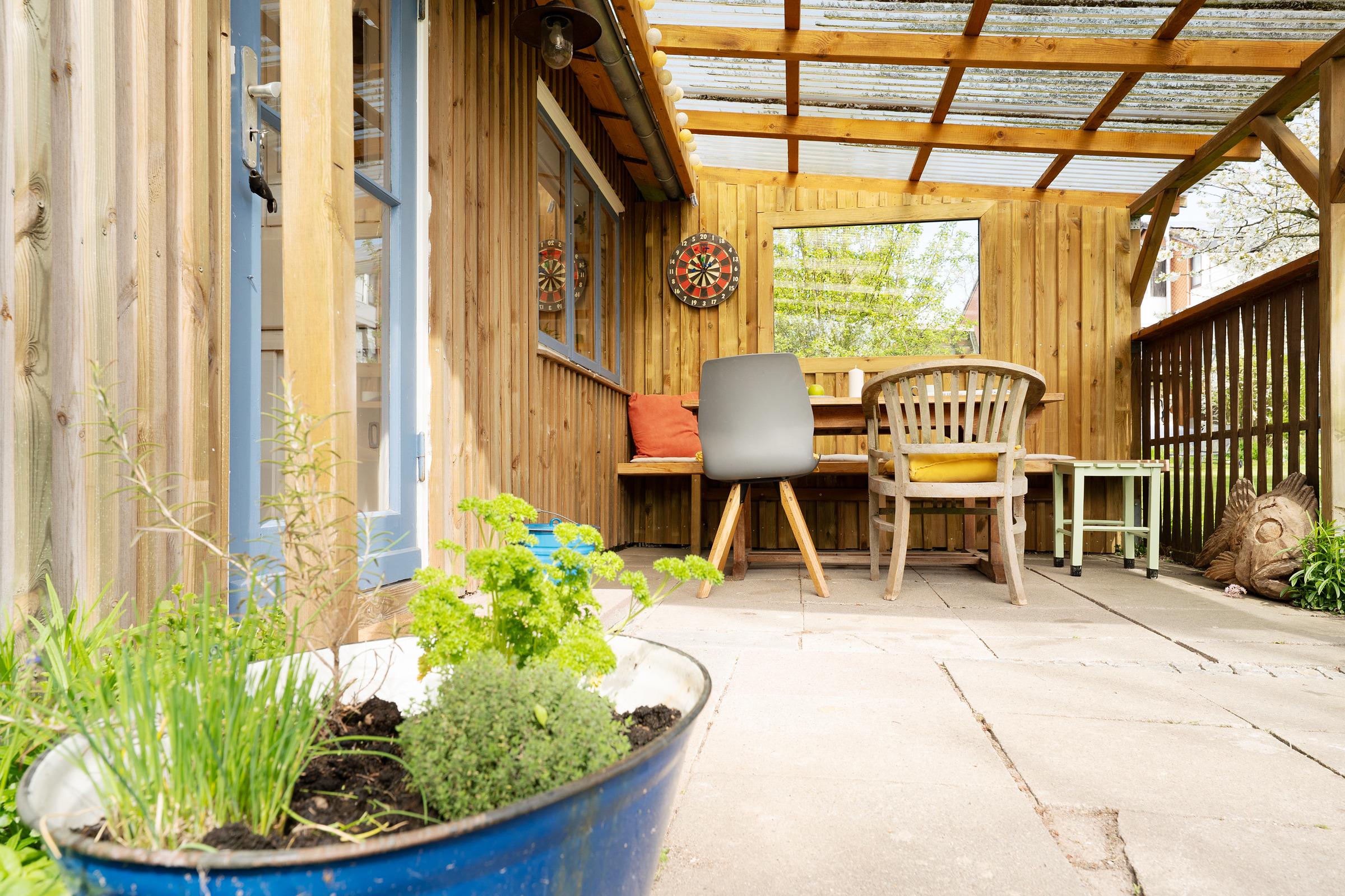 Der Wohnbereich ist funktional gestaltet und bietet eine komfortable Sitzecke für entspannte Abende. Die große Terrasse ist mit Gartenmöbeln ausgestattet – perfekt für ein Frühstück an der frischen Luft. Auch eine Tischtennisplatte steht Ihnen im Gemeinschaftsgarten zur Verfügung.